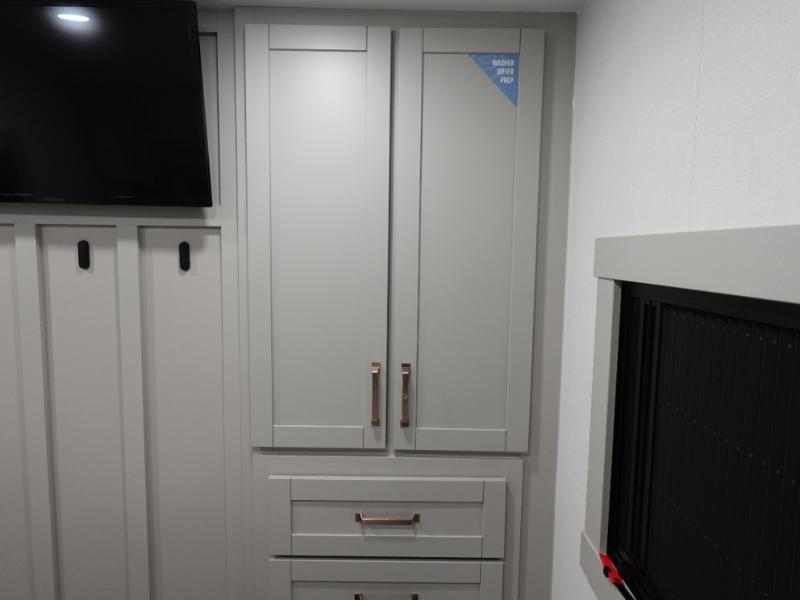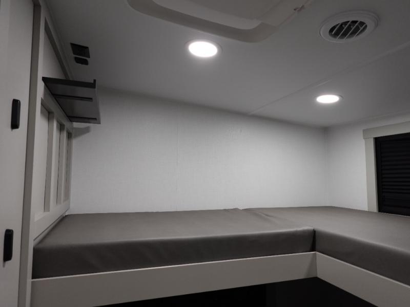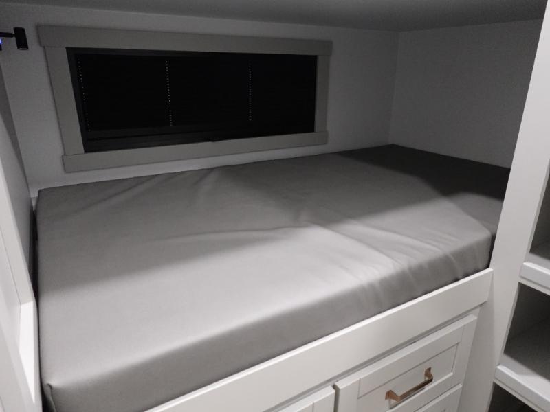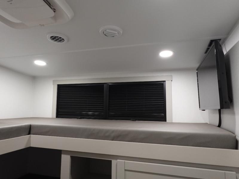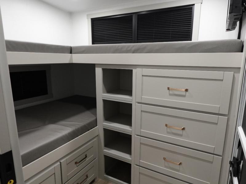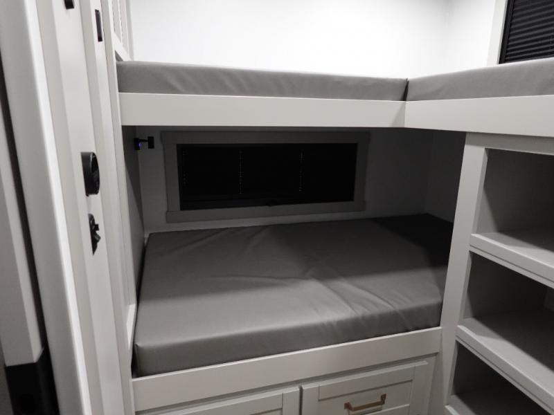 Start living your best camping life in this fifth wheel! The rear bunkhouse has an L shaped 72" x 92" x 32" top bunk above cubbies and a 44" x 72" bottom bunk, plus its very own private entrance/exit door to the unit. Just outside the bunkhouse is the kitchen which has everything you need to prepare your best home cooked meals including a flip-up countertop extension, a trash bin with Stow N' Go paper towel, and an area prepped for a dishwasher. Enjoy your delicious home cooked meals at the sliding dining/desk table then relax on either the 62" theater seating or 64" tri-fold sofa that extends into a 54" x 70" bed for more guests. As you step up the stairs to head up to the full bathroom and front private bedroom, you will notice that they have shoe storage to keep things tidy. Crank up the tunes with the exterior speakers and grab a cold beverage from the exterior refrigerator with storage drawers near it too!