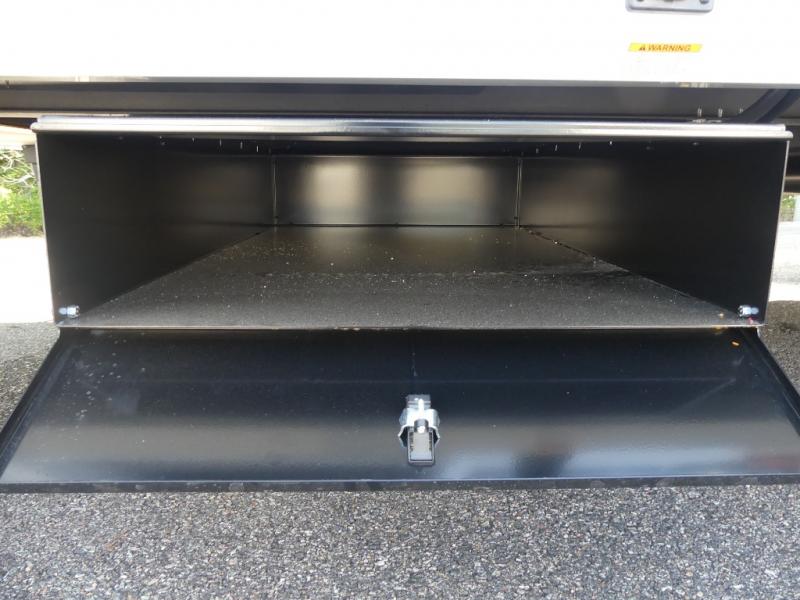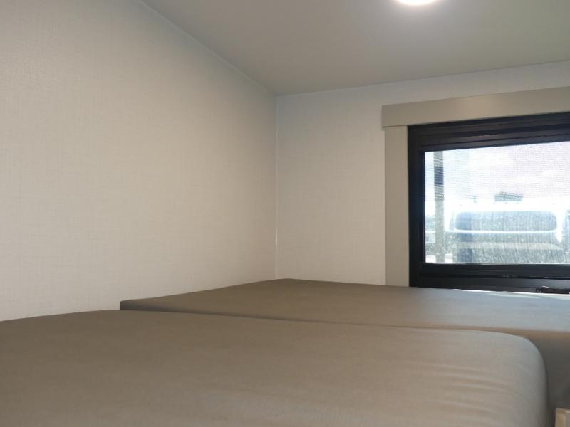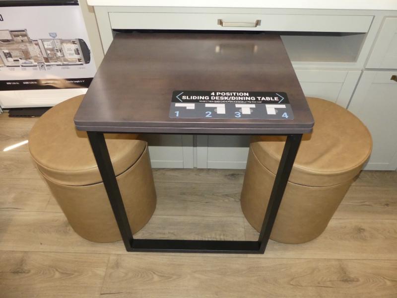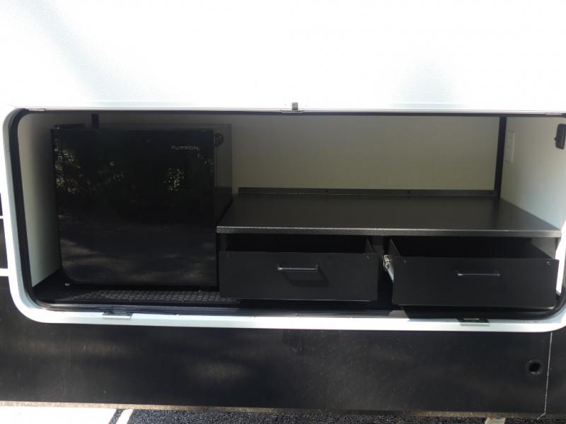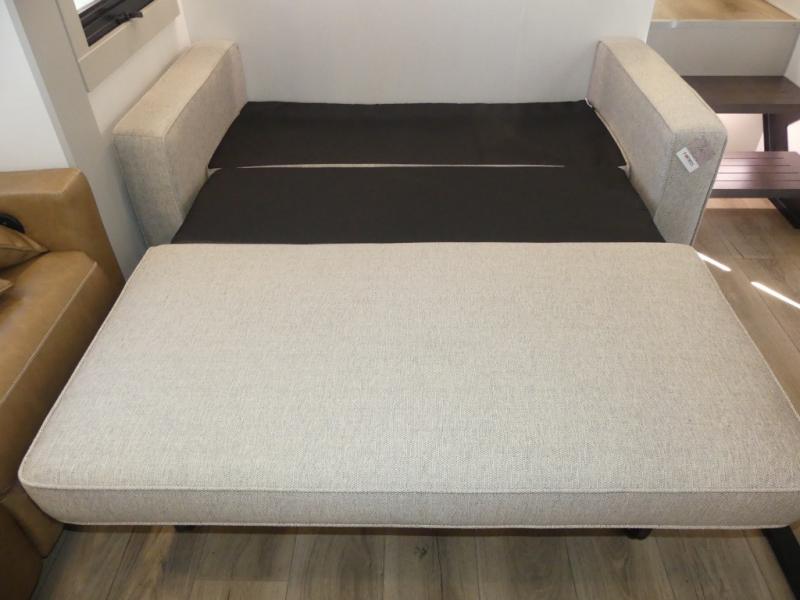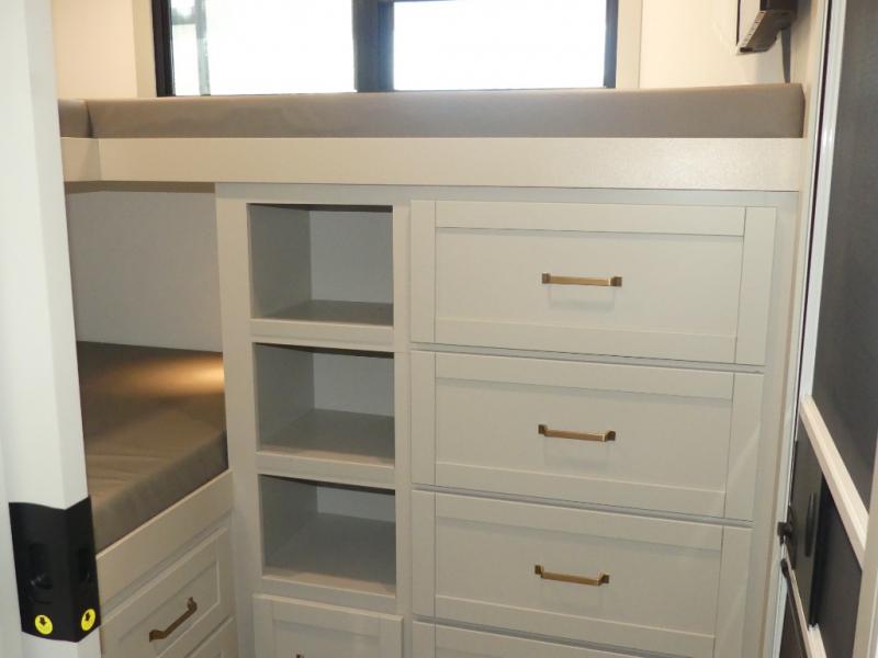 Start living your best camping life in this fifth wheel! The rear bunkhouse has an L shaped 72" x 92" x 32" top bunk above cubbies and a 44" x 72" bottom bunk, plus its very own private entrance/exit door to the unit. Just outside the bunkhouse is the kitchen which has everything you need to prepare your best home cooked meals including a flip-up countertop extension, a trash bin with Stow N' Go paper towel, and an area prepped for a dishwasher. Enjoy your delicious home cooked meals at the sliding dining/desk table then relax on either the 62" theater seating or 64" tri-fold sofa that extends into a 54" x 70" bed for more guests. As you step up the stairs to head up to the full bathroom and front private bedroom, you will notice that they have shoe storage to keep things tidy. Crank up the tunes with the exterior speakers and grab a cold beverage from the exterior refrigerator with storage drawers near it too!