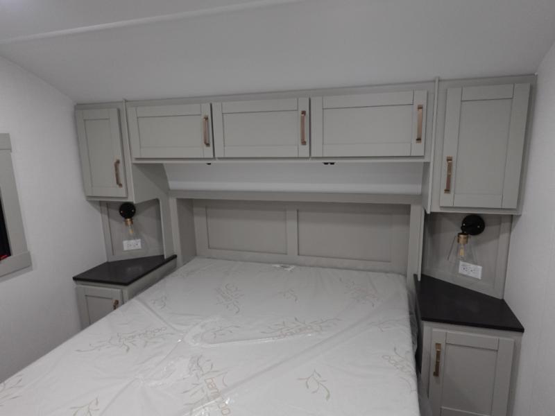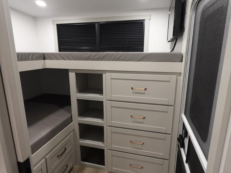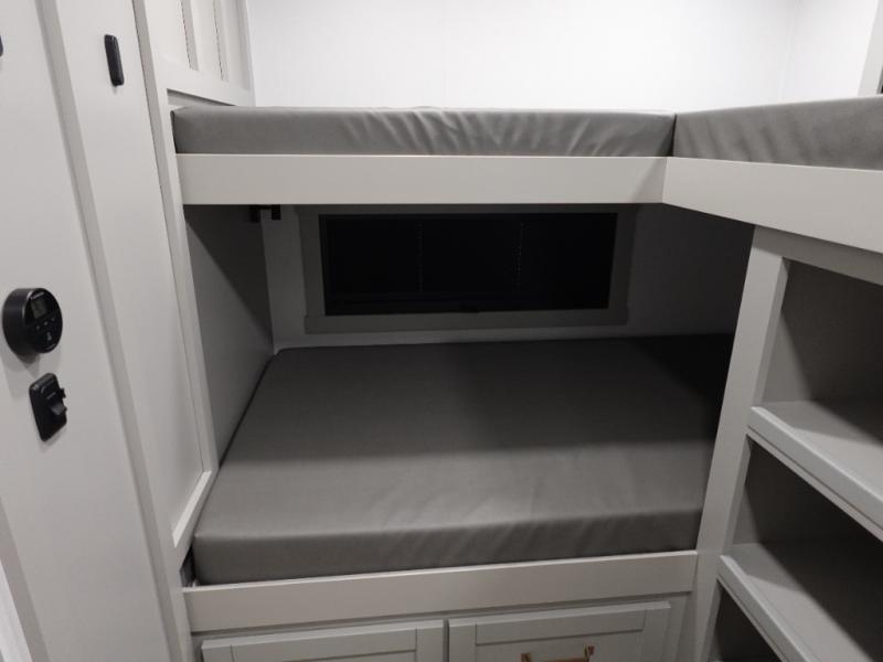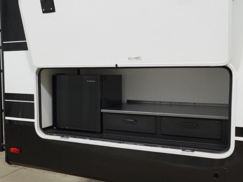 Start living your best camping life in this fifth wheel! The rear bunkhouse has an L shaped 72" x 92" x 32" top bunk above cubbies and a 44" x 72" bottom bunk, plus its very own private entrance/exit door to the unit. Just outside the bunkhouse is the kitchen which has everything you need to prepare your best home cooked meals including a flip-up countertop extension, a trash bin with Stow N' Go paper towel, and an area prepped for a dishwasher. Enjoy your delicious home cooked meals at the sliding dining/desk table then relax on either the 62" theater seating or 64" tri-fold sofa that extends into a 54" x 70" bed for more guests. As you step up the stairs to head up to the full bathroom and front private bedroom, you will notice that they have shoe storage to keep things tidy. Crank up the tunes with the exterior speakers and grab a cold beverage from the exterior refrigerator with storage drawers near it too!