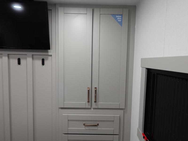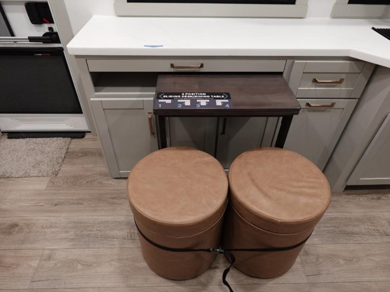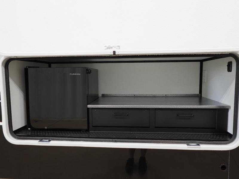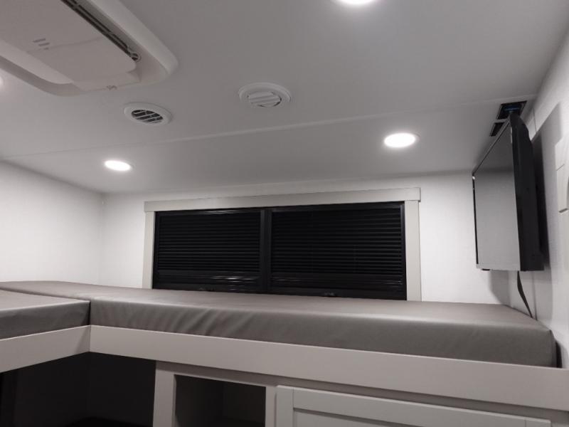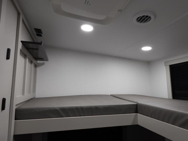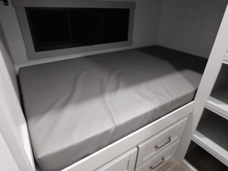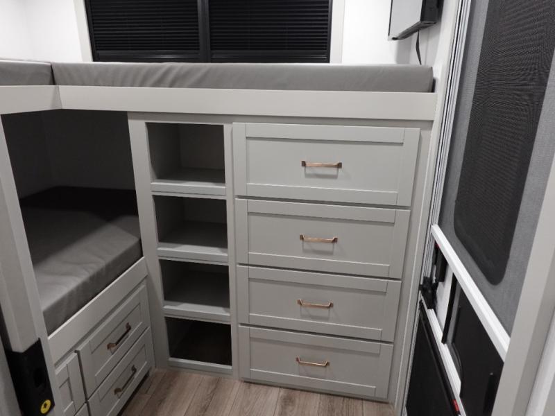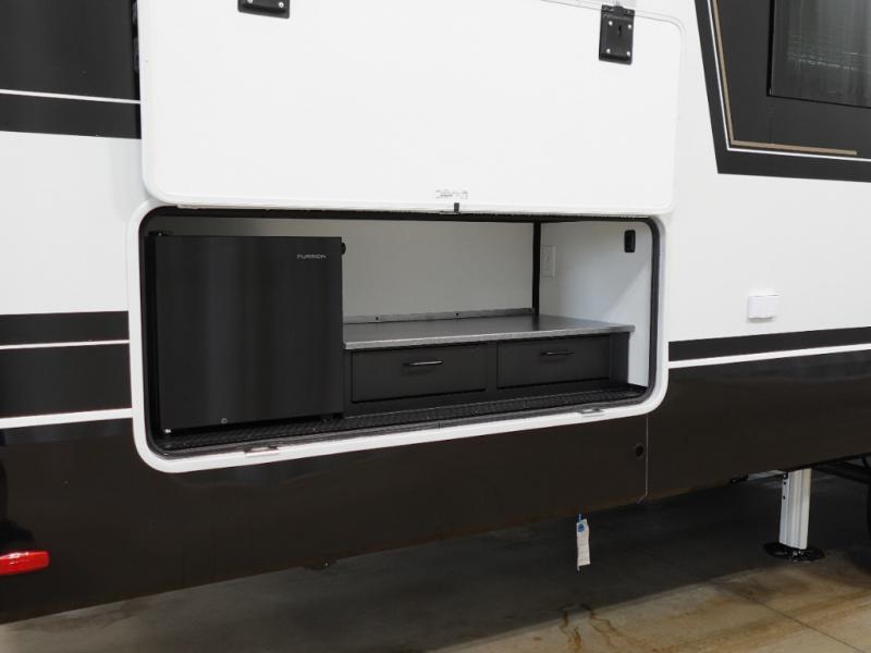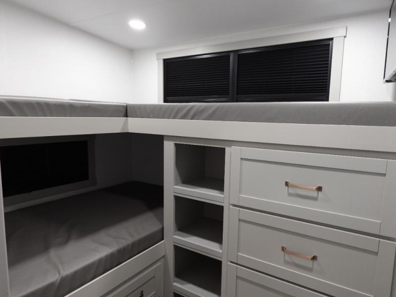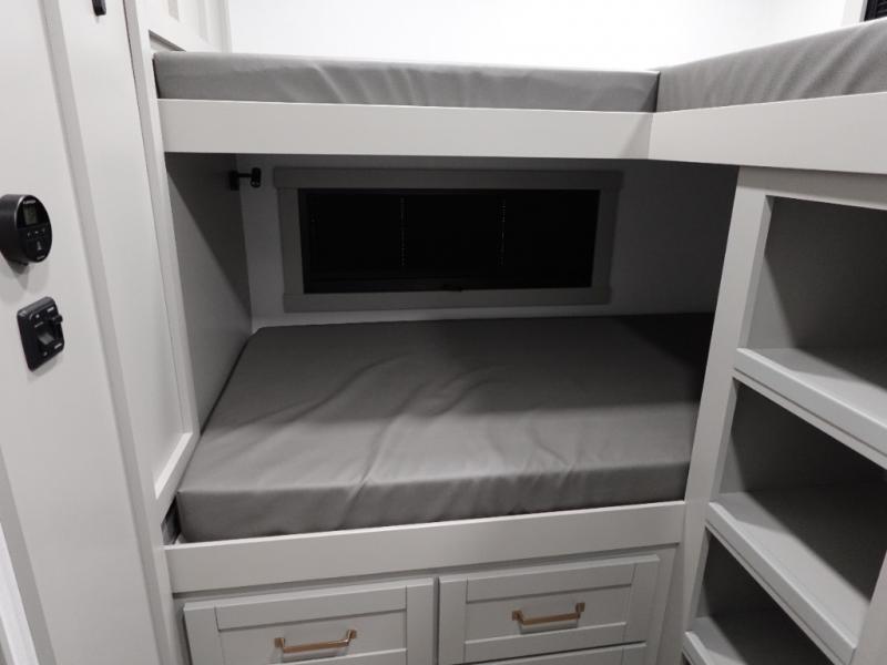 Start living your best camping life in this fifth wheel! The rear bunkhouse has an L shaped 72" x 92" x 32" top bunk above cubbies and a 44" x 72" bottom bunk, plus its very own private entrance/exit door to the unit. Just outside the bunkhouse is the kitchen which has everything you need to prepare your best home cooked meals including a flip-up countertop extension, a trash bin with Stow N' Go paper towel, and an area prepped for a dishwasher. Enjoy your delicious home cooked meals at the sliding dining/desk table then relax on either the 62" theater seating or 64" tri-fold sofa that extends into a 54" x 70" bed for more guests. As you step up the stairs to head up to the full bathroom and front private bedroom, you will notice that they have shoe storage to keep things tidy. Crank up the tunes with the exterior speakers and grab a cold beverage from the exterior refrigerator with storage drawers near it too!
