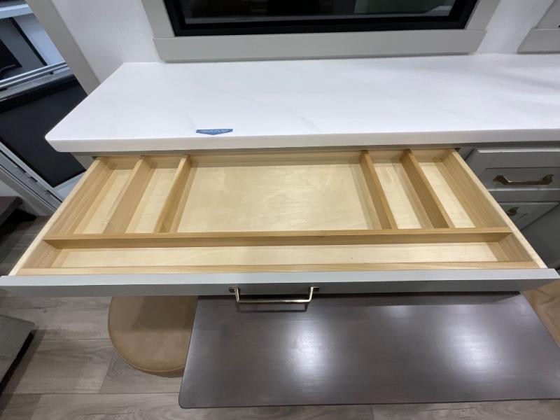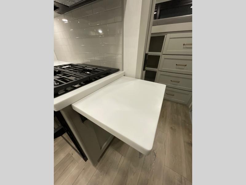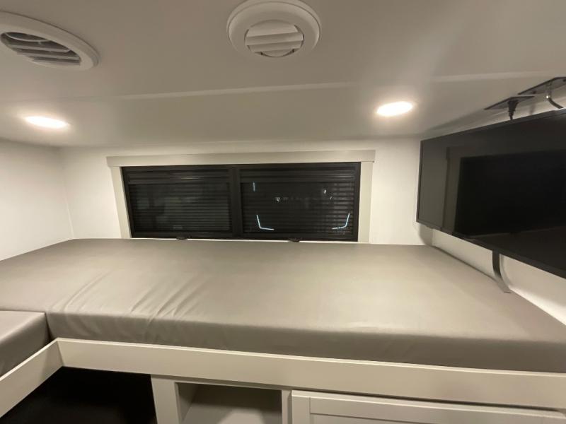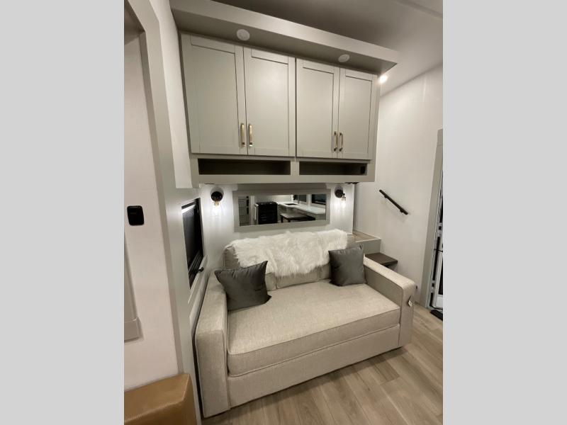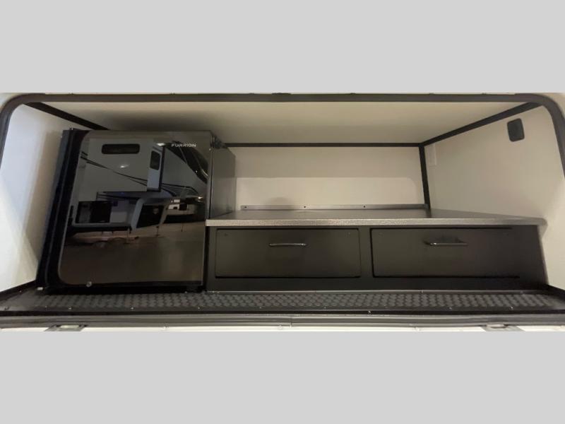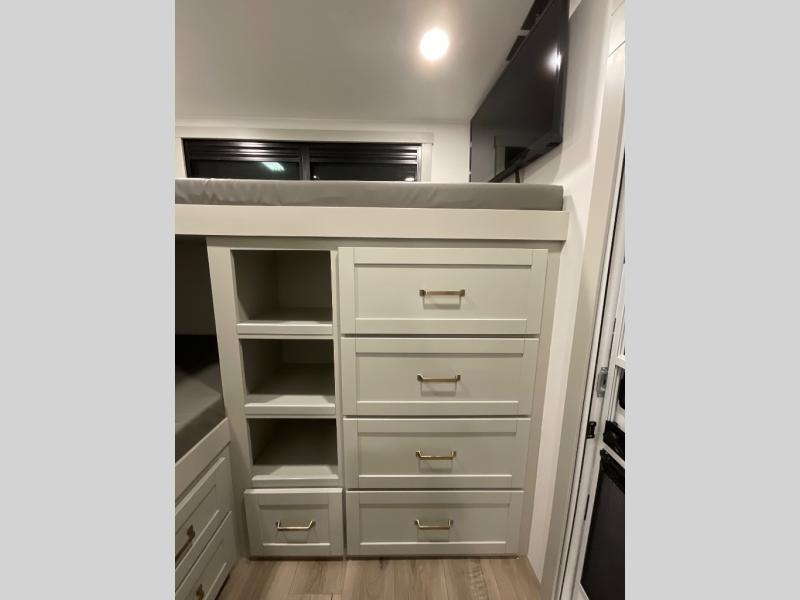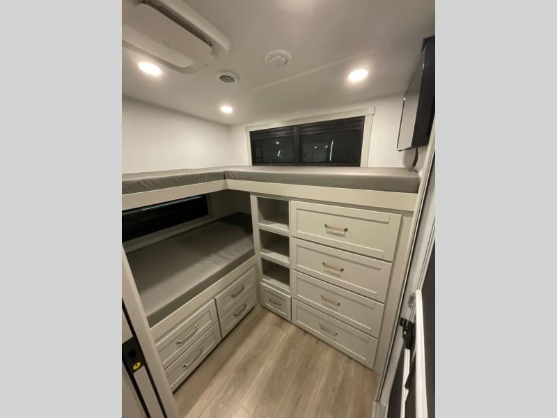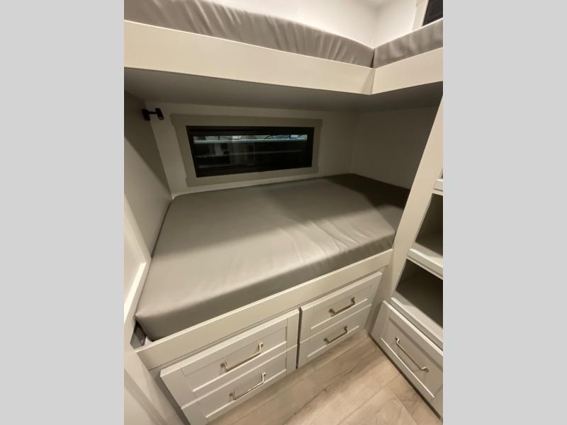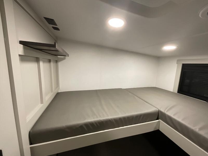 Start living your best camping life in this fifth wheel! The rear bunkhouse has an L shaped 72" x 92" x 32" top bunk above cubbies and a 44" x 72" bottom bunk, plus its very own private entrance/exit door to the unit. Just outside the bunkhouse is the kitchen which has everything you need to prepare your best home cooked meals including a flip-up countertop extension, a trash bin with Stow N' Go paper towel, and an area prepped for a dishwasher. Enjoy your delicious home cooked meals at the sliding dining/desk table then relax on either the 62" theater seating or 64" tri-fold sofa that extends into a 54" x 70" bed for more guests. As you step up the stairs to head up to the full bathroom and front private bedroom, you will notice that they have shoe storage to keep things tidy. Crank up the tunes with the exterior speakers and grab a cold beverage from the exterior refrigerator with storage drawers near it too!