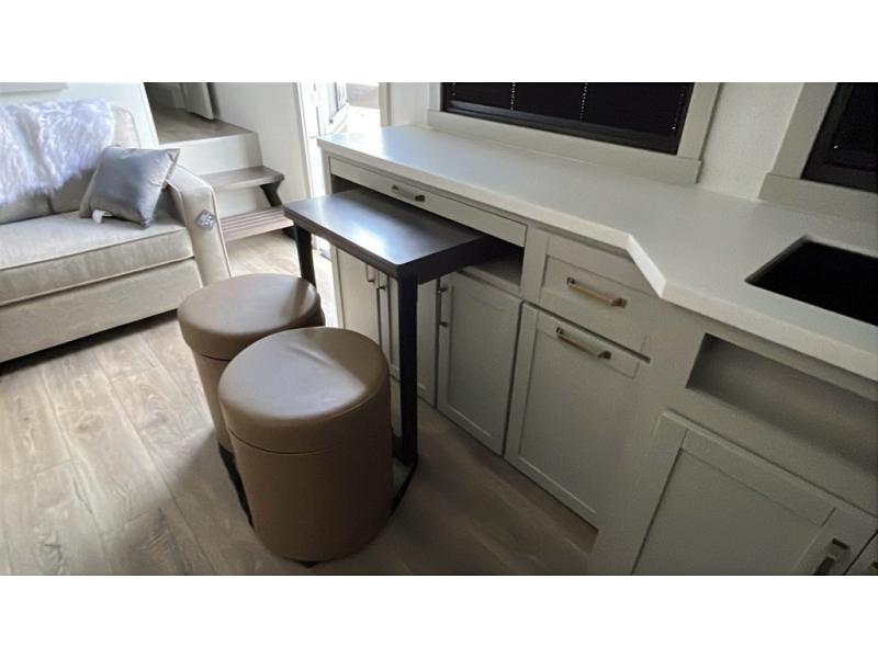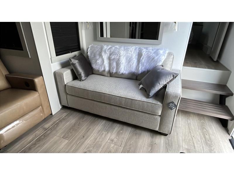 Start living your best camping life in this fifth wheel! The rear bunkhouse has an L shaped 72" x 92" x 32" top bunk above cubbies and a 44" x 72" bottom bunk, plus its very own private entrance/exit door to the unit. Just outside the bunkhouse is the kitchen which has everything you need to prepare your best home cooked meals including a flip-up countertop extension, a trash bin with Stow N' Go paper towel, and an area prepped for a dishwasher. Enjoy your delicious home cooked meals at the sliding dining/desk table then relax on either the 62" theater seating or 64" tri-fold sofa that extends into a 54" x 70" bed for more guests. As you step up the stairs to head up to the full bathroom and front private bedroom, you will notice that they have shoe storage to keep things tidy. Crank up the tunes with the exterior speakers and grab a cold beverage from the exterior refrigerator with storage drawers near it too!