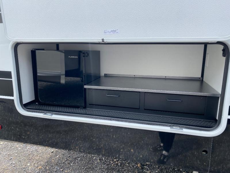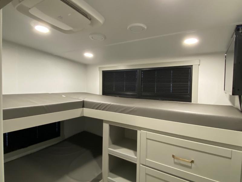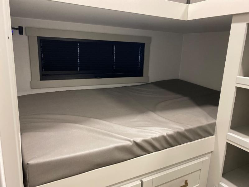 Start living your best camping life in this fifth wheel! The rear bunkhouse has an L shaped 72" x 92" x 32" top bunk above cubbies and a 44" x 72" bottom bunk, plus its very own private entrance/exit door to the unit. Just outside the bunkhouse is the kitchen which has everything you need to prepare your best home cooked meals including a flip-up countertop extension, a trash bin with Stow N' Go paper towel, and an area prepped for a dishwasher. Enjoy your delicious home cooked meals at the sliding dining/desk table then relax on either the 62" theater seating or 64" tri-fold sofa that extends into a 54" x 70" bed for more guests. As you step up the stairs to head up to the full bathroom and front private bedroom, you will notice that they have shoe storage to keep things tidy. Crank up the tunes with the exterior speakers and grab a cold beverage from the exterior refrigerator with storage drawers near it too!