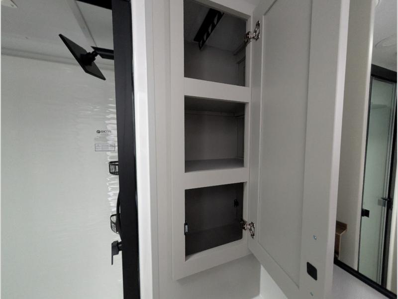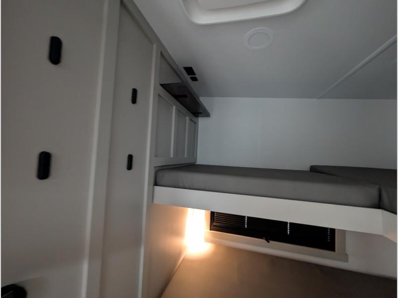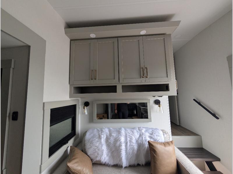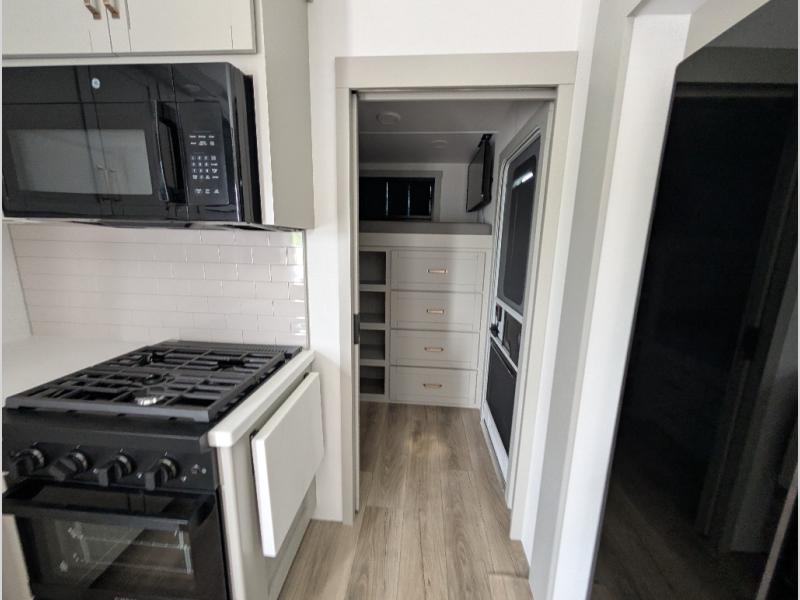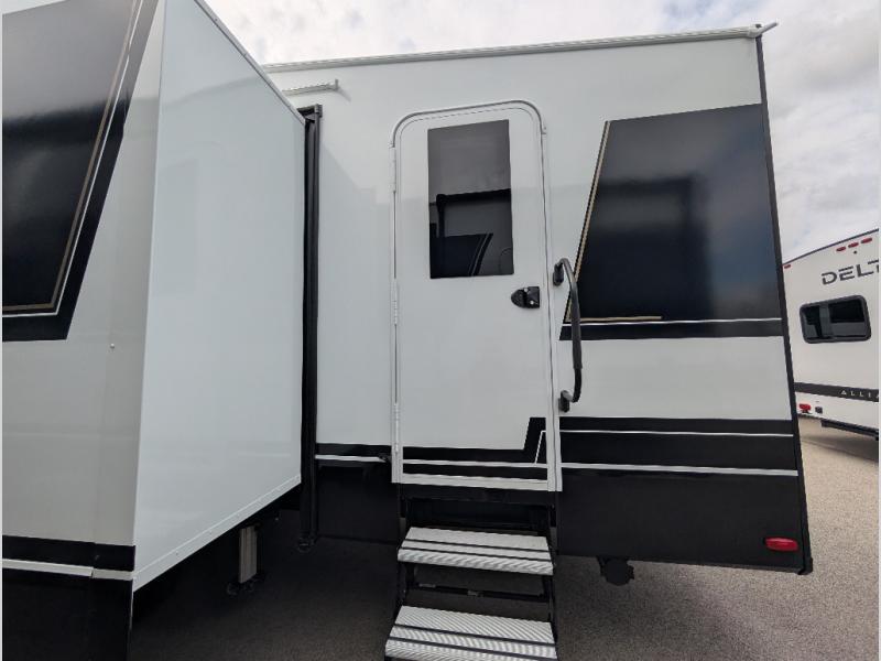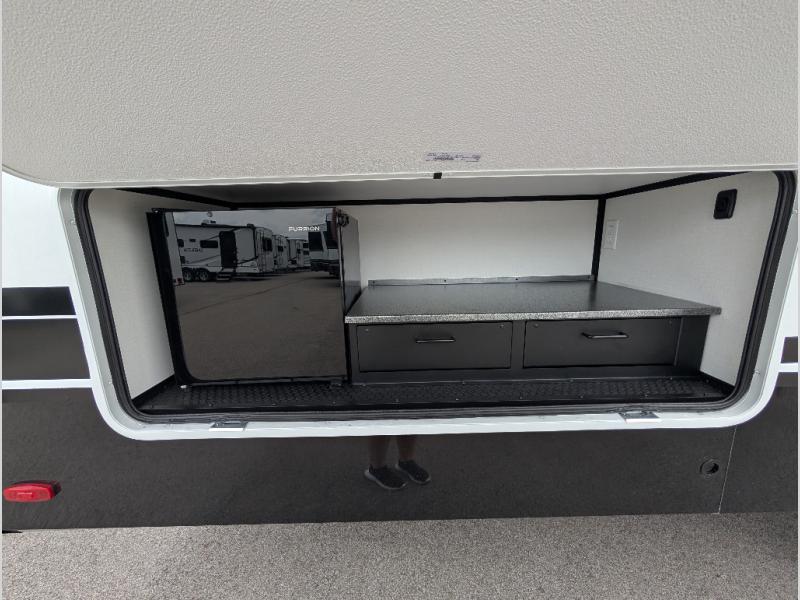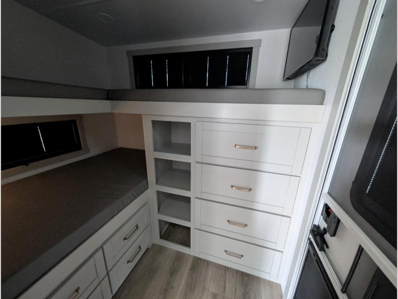 Start living your best camping life in this fifth wheel! The rear bunkhouse has an L shaped 72" x 92" x 32" top bunk above cubbies and a 44" x 72" bottom bunk, plus its very own private entrance/exit door to the unit. Just outside the bunkhouse is the kitchen which has everything you need to prepare your best home cooked meals including a flip-up countertop extension, a trash bin with Stow N' Go paper towel, and an area prepped for a dishwasher. Enjoy your delicious home cooked meals at the sliding dining/desk table then relax on either the 62" theater seating or 64" tri-fold sofa that extends into a 54" x 70" bed for more guests. As you step up the stairs to head up to the full bathroom and front private bedroom, you will notice that they have shoe storage to keep things tidy. Crank up the tunes with the exterior speakers and grab a cold beverage from the exterior refrigerator with storage drawers near it too!