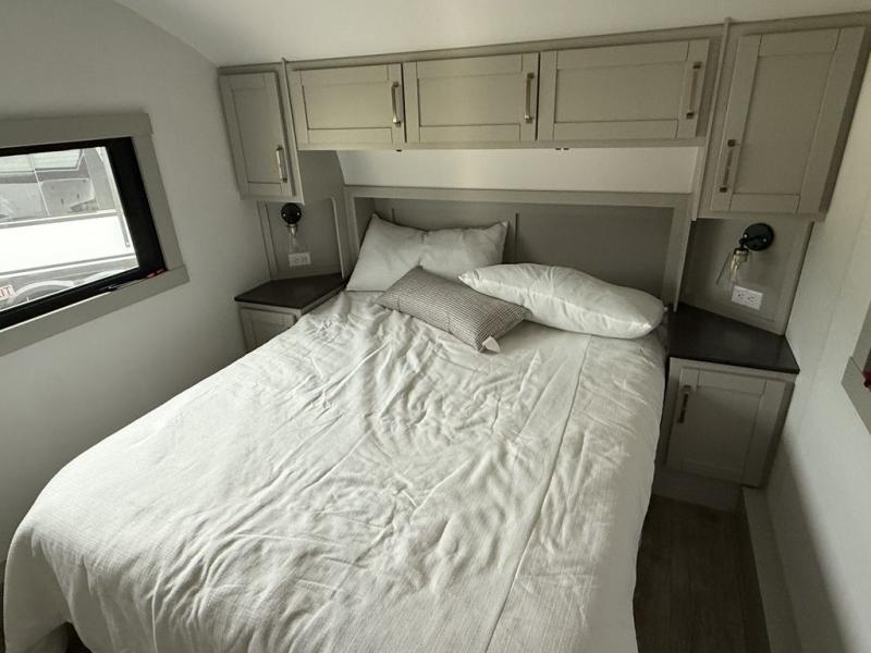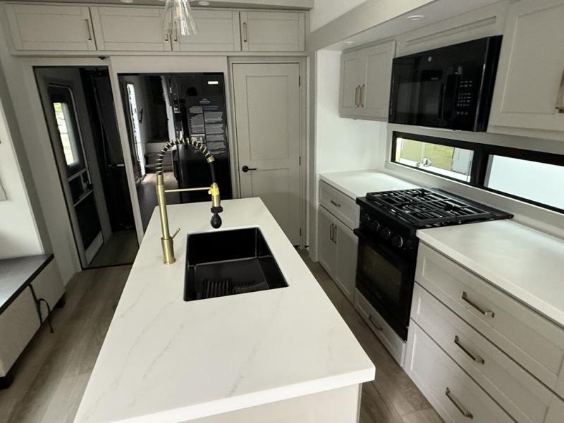 Start living your best camping life in this fifth wheel! The rear bunkhouse has an L shaped 72" x 92" x 32" top bunk above cubbies and a 44" x 72" bottom bunk, plus its very own private entrance/exit door to the unit. Just outside the bunkhouse is the kitchen which has everything you need to prepare your best home cooked meals including a flip-up countertop extension, a trash bin with Stow N' Go paper towel, and an area prepped for a dishwasher. Enjoy your delicious home cooked meals at the sliding dining/desk table then relax on either the 62" theater seating or 64" tri-fold sofa that extends into a 54" x 70" bed for more guests. As you step up the stairs to head up to the full bathroom and front private bedroom, you will notice that they have shoe storage to keep things tidy. Crank up the tunes with the exterior speakers and grab a cold beverage from the exterior refrigerator with storage drawers near it too!