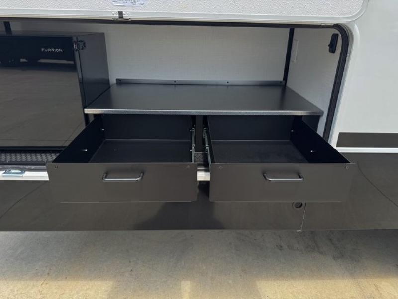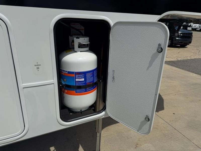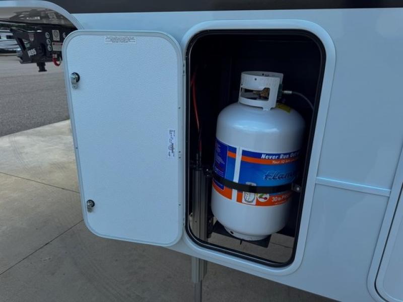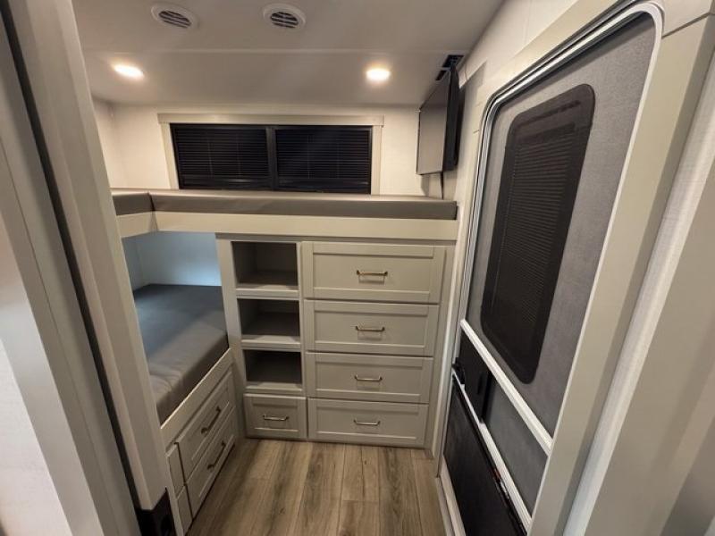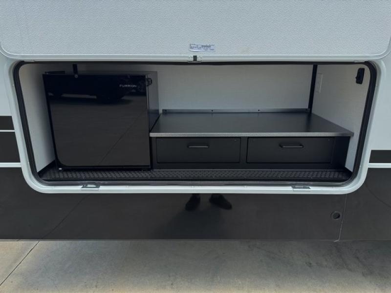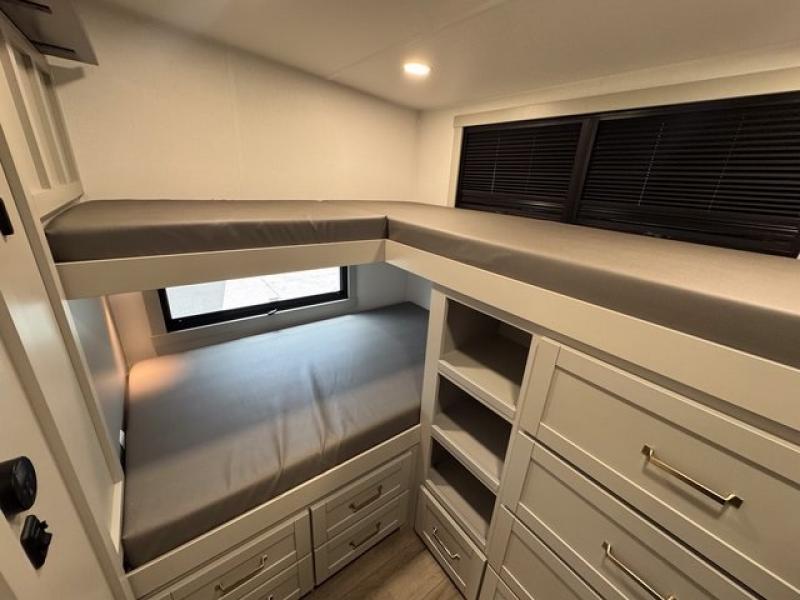 Start living your best camping life in this fifth wheel! The rear bunkhouse has an L shaped 72" x 92" x 32" top bunk above cubbies and a 44" x 72" bottom bunk, plus its very own private entrance/exit door to the unit. Just outside the bunkhouse is the kitchen which has everything you need to prepare your best home cooked meals including a flip-up countertop extension, a trash bin with Stow N' Go paper towel, and an area prepped for a dishwasher. Enjoy your delicious home cooked meals at the sliding dining/desk table then relax on either the 62" theater seating or 64" tri-fold sofa that extends into a 54" x 70" bed for more guests. As you step up the stairs to head up to the full bathroom and front private bedroom, you will notice that they have shoe storage to keep things tidy. Crank up the tunes with the exterior speakers and grab a cold beverage from the exterior refrigerator with storage drawers near it too!