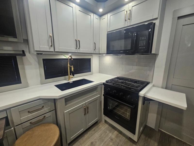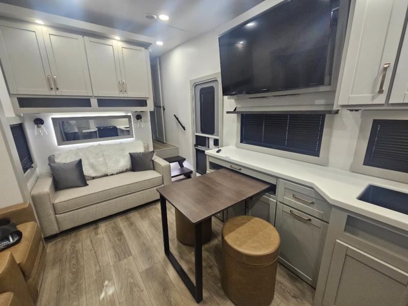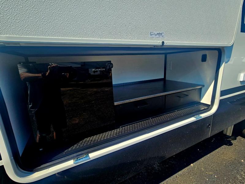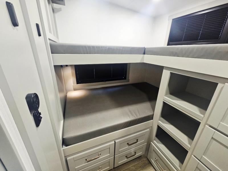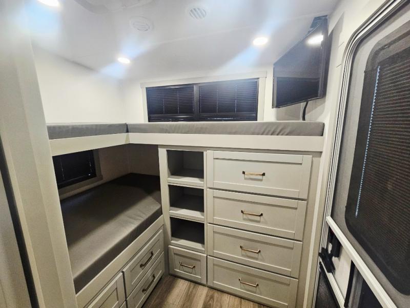 Start living your best camping life in this fifth wheel! The rear bunkhouse has an L shaped 72" x 92" x 32" top bunk above cubbies and a 44" x 72" bottom bunk, plus its very own private entrance/exit door to the unit. Just outside the bunkhouse is the kitchen which has everything you need to prepare your best home cooked meals including a flip-up countertop extension, a trash bin with Stow N' Go paper towel, and an area prepped for a dishwasher. Enjoy your delicious home cooked meals at the sliding dining/desk table then relax on either the 62" theater seating or 64" tri-fold sofa that extends into a 54" x 70" bed for more guests. As you step up the stairs to head up to the full bathroom and front private bedroom, you will notice that they have shoe storage to keep things tidy. Crank up the tunes with the exterior speakers and grab a cold beverage from the exterior refrigerator with storage drawers near it too!