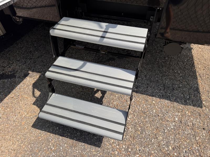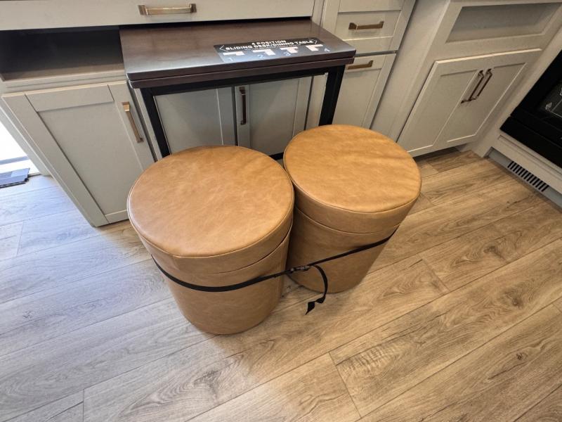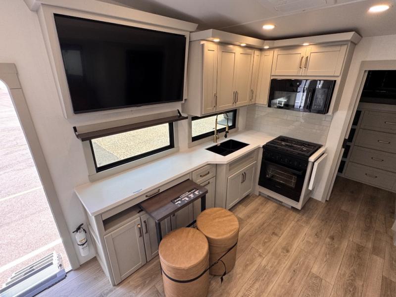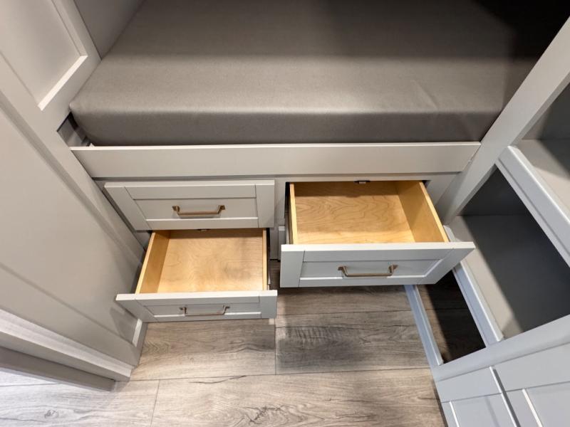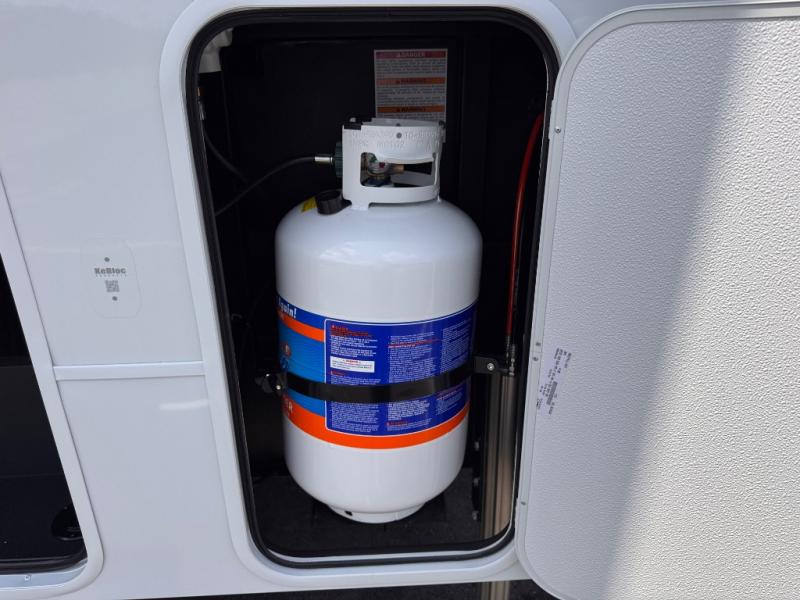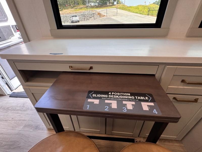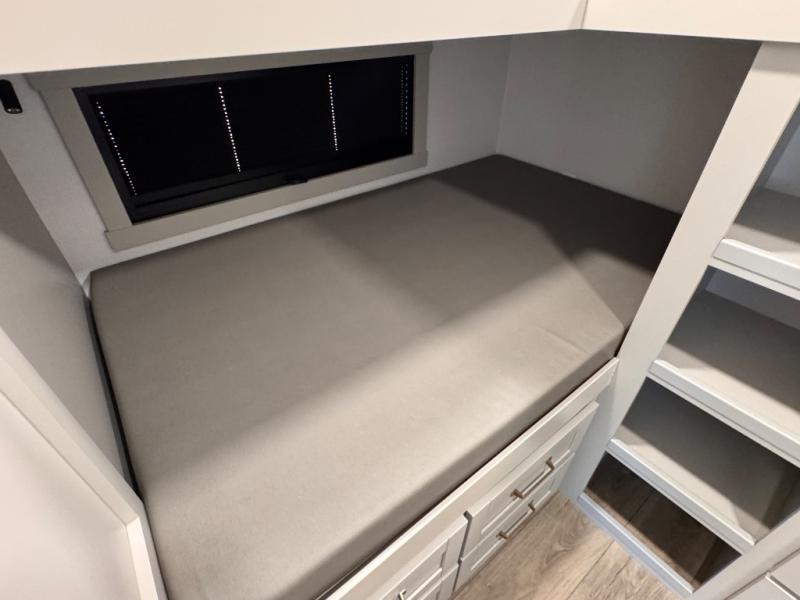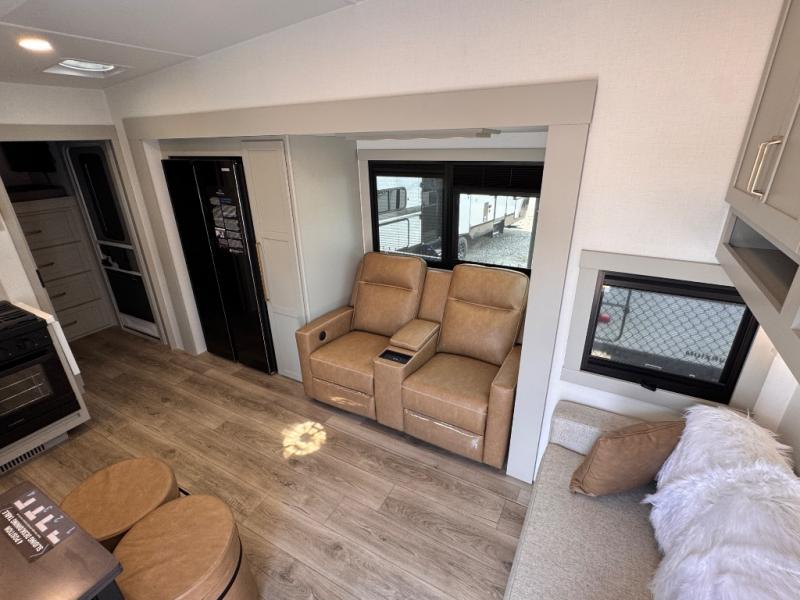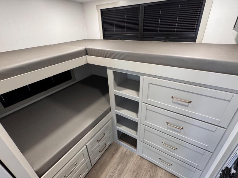 Start living your best camping life in this fifth wheel! The rear bunkhouse has an L shaped 72" x 92" x 32" top bunk above cubbies and a 44" x 72" bottom bunk, plus its very own private entrance/exit door to the unit. Just outside the bunkhouse is the kitchen which has everything you need to prepare your best home cooked meals including a flip-up countertop extension, a trash bin with Stow N' Go paper towel, and an area prepped for a dishwasher. Enjoy your delicious home cooked meals at the sliding dining/desk table then relax on either the 62" theater seating or 64" tri-fold sofa that extends into a 54" x 70" bed for more guests. As you step up the stairs to head up to the full bathroom and front private bedroom, you will notice that they have shoe storage to keep things tidy. Crank up the tunes with the exterior speakers and grab a cold beverage from the exterior refrigerator with storage drawers near it too!