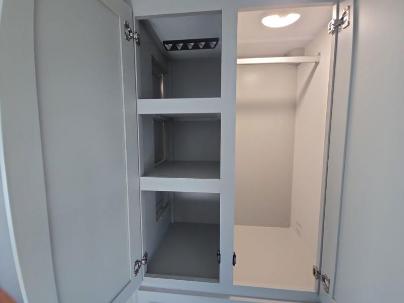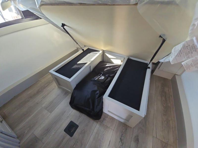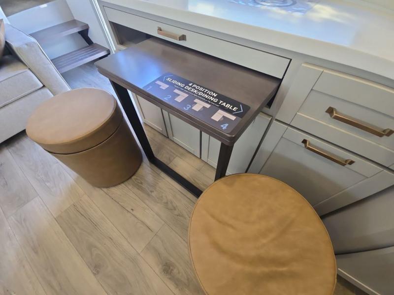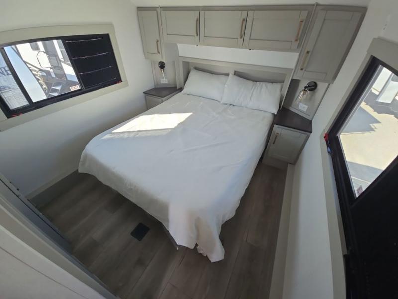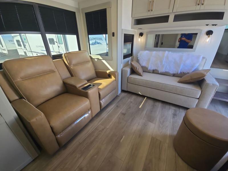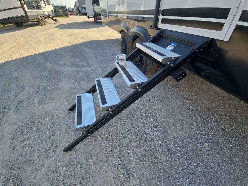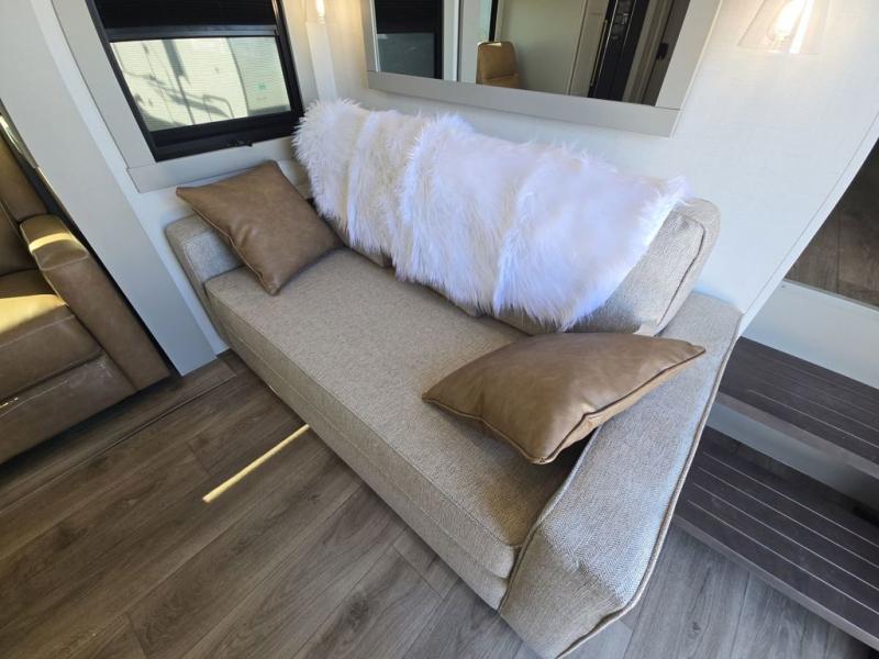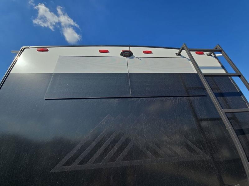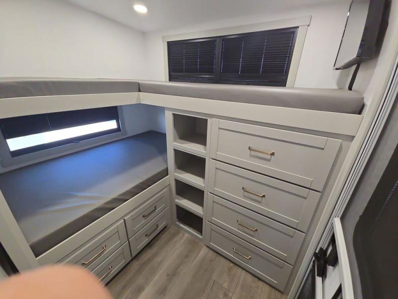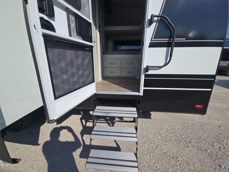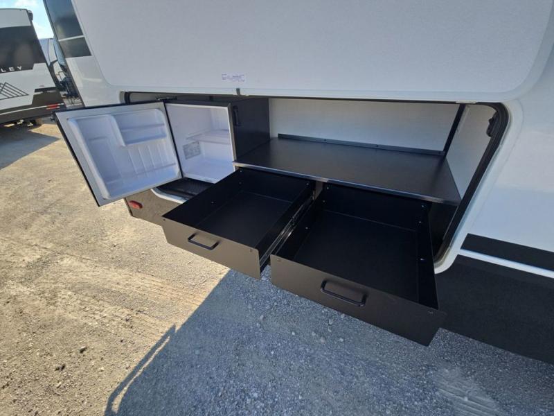 Start living your best camping life in this fifth wheel! The rear bunkhouse has an L shaped 72" x 92" x 32" top bunk above cubbies and a 44" x 72" bottom bunk, plus its very own private entrance/exit door to the unit. Just outside the bunkhouse is the kitchen which has everything you need to prepare your best home cooked meals including a flip-up countertop extension, a trash bin with Stow N' Go paper towel, and an area prepped for a dishwasher. Enjoy your delicious home cooked meals at the sliding dining/desk table then relax on either the 62" theater seating or 64" tri-fold sofa that extends into a 54" x 70" bed for more guests. As you step up the stairs to head up to the full bathroom and front private bedroom, you will notice that they have shoe storage to keep things tidy. Crank up the tunes with the exterior speakers and grab a cold beverage from the exterior refrigerator with storage drawers near it too!