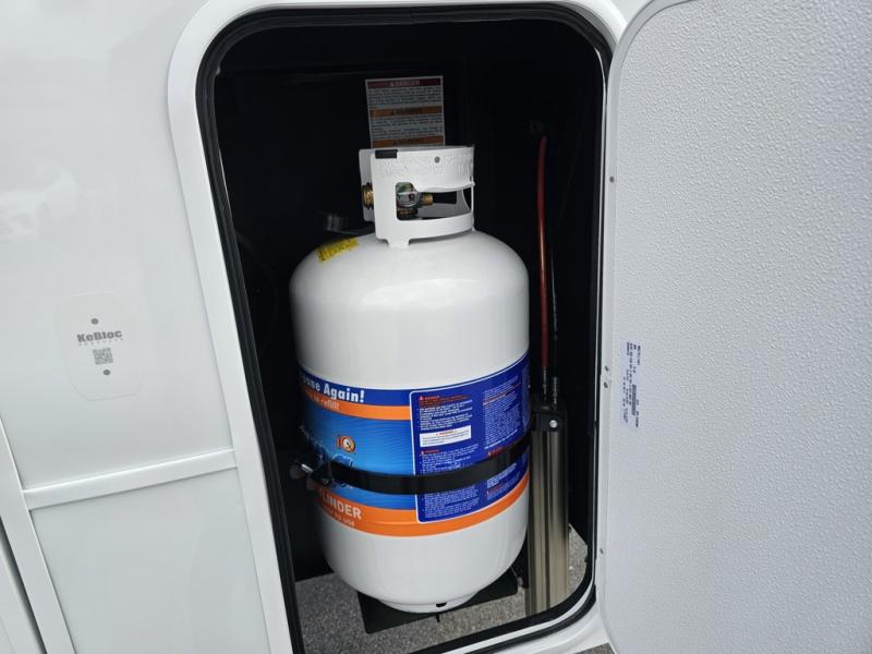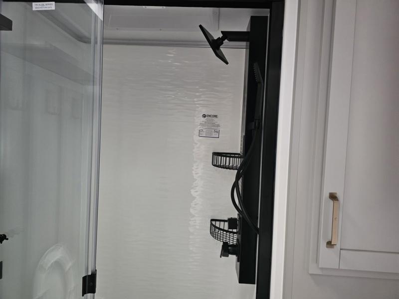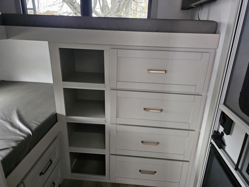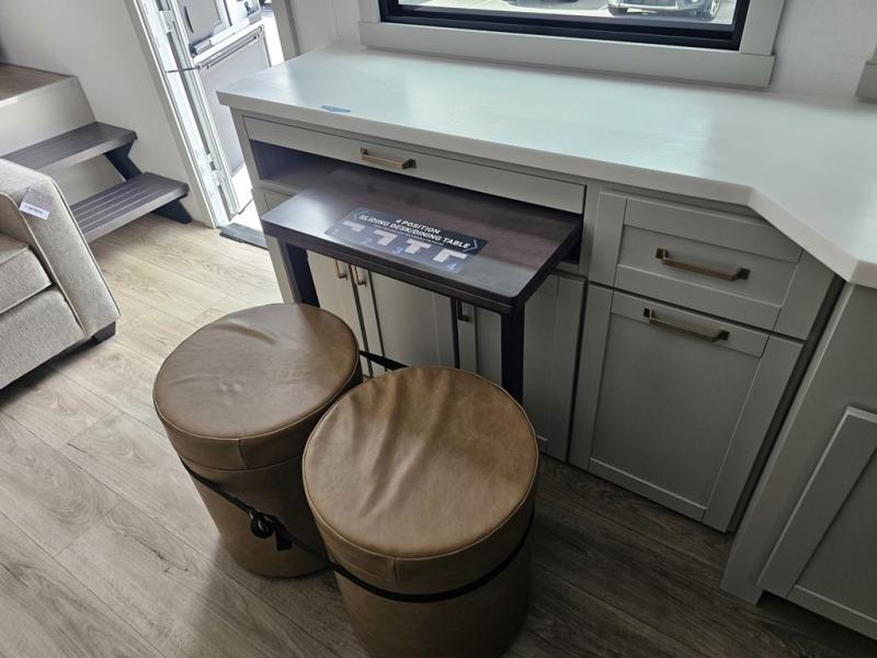 Start living your best camping life in this fifth wheel! The rear bunkhouse has an L shaped 72" x 92" x 32" top bunk above cubbies and a 44" x 72" bottom bunk, plus its very own private entrance/exit door to the unit. Just outside the bunkhouse is the kitchen which has everything you need to prepare your best home cooked meals including a flip-up countertop extension, a trash bin with Stow N' Go paper towel, and an area prepped for a dishwasher. Enjoy your delicious home cooked meals at the sliding dining/desk table then relax on either the 62" theater seating or 64" tri-fold sofa that extends into a 54" x 70" bed for more guests. As you step up the stairs to head up to the full bathroom and front private bedroom, you will notice that they have shoe storage to keep things tidy. Crank up the tunes with the exterior speakers and grab a cold beverage from the exterior refrigerator with storage drawers near it too!
