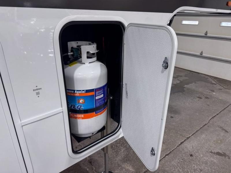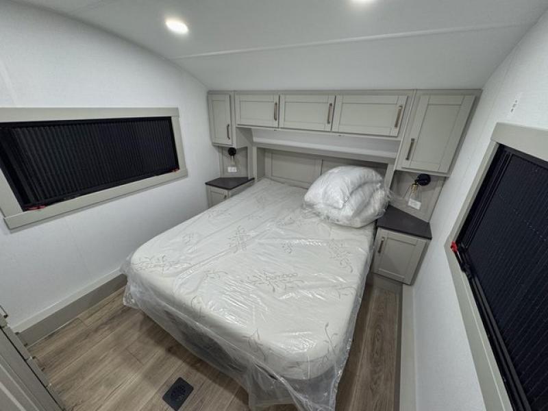 Start living your best camping life in this fifth wheel! The rear bunkhouse has an L shaped 72" x 92" x 32" top bunk above cubbies and a 44" x 72" bottom bunk, plus its very own private entrance/exit door to the unit. Just outside the bunkhouse is the kitchen which has everything you need to prepare your best home cooked meals including a flip-up countertop extension, a trash bin with Stow N' Go paper towel, and an area prepped for a dishwasher. Enjoy your delicious home cooked meals at the sliding dining/desk table then relax on either the 62" theater seating or 64" tri-fold sofa that extends into a 54" x 70" bed for more guests. As you step up the stairs to head up to the full bathroom and front private bedroom, you will notice that they have shoe storage to keep things tidy. Crank up the tunes with the exterior speakers and grab a cold beverage from the exterior refrigerator with storage drawers near it too!