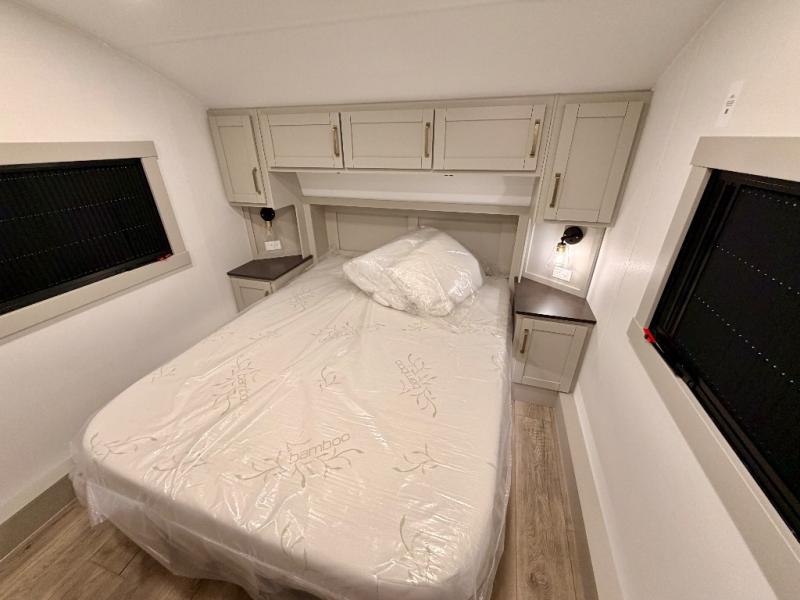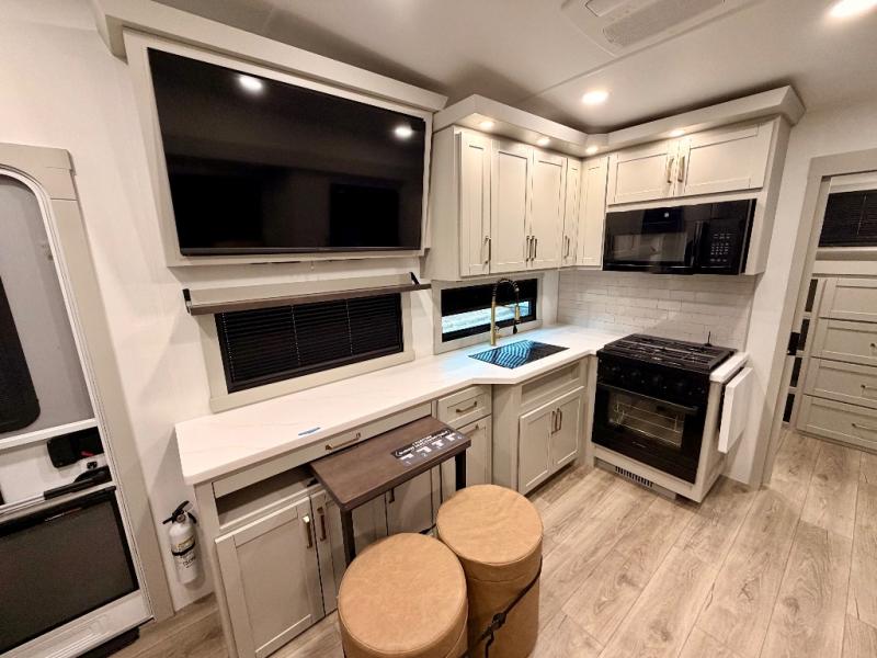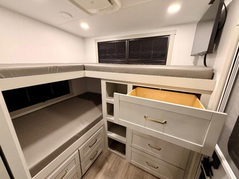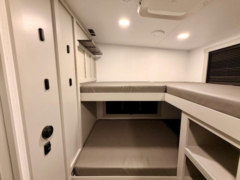 Start living your best camping life in this fifth wheel! The rear bunkhouse has an L shaped 72" x 92" x 32" top bunk above cubbies and a 44" x 72" bottom bunk, plus its very own private entrance/exit door to the unit. Just outside the bunkhouse is the kitchen which has everything you need to prepare your best home cooked meals including a flip-up countertop extension, a trash bin with Stow N' Go paper towel, and an area prepped for a dishwasher. Enjoy your delicious home cooked meals at the sliding dining/desk table then relax on either the 62" theater seating or 64" tri-fold sofa that extends into a 54" x 70" bed for more guests. As you step up the stairs to head up to the full bathroom and front private bedroom, you will notice that they have shoe storage to keep things tidy. Crank up the tunes with the exterior speakers and grab a cold beverage from the exterior refrigerator with storage drawers near it too!