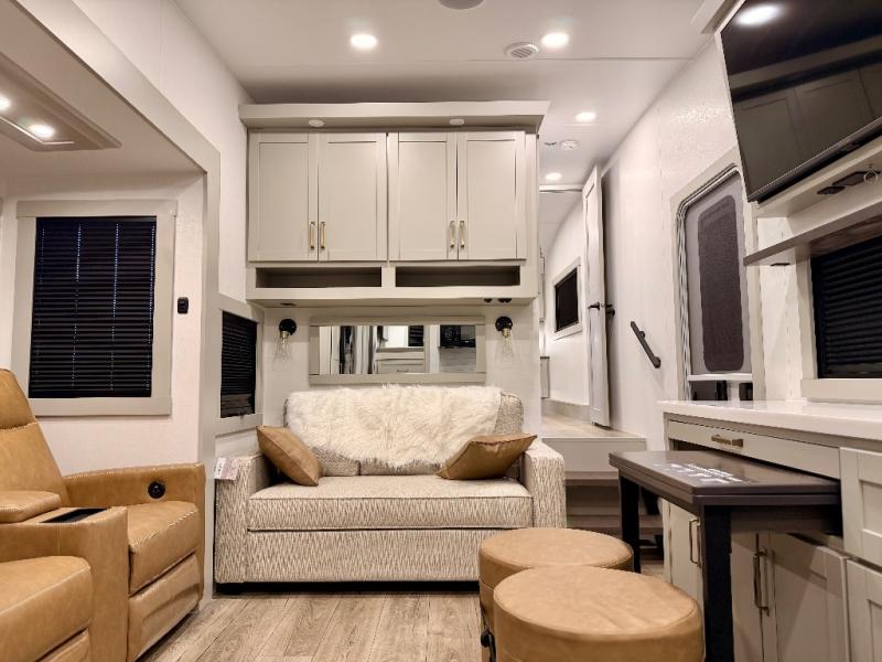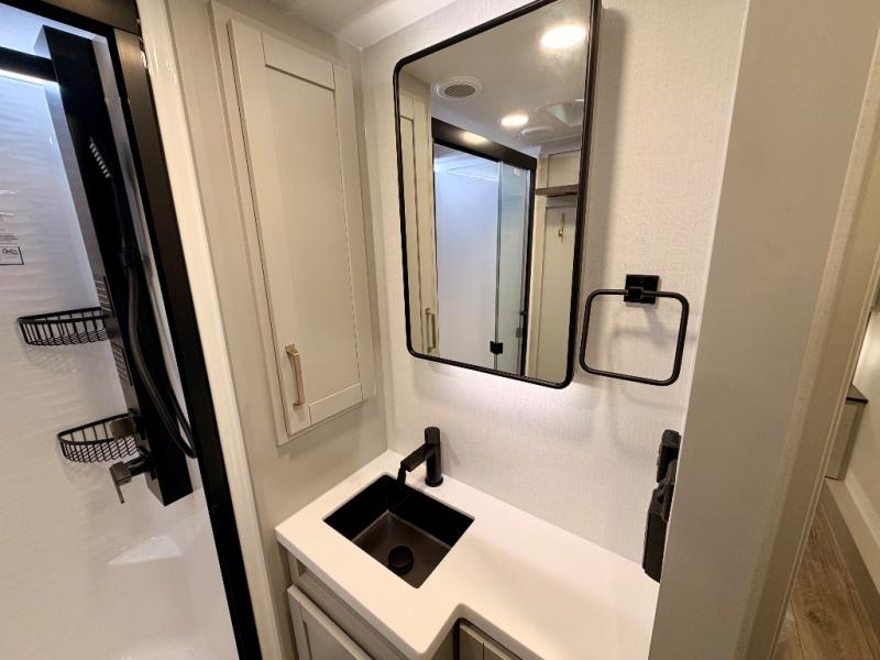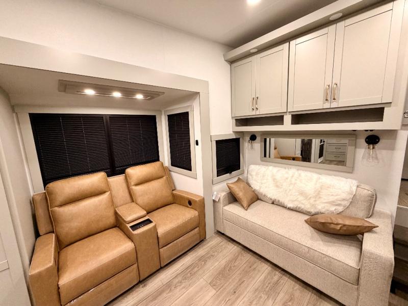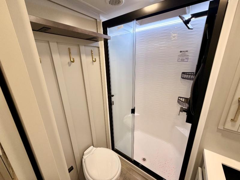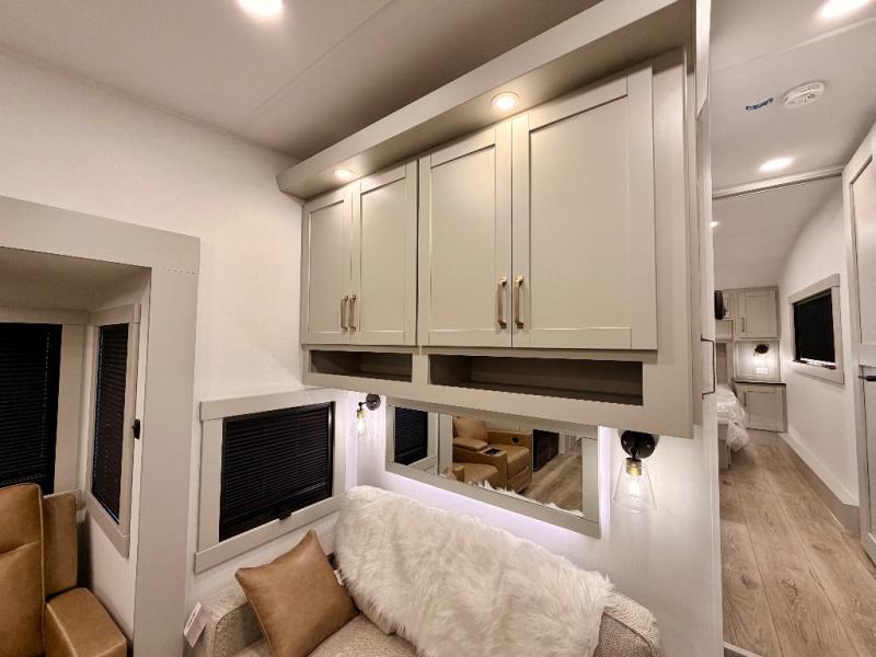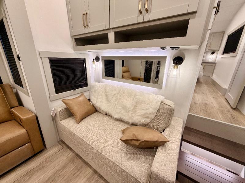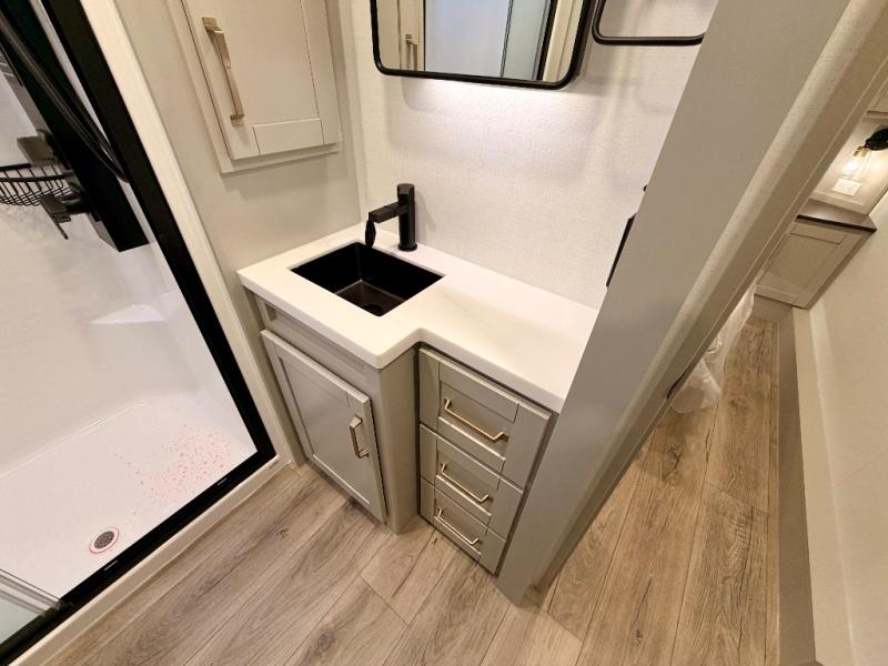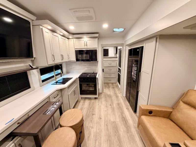 The Brinkley mid-profile Model Z fifth wheels bring you clean lines and an upscale look with plenty of style and exciting new features like the industry first brass plumbing connections. These units also feature an automotive grade front cap, plenty of exterior storage, exterior hot and cold showers, and wide stance leveling jacks for easy set up. Residential frameless windows provide a clean look and beautiful views, and ample electrical outlets and 6 USB/USB-C outlets allow all of your electronics and appliances to easily be used and charged.