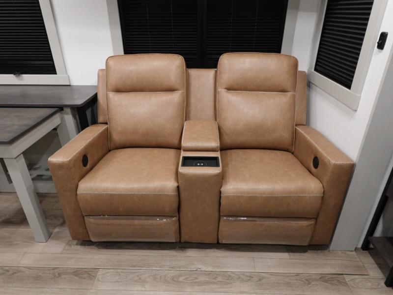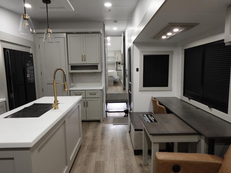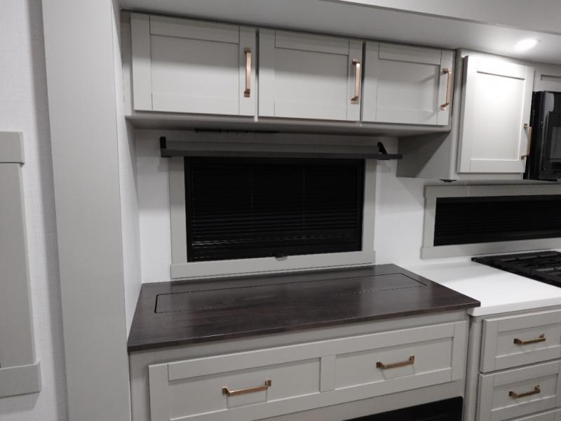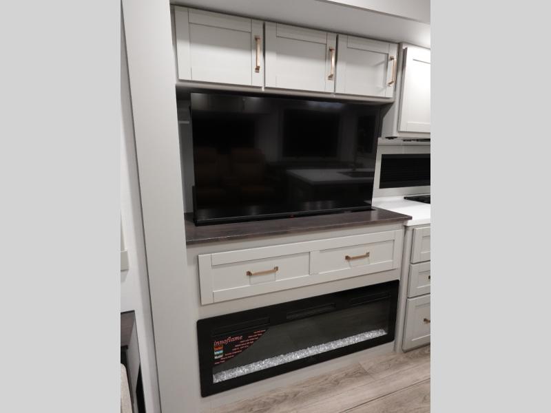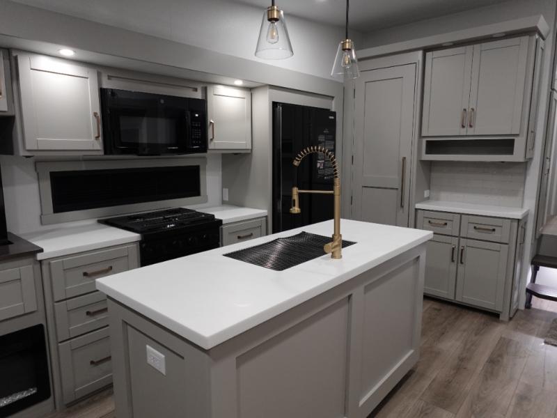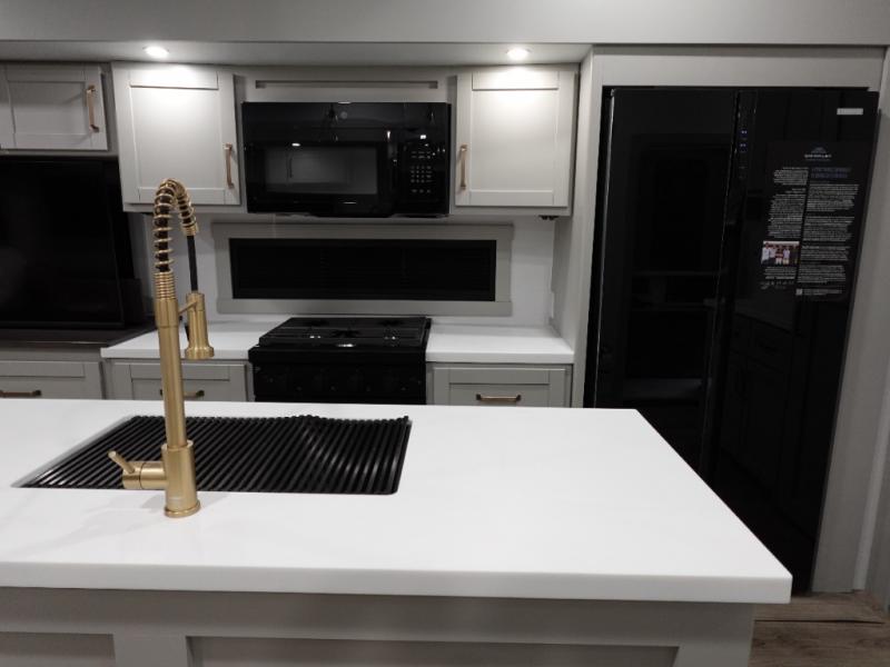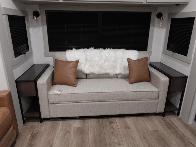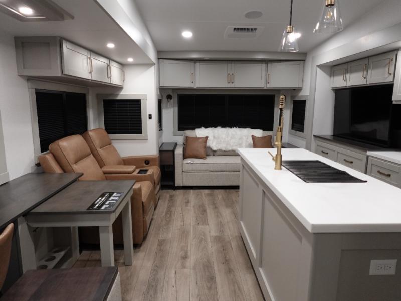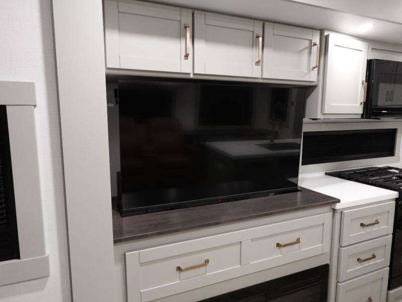 You're going to love every minute spent in this spacious fifth wheel that can sleep four. There is an inviting rear living area with a 72" tri-fold sofa and theater seating across from the televator and fireplace. The chef of your group can whip up dinner on the three burner cooktop or in the 30" residential microwave, and there is a 16 cu. ft. refrigerator that even opens when with the slide out is in. You will also enjoy the kitchen island with a farmhouse sink and roller cover, dual trash bins with a Stow N' Go paper towel holder, plus convenient dog bowls for your furry friends. You can store all your paper goods and snacks in the 84" pantry with adjustable shelving, and there is a hutch for nice dishes plus shoe storage in this model as well. Head to the front master bedroom where you'll find a queen bed with a TV, a large slide out with a wardrobe with drawers, plus a spacious bath.