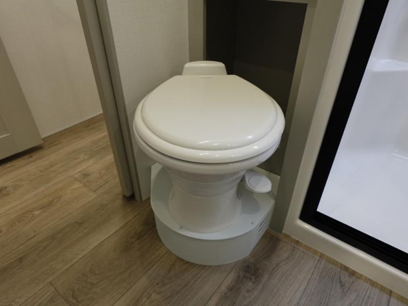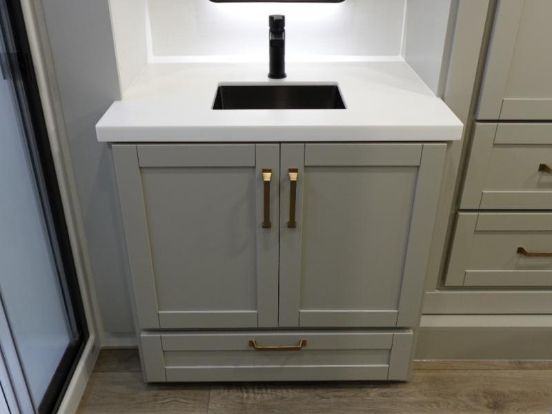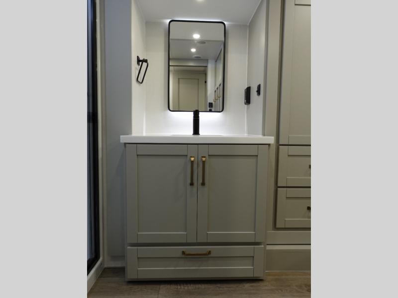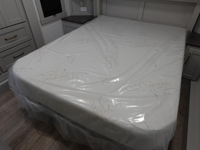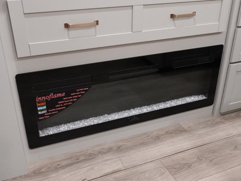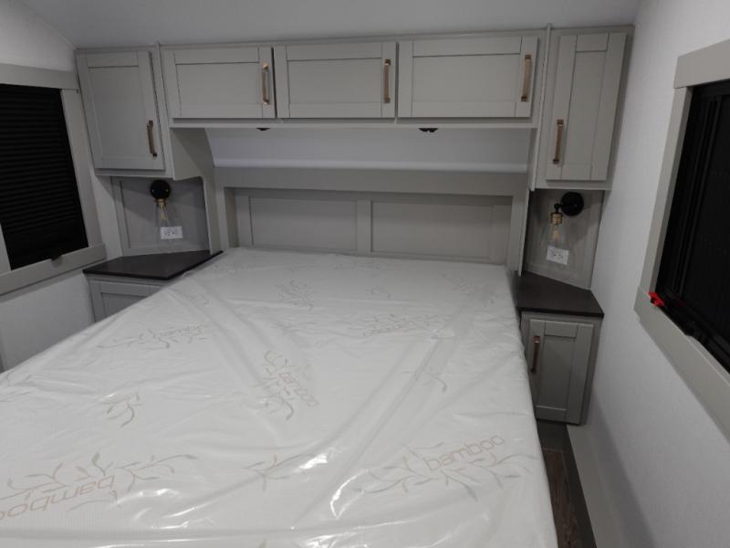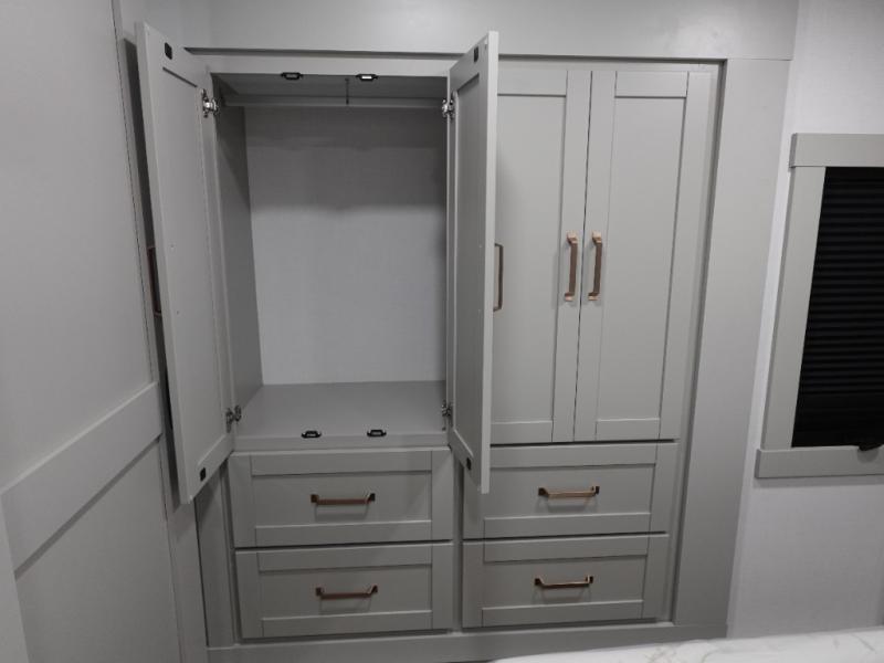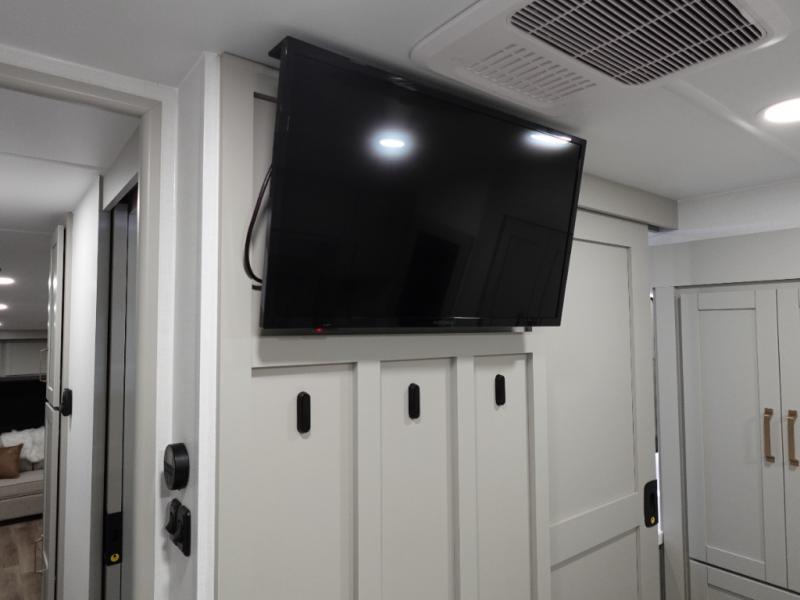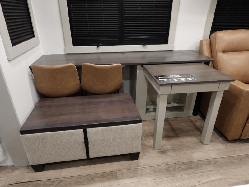 You're going to love every minute spent in this spacious fifth wheel that can sleep four. There is an inviting rear living area with a 72" tri-fold sofa and theater seating across from the televator and fireplace. The chef of your group can whip up dinner on the three burner cooktop or in the 30" residential microwave, and there is a 16 cu. ft. refrigerator that even opens when with the slide out is in. You will also enjoy the kitchen island with a farmhouse sink and roller cover, dual trash bins with a Stow N' Go paper towel holder, plus convenient dog bowls for your furry friends. You can store all your paper goods and snacks in the 84" pantry with adjustable shelving, and there is a hutch for nice dishes plus shoe storage in this model as well. Head to the front master bedroom where you'll find a queen bed with a TV, a large slide out with a wardrobe with drawers, plus a spacious bath.