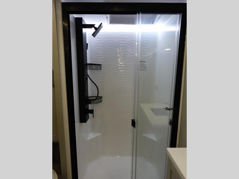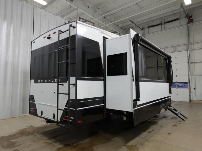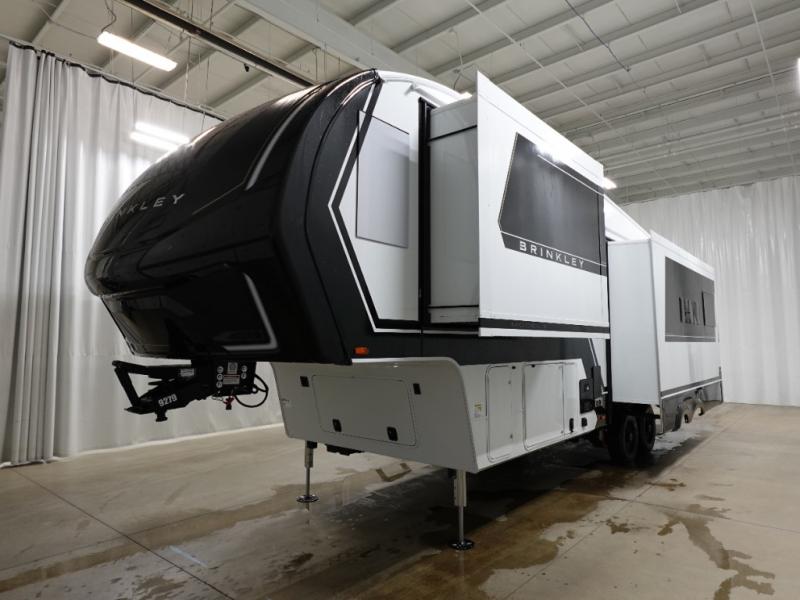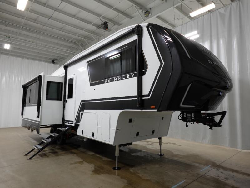 The Brinkley mid-profile Model Z fifth wheels bring you clean lines and an upscale look with plenty of style and exciting new features like the industry first brass plumbing connections. These units also feature an automotive grade front cap, plenty of exterior storage, dual exterior hot and cold showers, and wide stance leveling jacks for easy set up. Residential frameless windows provide a clean look and beautiful views, and ample electrical outlets and USB/USB-C outlets allow all of your electronics and appliances to easily be used and charged.