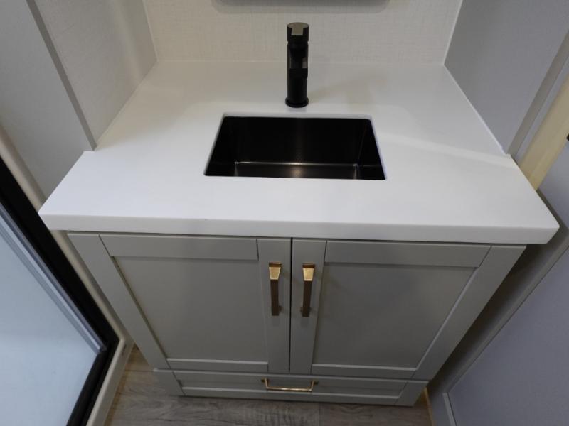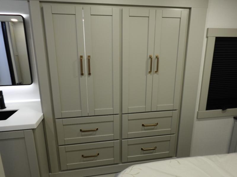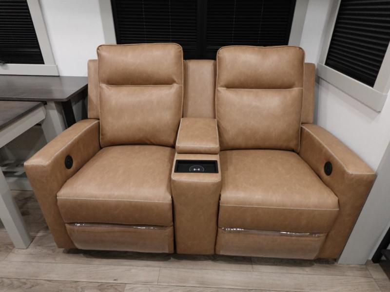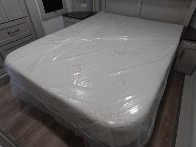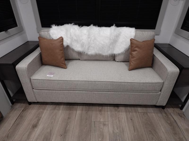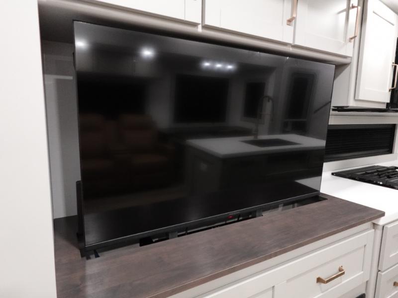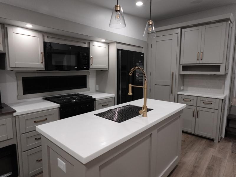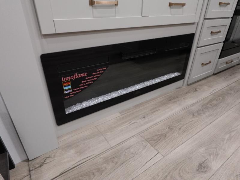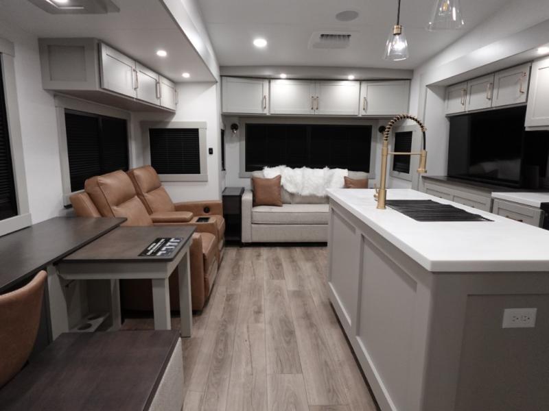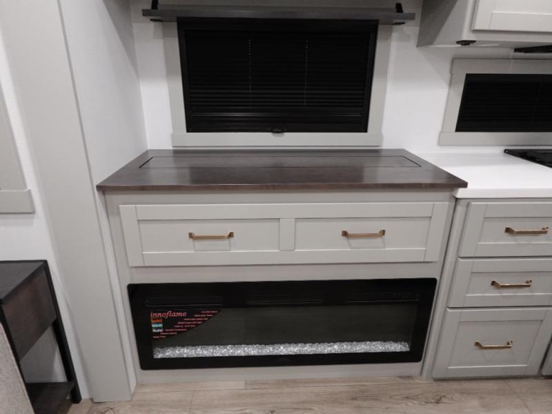You're going to love every minute spent in this spacious fifth wheel that can sleep four. There is an inviting rear living area with a 72" tri-fold sofa and theater seating across from the televator and fireplace. The chef of your group can whip up dinner on the three burner cooktop or in the 30" residential microwave, and there is a 16 cu. ft. refrigerator that even opens when with the slide out is in. You will also enjoy the kitchen island with a farmhouse sink and roller cover, dual trash bins with a Stow N' Go paper towel holder, plus convenient dog bowls for your furry friends. You can store all your paper goods and snacks in the 84" pantry with adjustable shelving, and there is a hutch for nice dishes plus shoe storage in this model as well. Head to the front master bedroom where you'll find a queen bed with a TV, a large slide out with a wardrobe with drawers, plus a spacious bath.