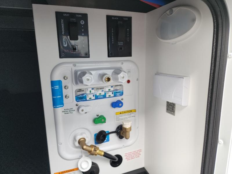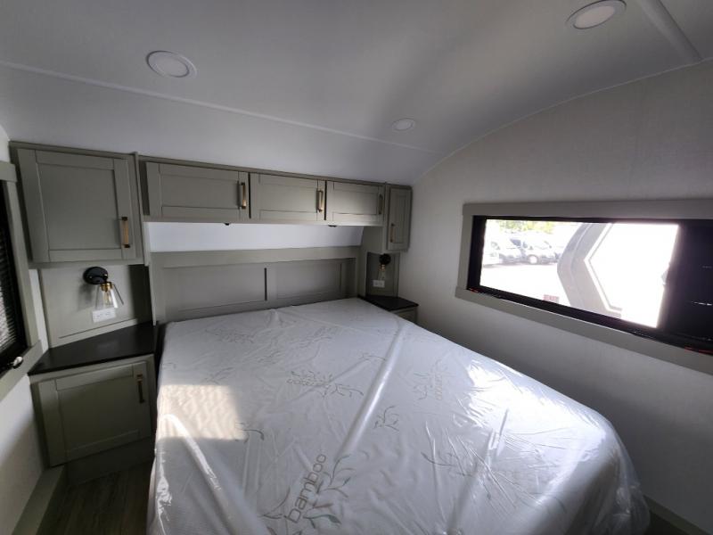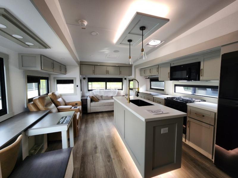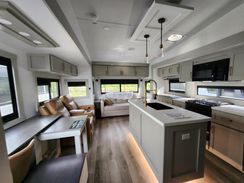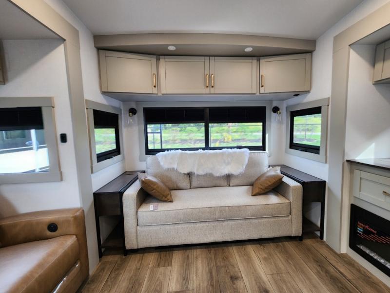 You're going to love every minute spent in this spacious fifth wheel that can sleep four. There is an inviting rear living area with a 72" tri-fold sofa and theater seating across from the televator and fireplace. The chef of your group can whip up dinner on the three burner cooktop or in the 30" residential microwave, and there is a 16 cu. ft. refrigerator that even opens when with the slide out is in. You will also enjoy the kitchen island with a farmhouse sink and roller cover, dual trash bins with a Stow N' Go paper towel holder, plus convenient dog bowls for your furry friends. You can store all your paper goods and snacks in the 84" pantry with adjustable shelving, and there is a hutch for nice dishes plus shoe storage in this model as well. Head to the front master bedroom where you'll find a queen bed with a TV, a large slide out with a wardrobe with drawers, plus a spacious bath.