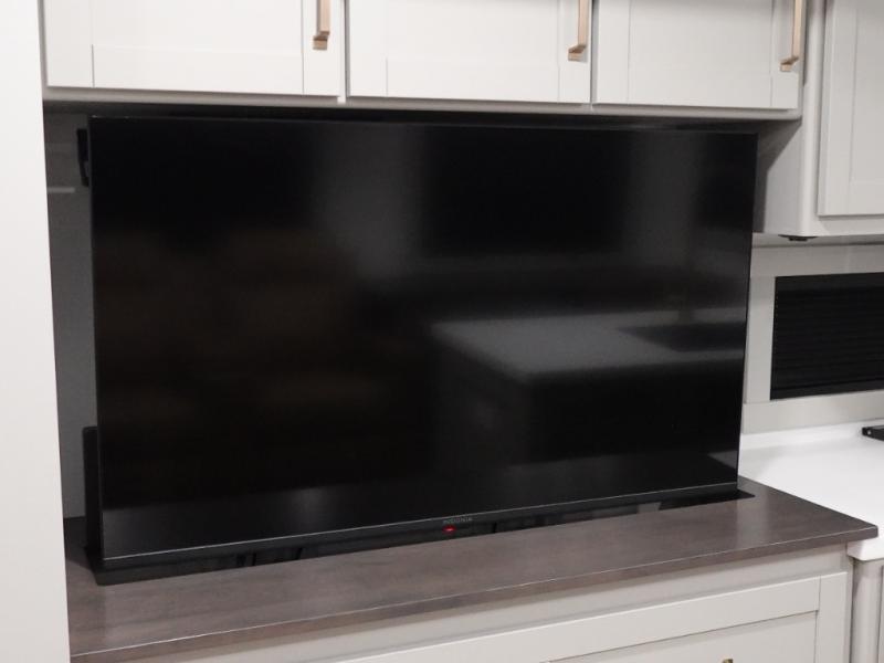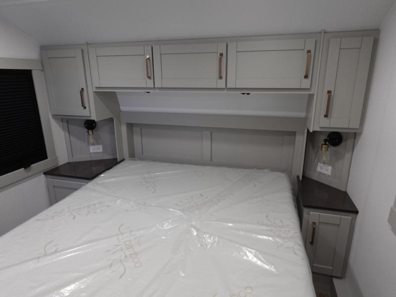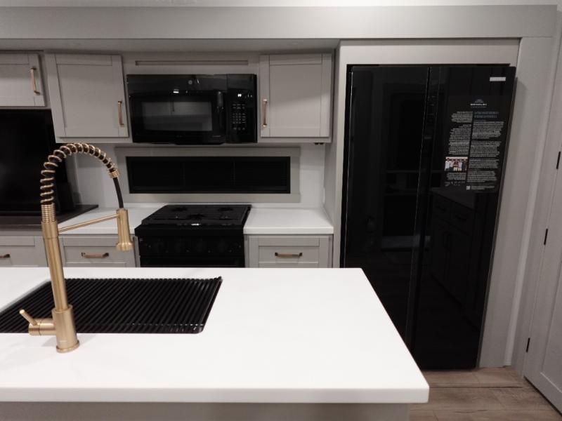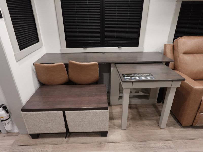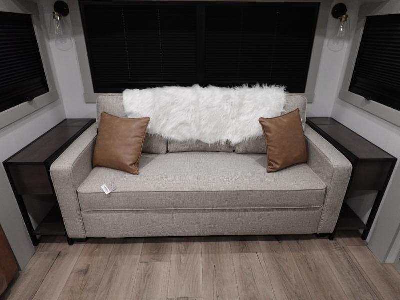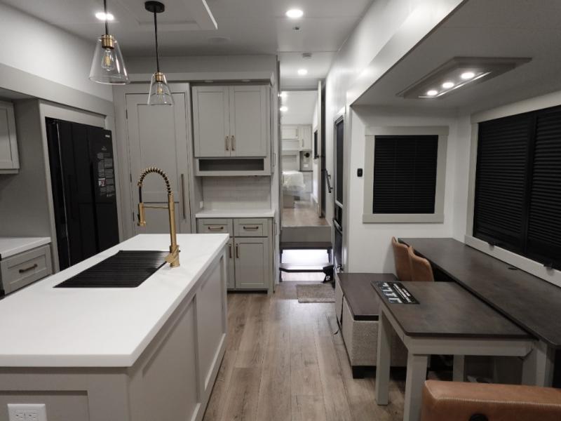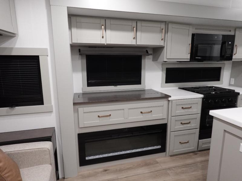 You're going to love every minute spent in this spacious fifth wheel that can sleep four. There is an inviting rear living area with a 72" tri-fold sofa and theater seating across from the televator and fireplace. The chef of your group can whip up dinner on the three burner cooktop or in the 30" residential microwave, and there is a 16 cu. ft. refrigerator that even opens when with the slide out is in. You will also enjoy the kitchen island with a farmhouse sink and roller cover, dual trash bins with a Stow N' Go paper towel holder, plus convenient dog bowls for your furry friends. You can store all your paper goods and snacks in the 84" pantry with adjustable shelving, and there is a hutch for nice dishes plus shoe storage in this model as well. Head to the front master bedroom where you'll find a queen bed with a TV, a large slide out with a wardrobe with drawers, plus a spacious bath.
