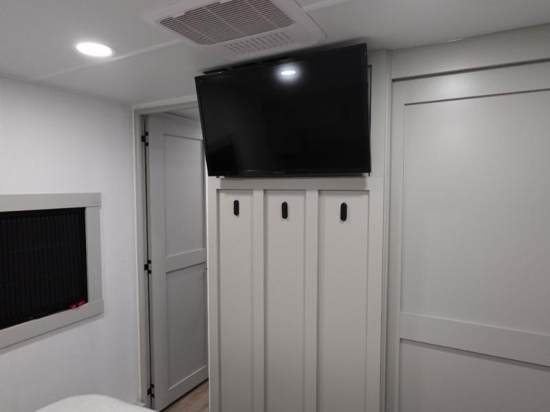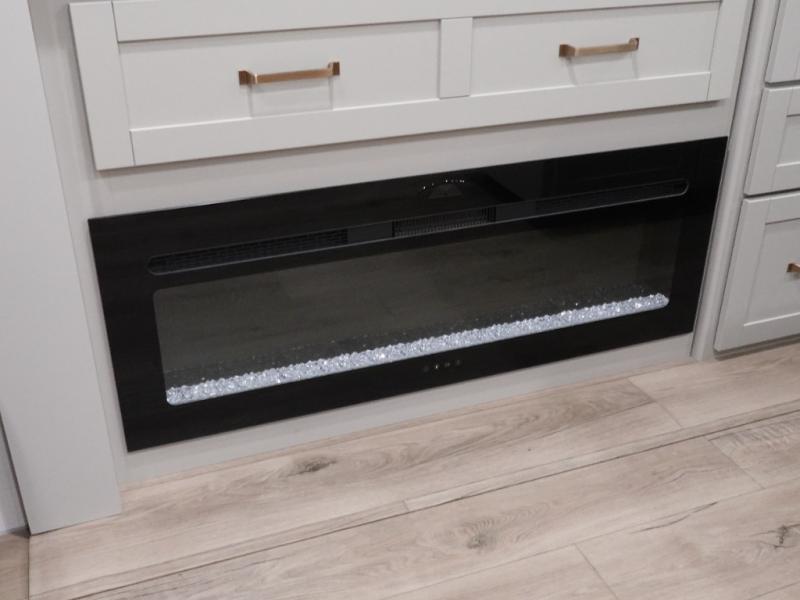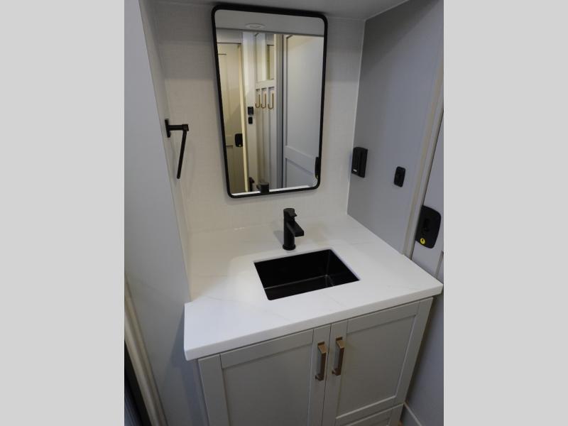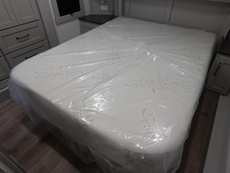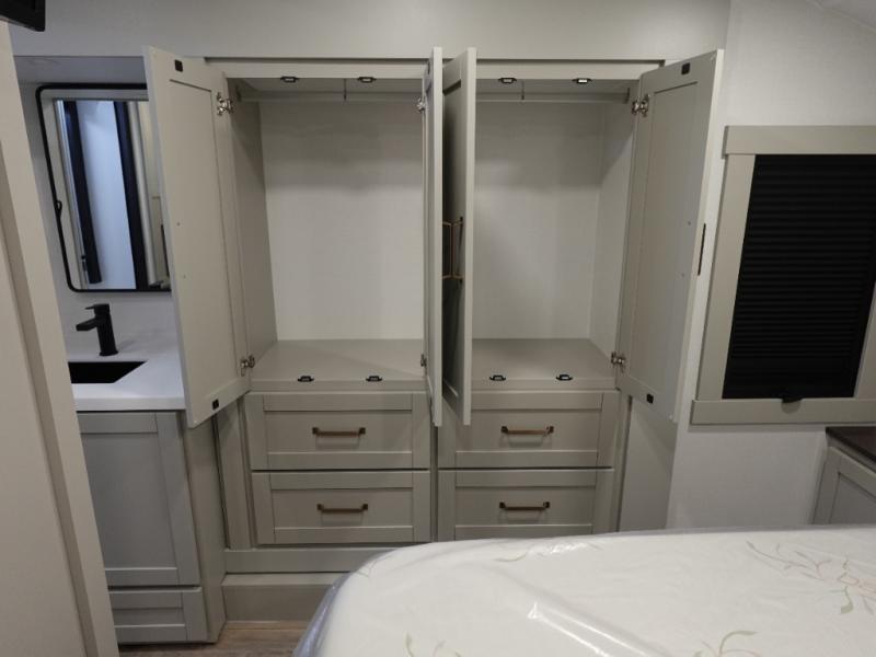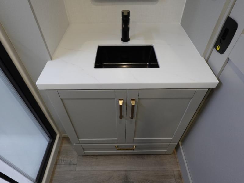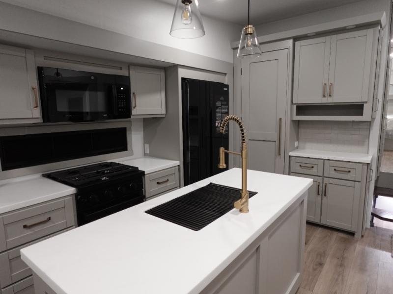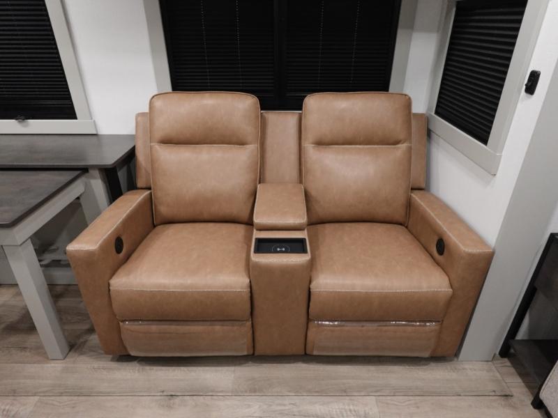 You're going to love every minute spent in this spacious fifth wheel that can sleep four. There is an inviting rear living area with a 72" tri-fold sofa and theater seating across from the televator and fireplace. The chef of your group can whip up dinner on the three burner cooktop or in the 30" residential microwave, and there is a 16 cu. ft. refrigerator that even opens when with the slide out is in. You will also enjoy the kitchen island with a farmhouse sink and roller cover, dual trash bins with a Stow N' Go paper towel holder, plus convenient dog bowls for your furry friends. You can store all your paper goods and snacks in the 84" pantry with adjustable shelving, and there is a hutch for nice dishes plus shoe storage in this model as well. Head to the front master bedroom where you'll find a queen bed with a TV, a large slide out with a wardrobe with drawers, plus a spacious bath.