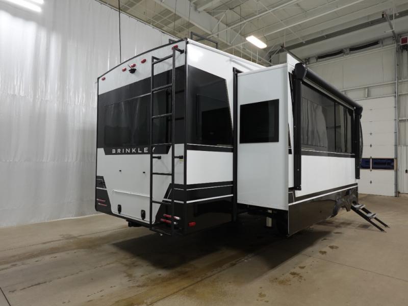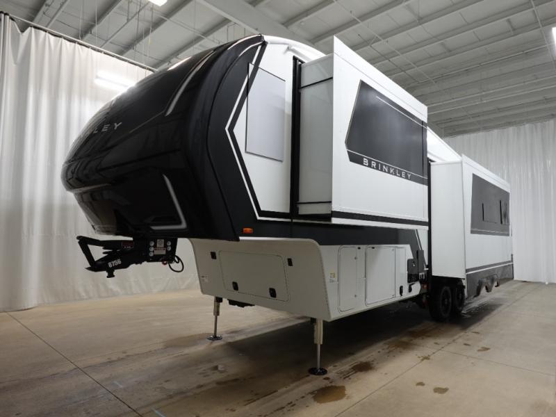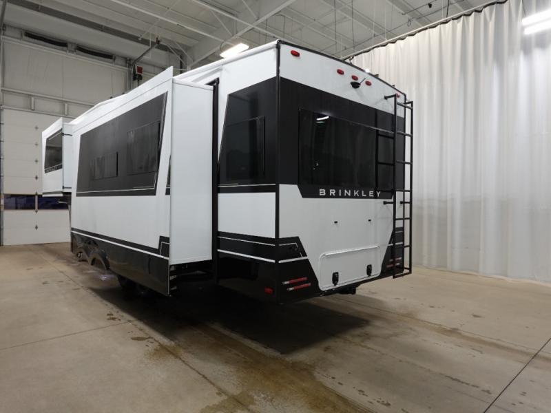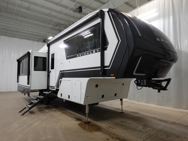 The Brinkley mid-profile Model Z fifth wheels bring you clean lines and an upscale look with plenty of style and exciting new features like the industry first brass plumbing connections. These units also feature an automotive grade front cap, plenty of exterior storage, dual exterior hot and cold showers, and wide stance leveling jacks for easy set up. Residential frameless windows provide a clean look and beautiful views, and ample electrical outlets and USB/USB-C outlets allow all of your electronics and appliances to easily be used and charged.