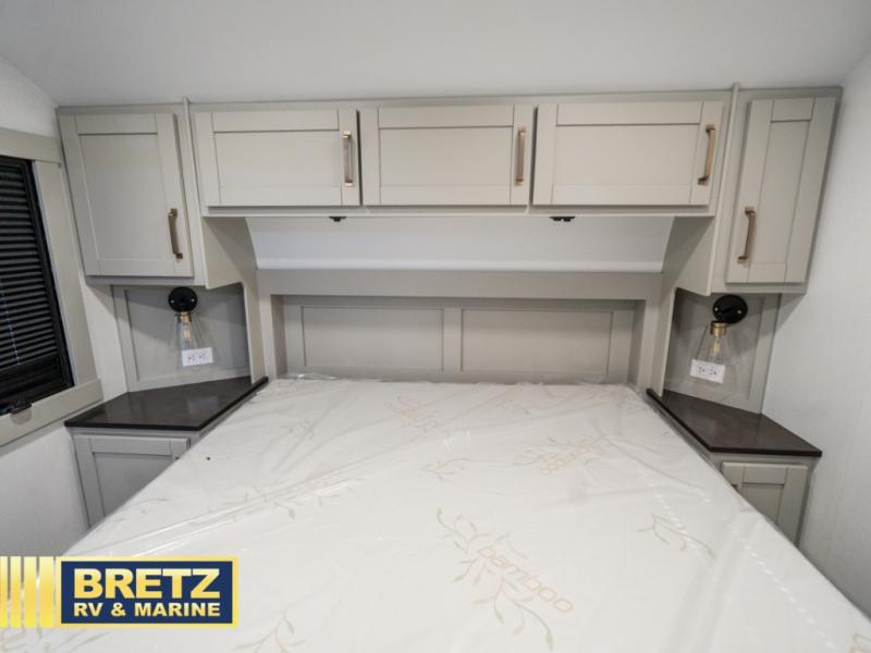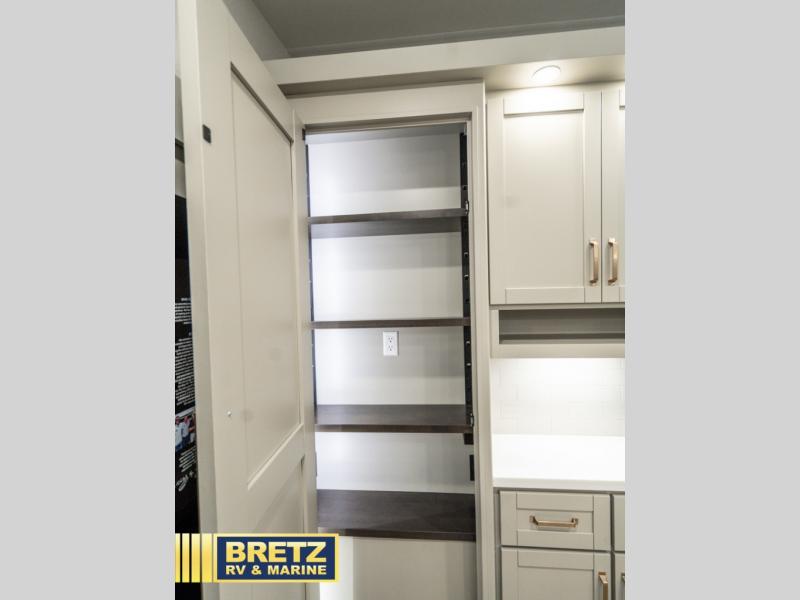 You're going to love every minute spent in this spacious fifth wheel that can sleep four. There is an inviting rear living area with a 72" tri-fold sofa and theater seating across from the televator and fireplace. The chef of your group can whip up dinner on the three burner cooktop or in the 30" residential microwave, and there is a 16 cu. ft. refrigerator that even opens when with the slide out is in. You will also enjoy the kitchen island with a farmhouse sink and roller cover, dual trash bins with a Stow N' Go paper towel holder, plus convenient dog bowls for your furry friends. You can store all your paper goods and snacks in the 84" pantry with adjustable shelving, and there is a hutch for nice dishes plus shoe storage in this model as well. Head to the front master bedroom where you'll find a queen bed with a TV, a large slide out with a wardrobe with drawers, plus a spacious bath.