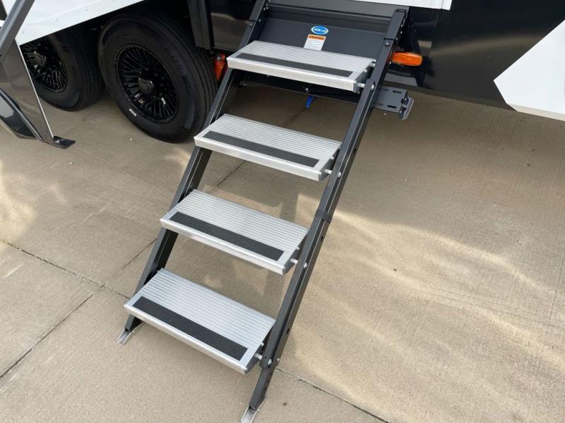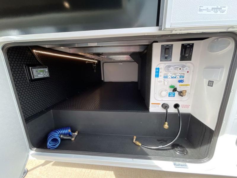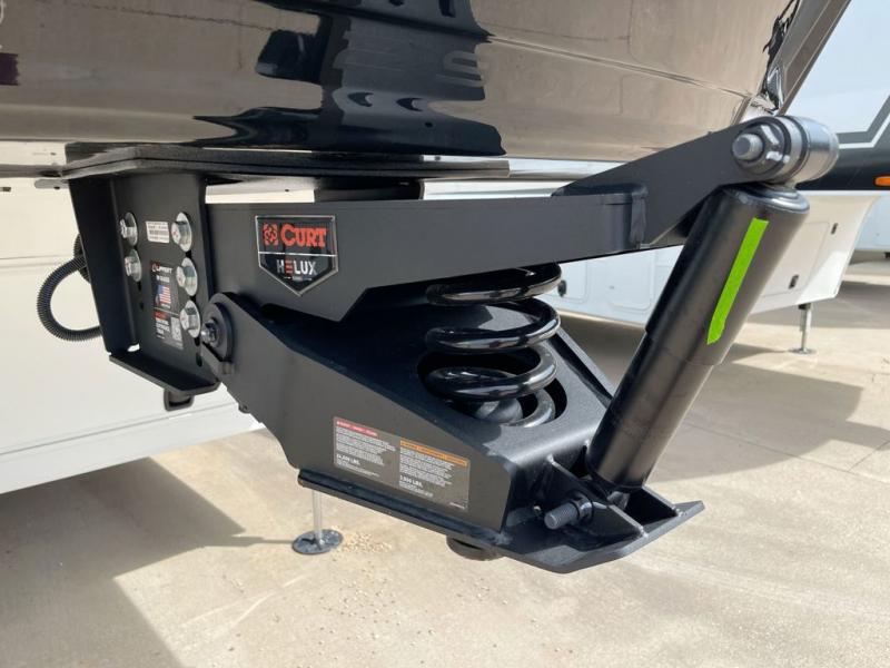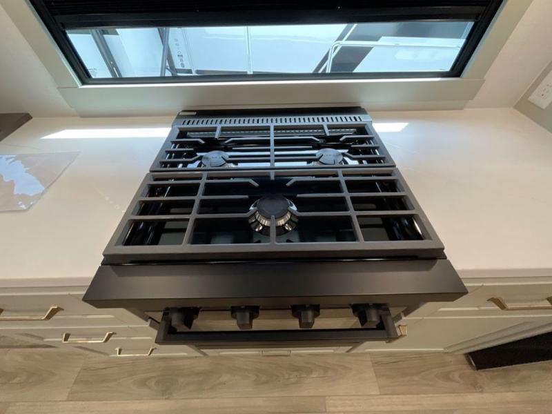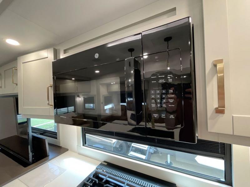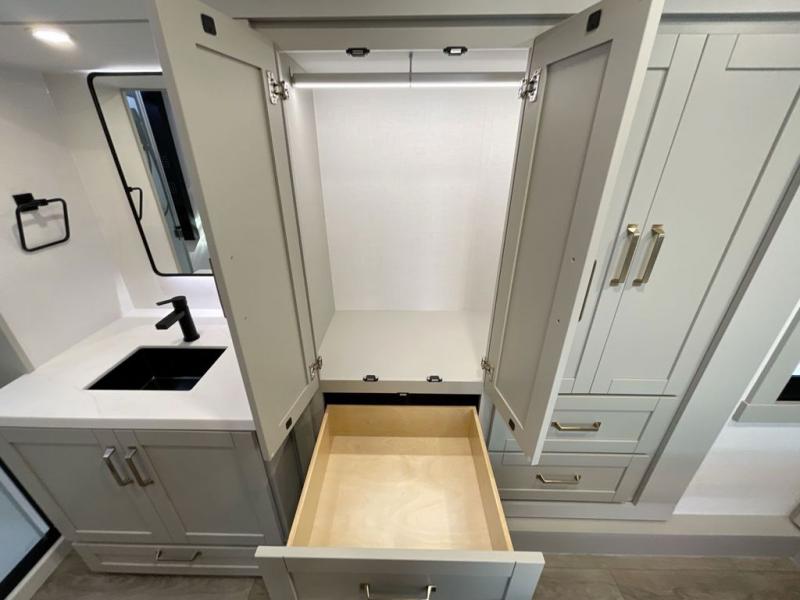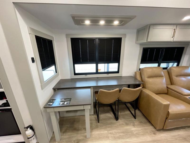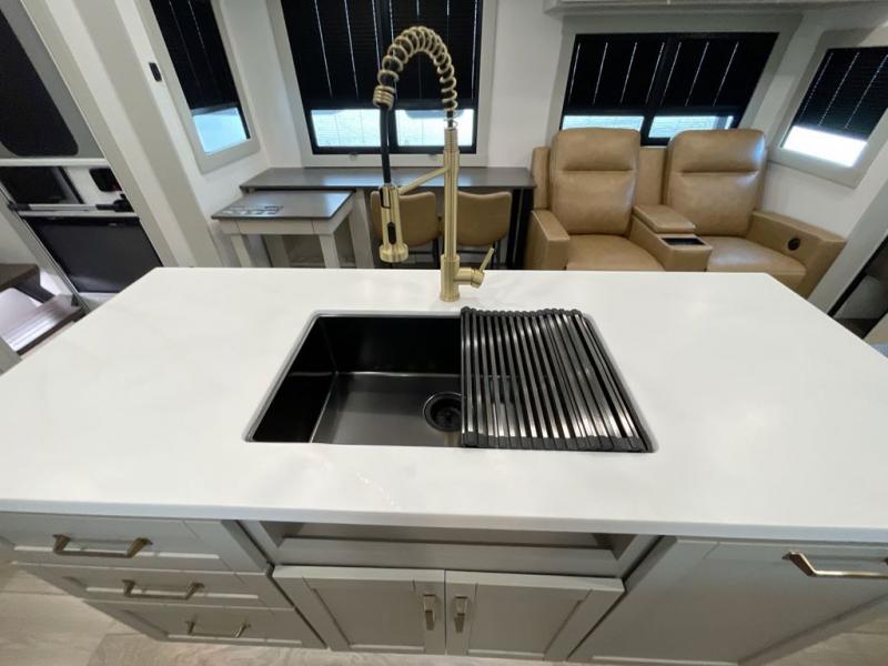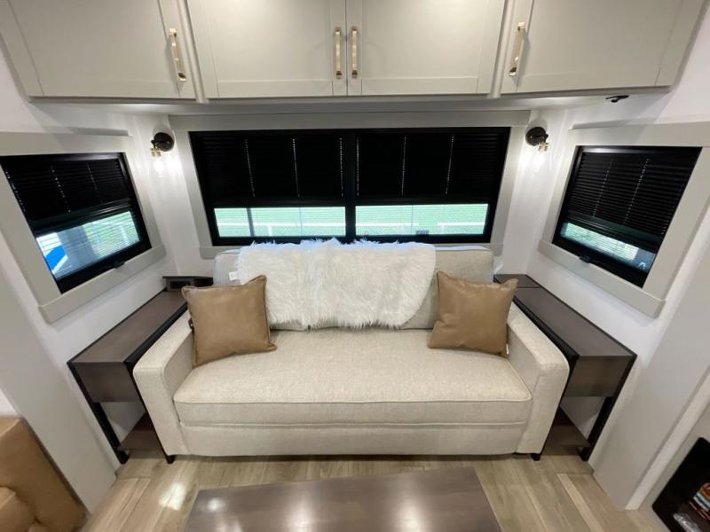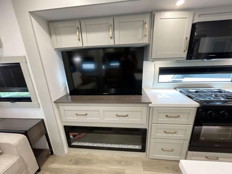 You're going to love every minute spent in this spacious fifth wheel that can sleep four. There is an inviting rear living area with a 72" tri-fold sofa and theater seating across from the televator and fireplace. The chef of your group can whip up dinner on the three burner cooktop or in the 30" residential microwave, and there is a 16 cu. ft. refrigerator that even opens when with the slide out is in. You will also enjoy the kitchen island with a farmhouse sink and roller cover, dual trash bins with a Stow N' Go paper towel holder, plus convenient dog bowls for your furry friends. You can store all your paper goods and snacks in the 84" pantry with adjustable shelving, and there is a hutch for nice dishes plus shoe storage in this model as well. Head to the front master bedroom where you'll find a queen bed with a TV, a large slide out with a wardrobe with drawers, plus a spacious bath.