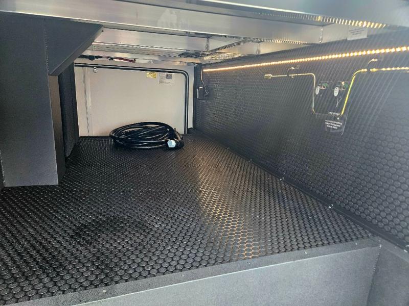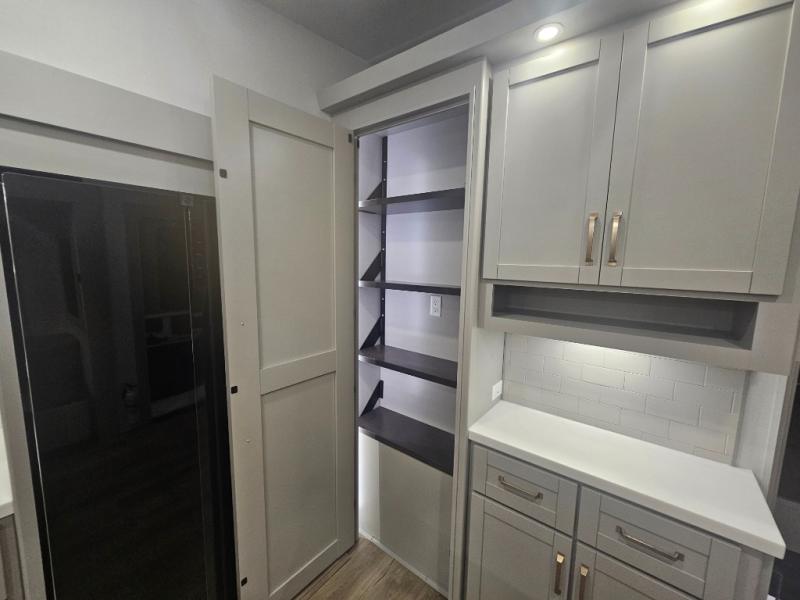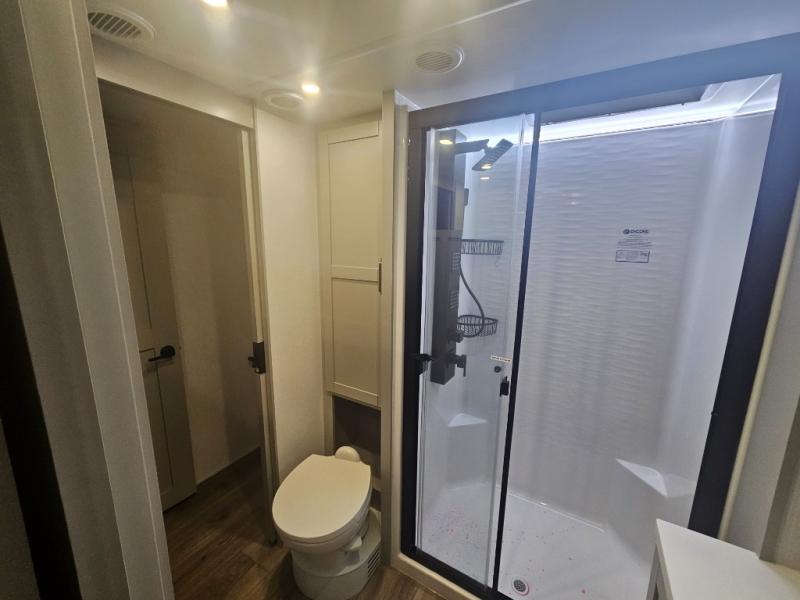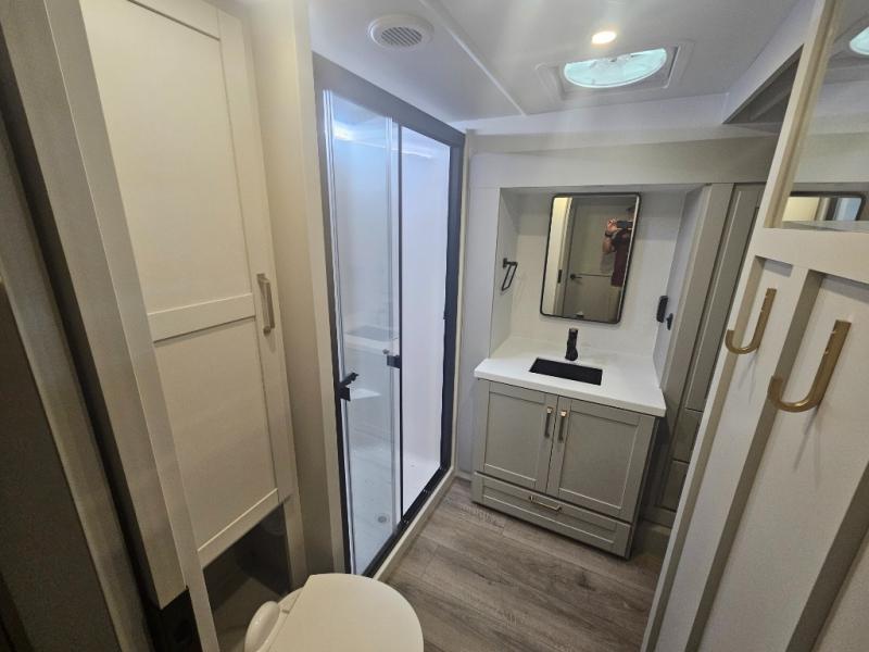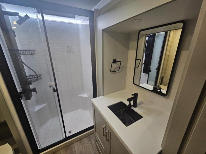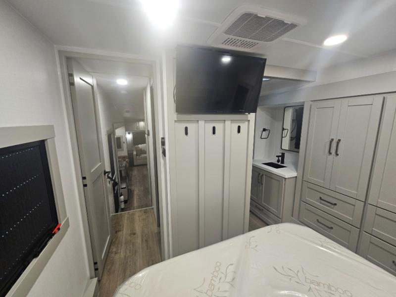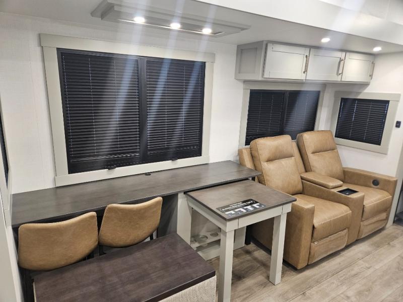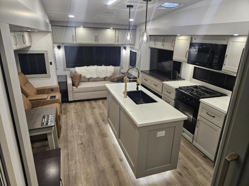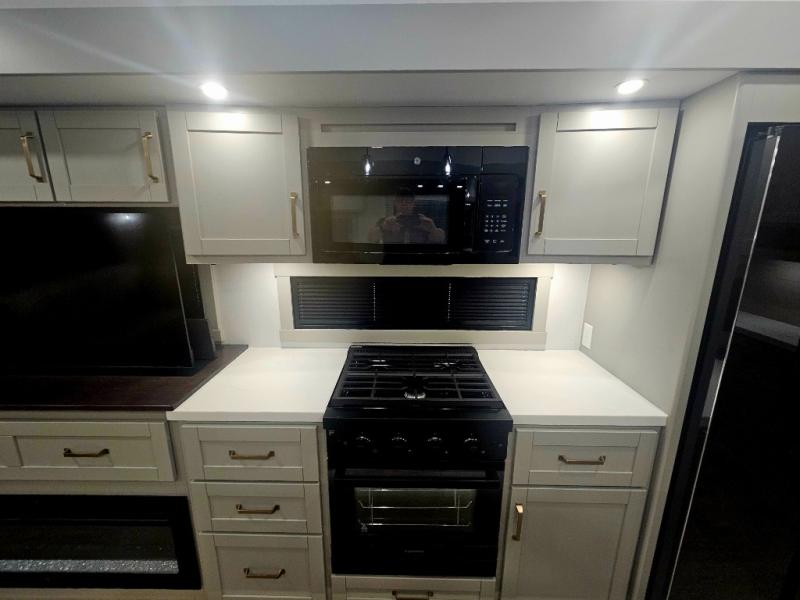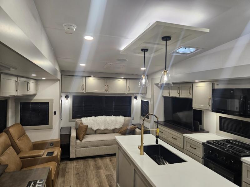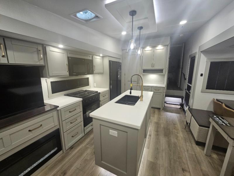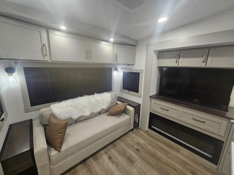 You're going to love every minute spent in this spacious fifth wheel that can sleep four. There is an inviting rear living area with a 72" tri-fold sofa and theater seating across from the televator and fireplace. The chef of your group can whip up dinner on the three burner cooktop or in the 30" residential microwave, and there is a 16 cu. ft. refrigerator that even opens when with the slide out is in. You will also enjoy the kitchen island with a farmhouse sink and roller cover, dual trash bins with a Stow N' Go paper towel holder, plus convenient dog bowls for your furry friends. You can store all your paper goods and snacks in the 84" pantry with adjustable shelving, and there is a hutch for nice dishes plus shoe storage in this model as well. Head to the front master bedroom where you'll find a queen bed with a TV, a large slide out with a wardrobe with drawers, plus a spacious bath.