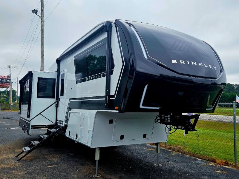 The Brinkley mid-profile Model Z fifth wheels bring you clean lines and an upscale look with plenty of style and exciting new features like the industry first brass plumbing connections. These units also feature an automotive grade front cap, plenty of exterior storage, dual exterior hot and cold showers, and wide stance leveling jacks for easy set up. Residential frameless windows provide a clean look and beautiful views, and ample electrical outlets and USB/USB-C outlets allow all of your electronics and appliances to easily be used and charged.