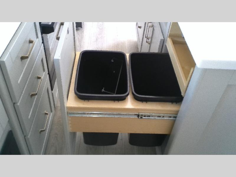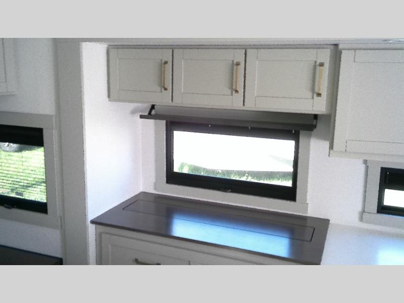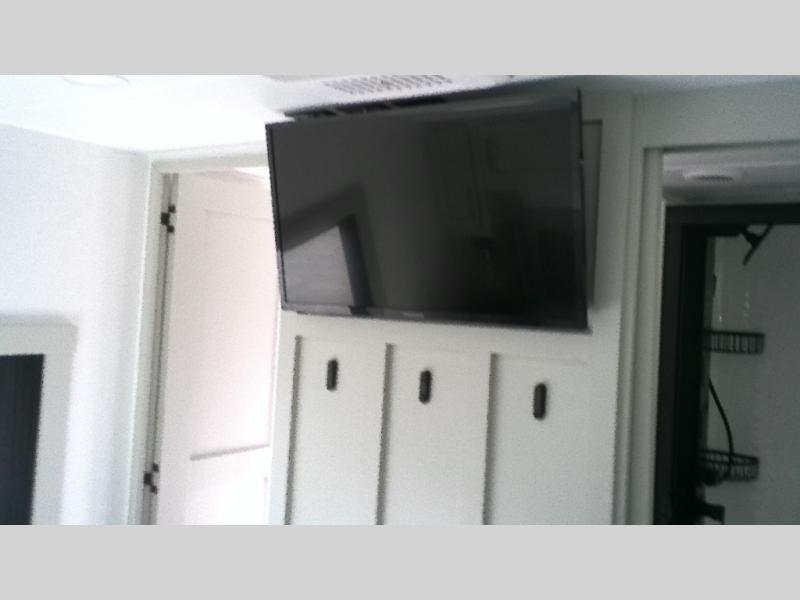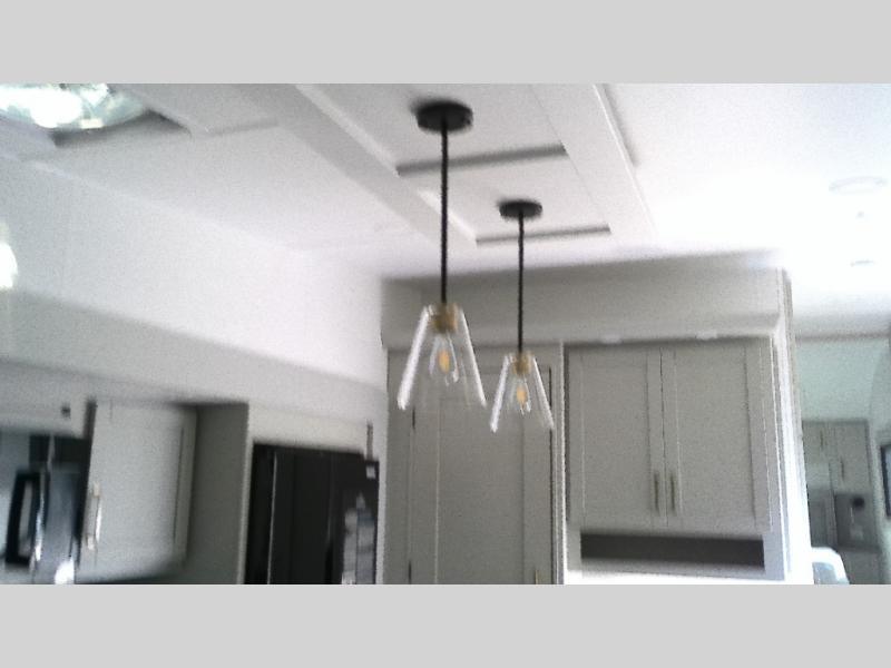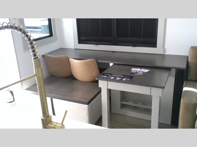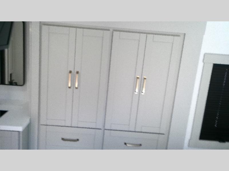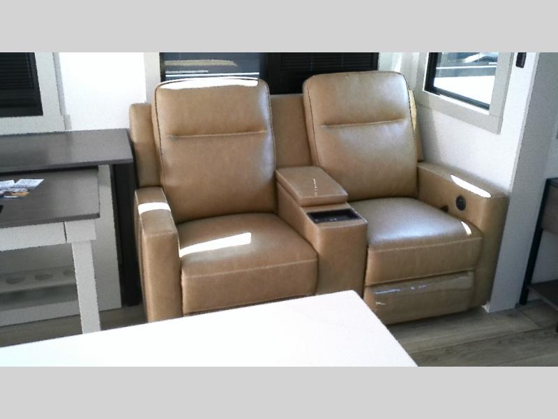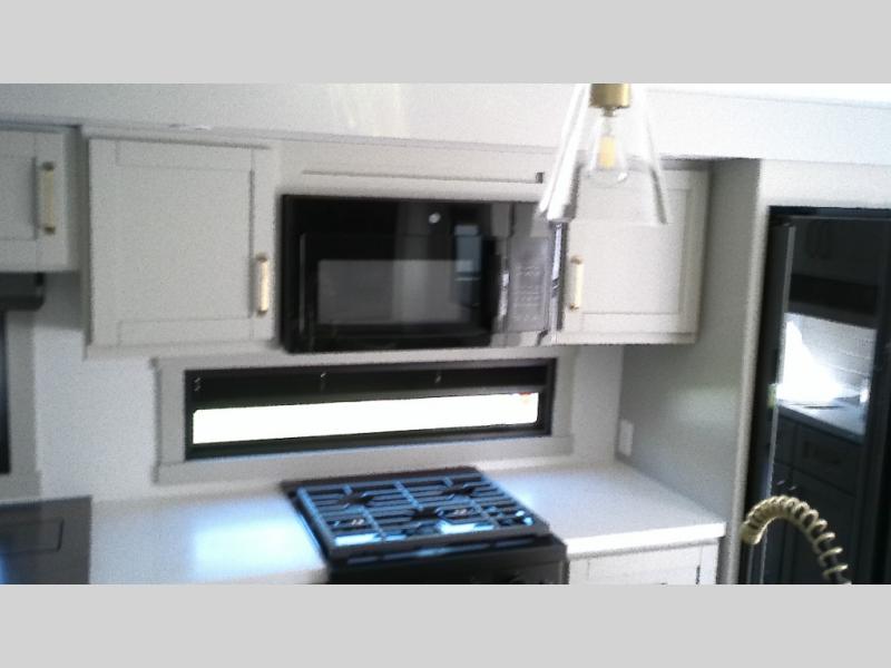 You're going to love every minute spent in this spacious fifth wheel that can sleep four. There is an inviting rear living area with a 72" tri-fold sofa and theater seating across from the televator and fireplace. The chef of your group can whip up dinner on the three burner cooktop or in the 30" residential microwave, and there is a 16 cu. ft. refrigerator that even opens when with the slide out is in. You will also enjoy the kitchen island with a farmhouse sink and roller cover, dual trash bins with a Stow N' Go paper towel holder, plus convenient dog bowls for your furry friends. You can store all your paper goods and snacks in the 84" pantry with adjustable shelving, and there is a hutch for nice dishes plus shoe storage in this model as well. Head to the front master bedroom where you'll find a queen bed with a TV, a large slide out with a wardrobe with drawers, plus a spacious bath.