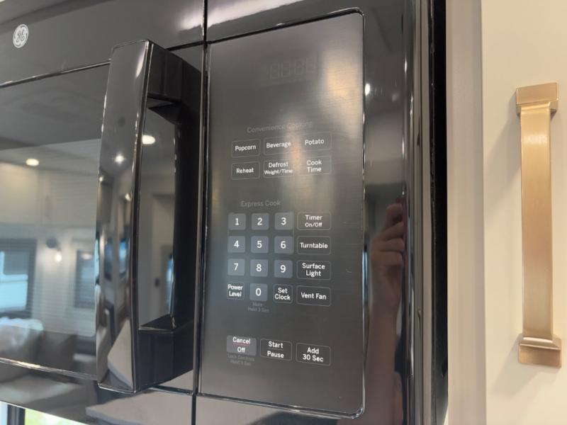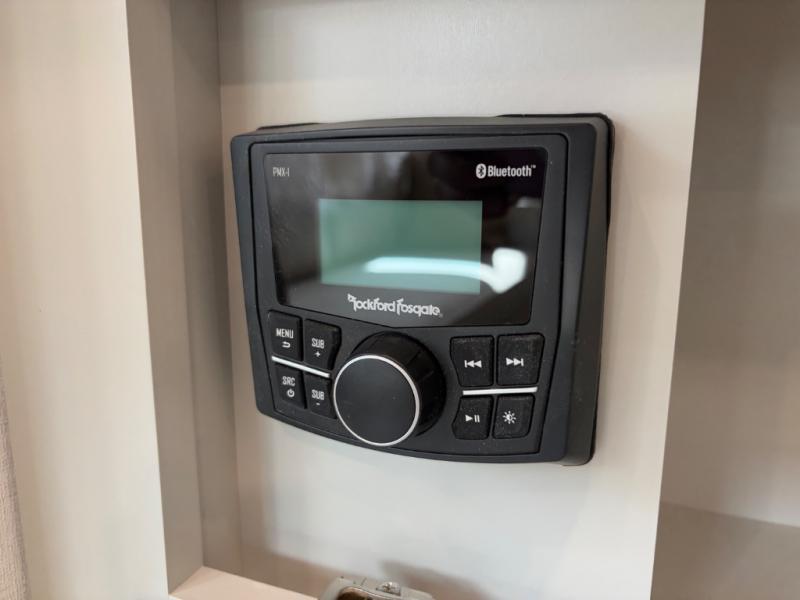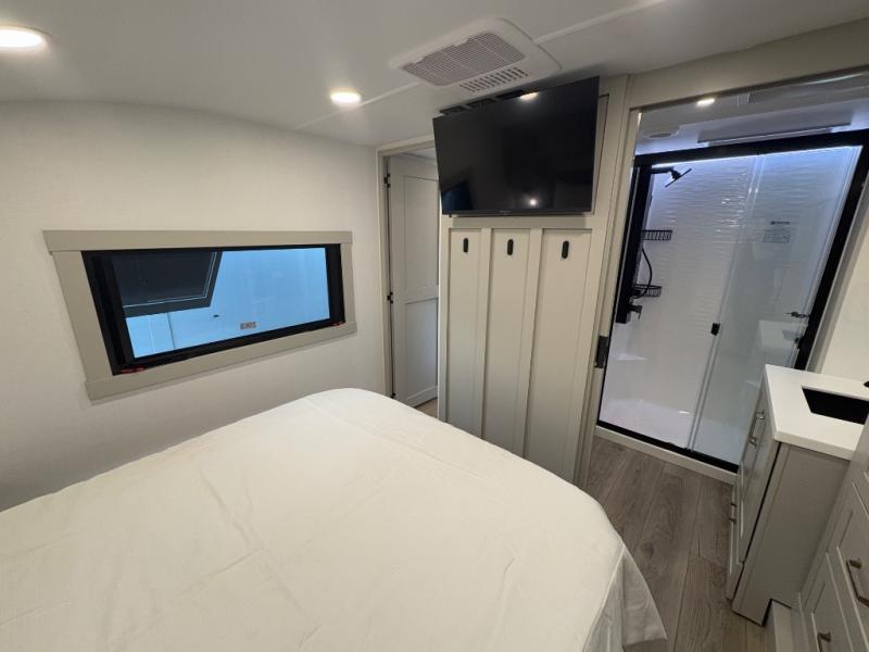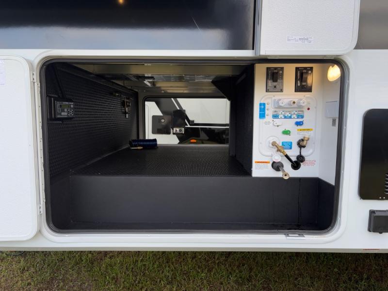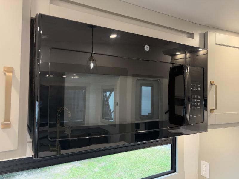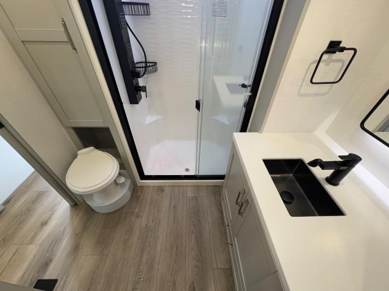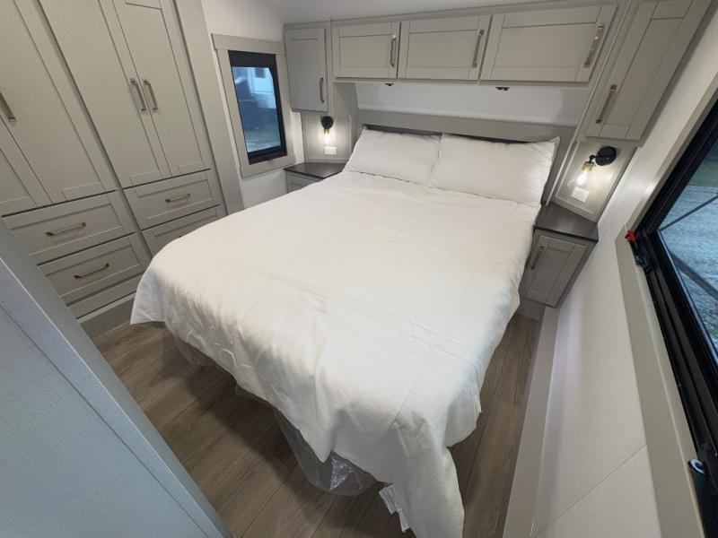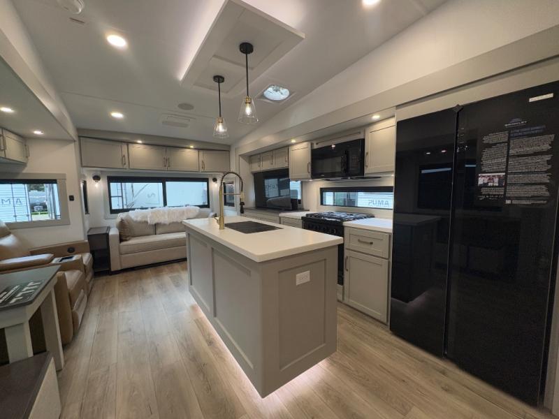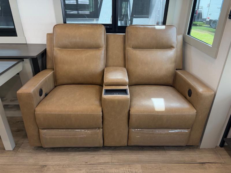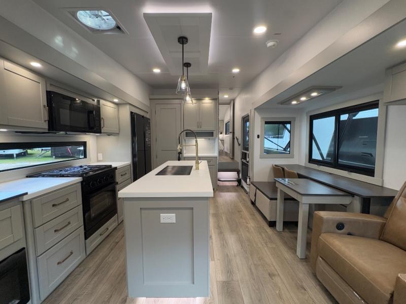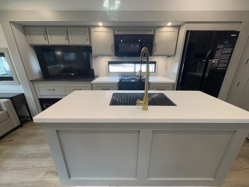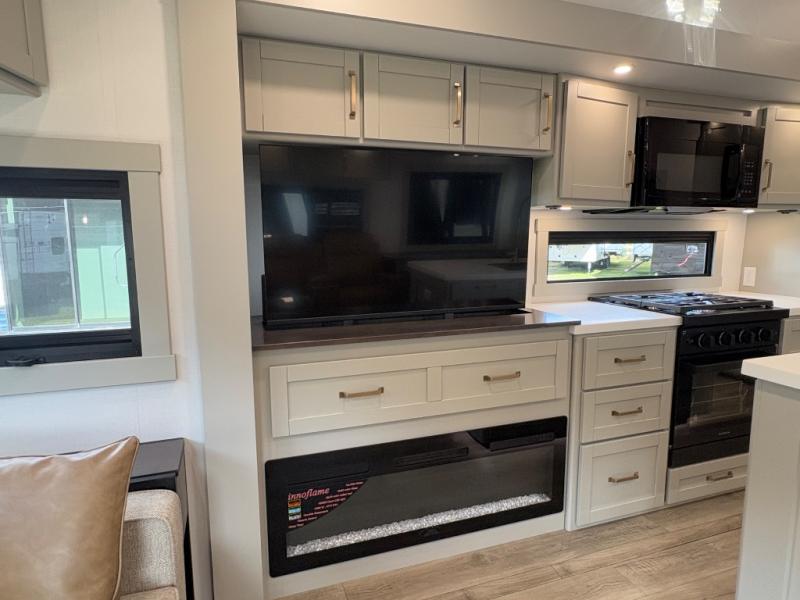 You're going to love every minute spent in this spacious fifth wheel that can sleep four. There is an inviting rear living area with a 72" tri-fold sofa and theater seating across from the televator and fireplace. The chef of your group can whip up dinner on the three burner cooktop or in the 30" residential microwave, and there is a 16 cu. ft. refrigerator that even opens when with the slide out is in. You will also enjoy the kitchen island with a farmhouse sink and roller cover, dual trash bins with a Stow N' Go paper towel holder, plus convenient dog bowls for your furry friends. You can store all your paper goods and snacks in the 84" pantry with adjustable shelving, and there is a hutch for nice dishes plus shoe storage in this model as well. Head to the front master bedroom where you'll find a queen bed with a TV, a large slide out with a wardrobe with drawers, plus a spacious bath.