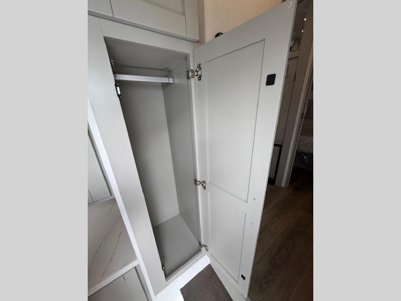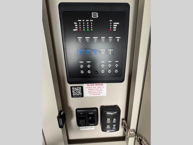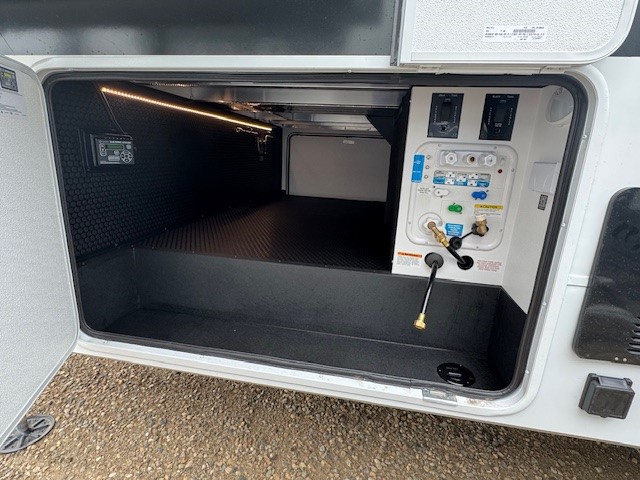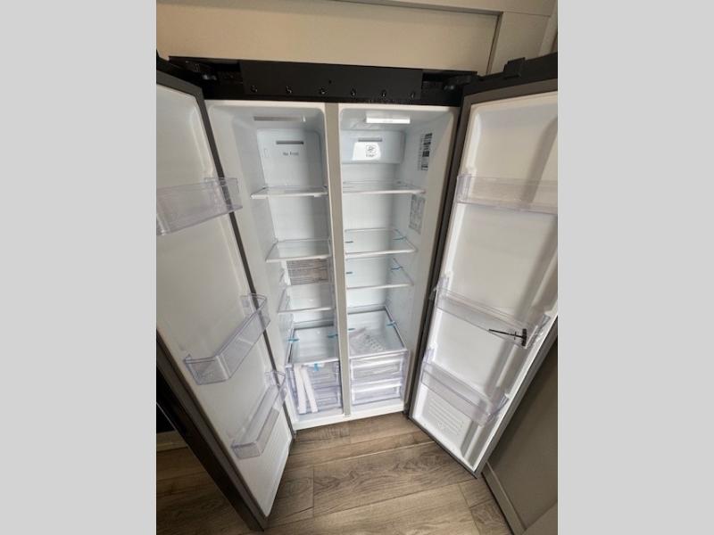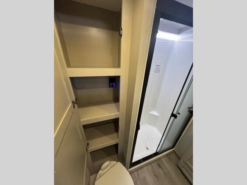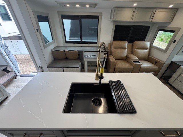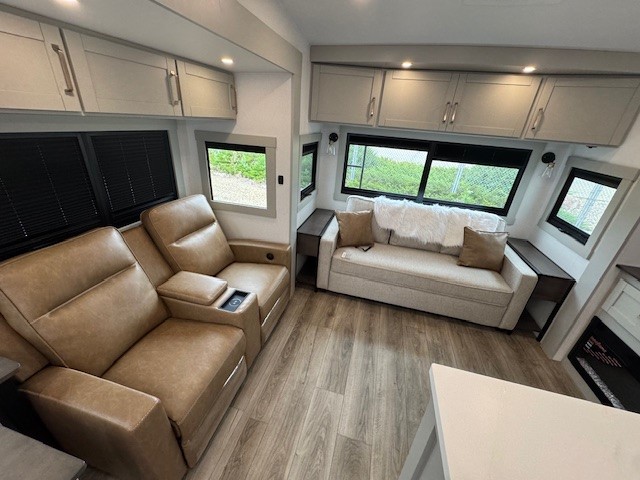 You're going to love every minute spent in this spacious fifth wheel that can sleep four. There is an inviting rear living area with a 72" tri-fold sofa and theater seating across from the televator and fireplace. The chef of your group can whip up dinner on the three burner cooktop or in the 30" residential microwave, and there is a 16 cu. ft. refrigerator that even opens when with the slide out is in. You will also enjoy the kitchen island with a farmhouse sink and roller cover, dual trash bins with a Stow N' Go paper towel holder, plus convenient dog bowls for your furry friends. You can store all your paper goods and snacks in the 84" pantry with adjustable shelving, and there is a hutch for nice dishes plus shoe storage in this model as well. Head to the front master bedroom where you'll find a queen bed with a TV, a large slide out with a wardrobe with drawers, plus a spacious bath.
