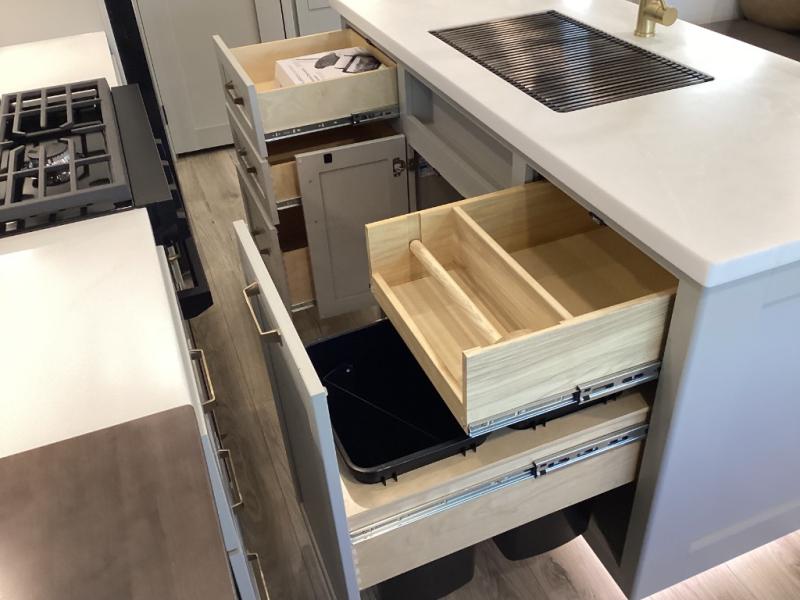 Central island with steel base, farmhouse sink, built-in spice rack, dual trash bins, roll-out pet dishes, and a massive 84? adjustable pantry—crafted for convenience and culinary flexibility. -