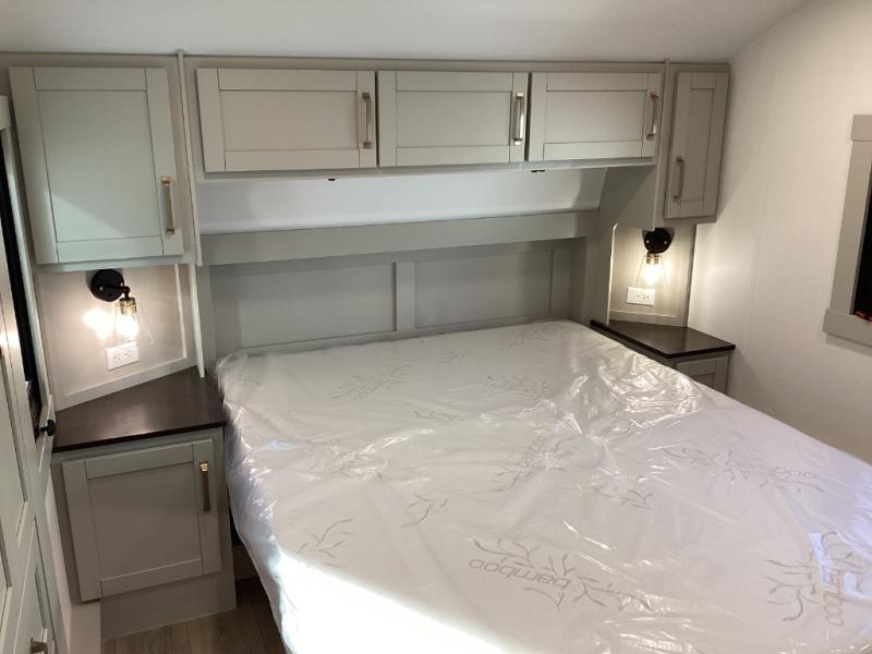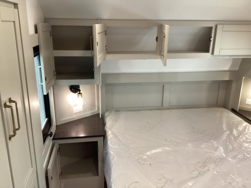 Enjoy a cozy queen suite with memory foam mattress, LED-lit storage, and a residential-style shower—with seamless access through a walkthrough bath. -