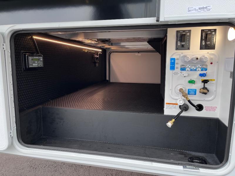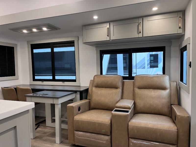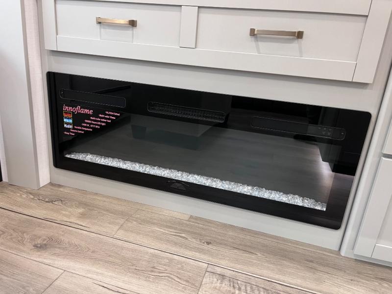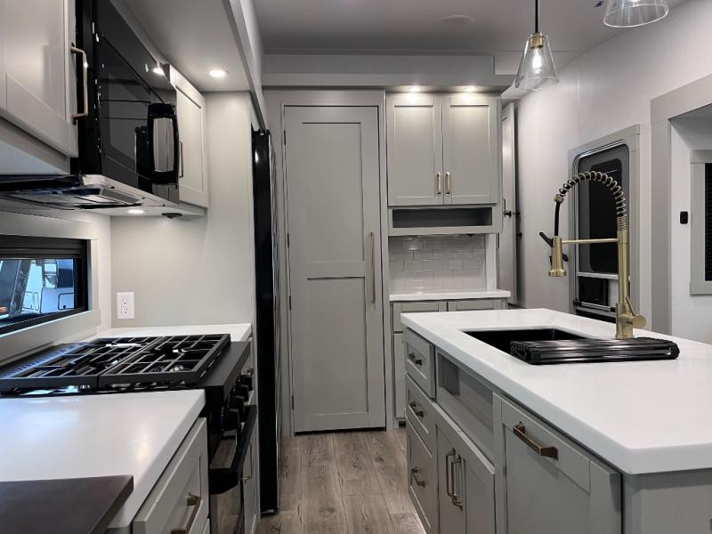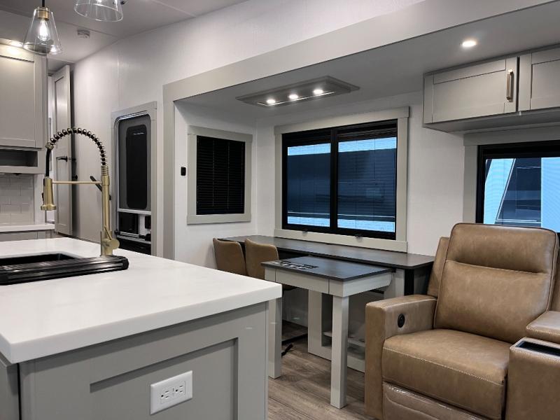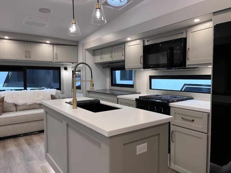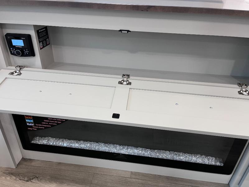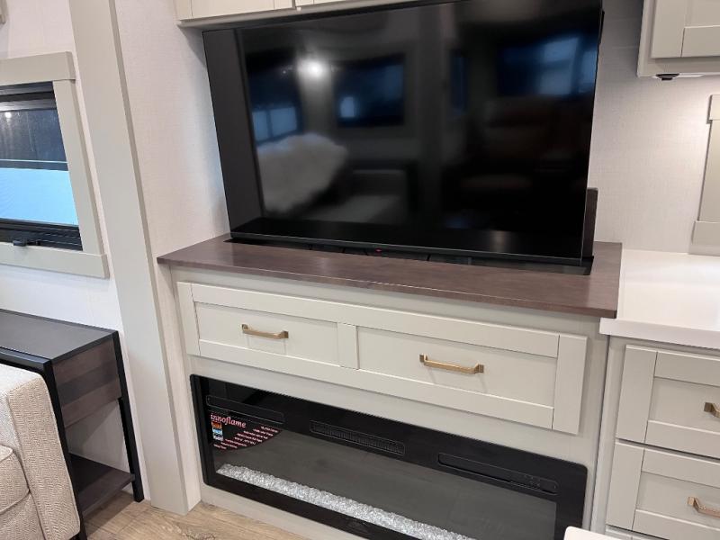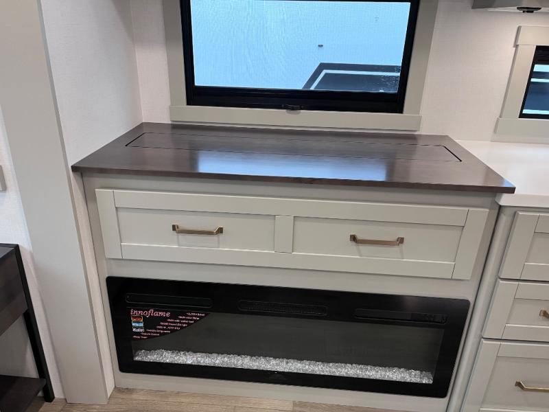 You're going to love every minute spent in this spacious fifth wheel that can sleep four. There is an inviting rear living area with a 72" tri-fold sofa and theater seating across from the televator and fireplace. The chef of your group can whip up dinner on the three burner cooktop or in the 30" residential microwave, and there is a 16 cu. ft. refrigerator that even opens when with the slide out is in. You will also enjoy the kitchen island with a farmhouse sink and roller cover, dual trash bins with a Stow N' Go paper towel holder, plus convenient dog bowls for your furry friends. You can store all your paper goods and snacks in the 84" pantry with adjustable shelving, and there is a hutch for nice dishes plus shoe storage in this model as well. Head to the front master bedroom where you'll find a queen bed with a TV, a large slide out with a wardrobe with drawers, plus a spacious bath.