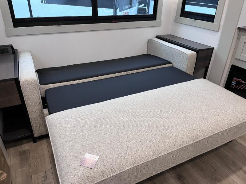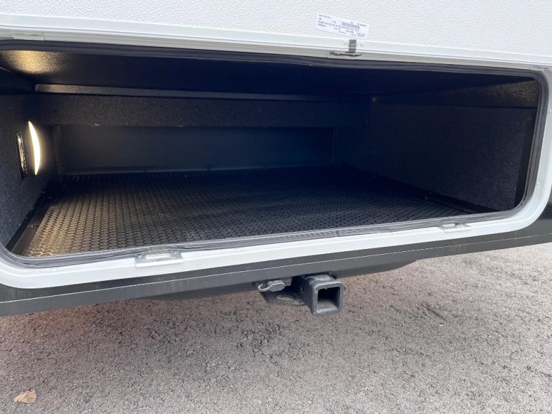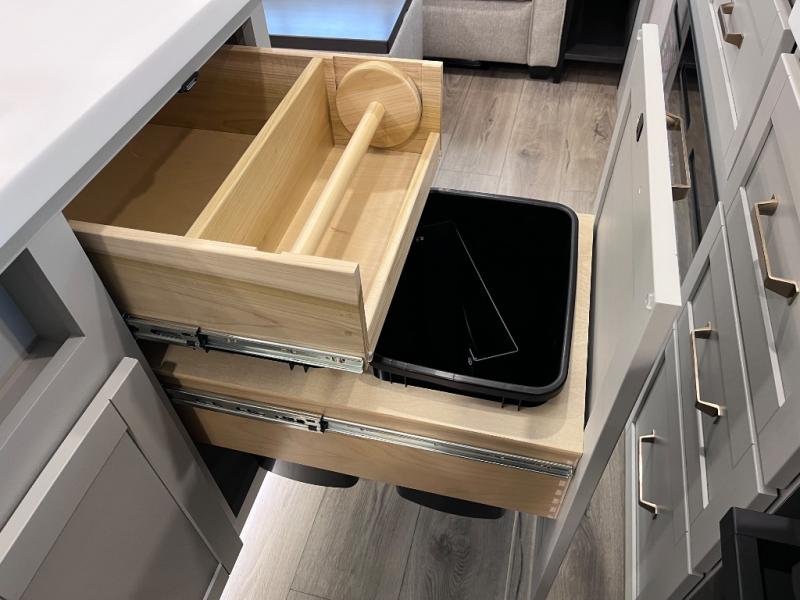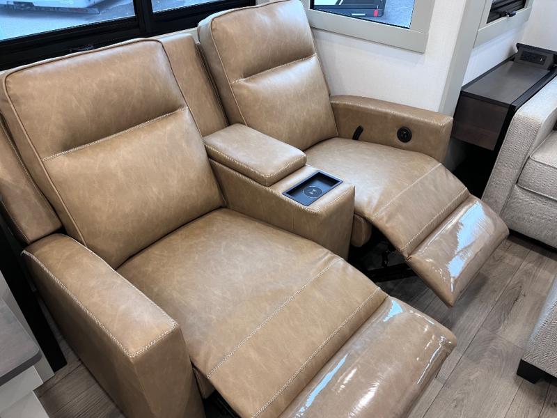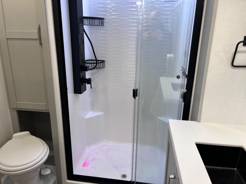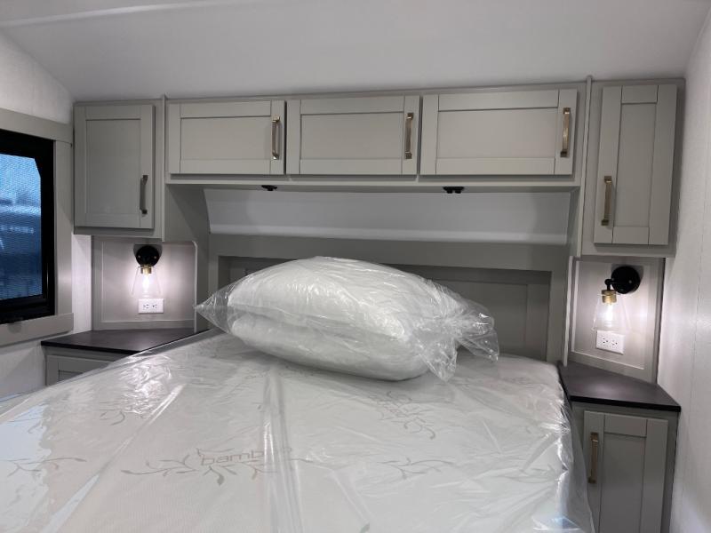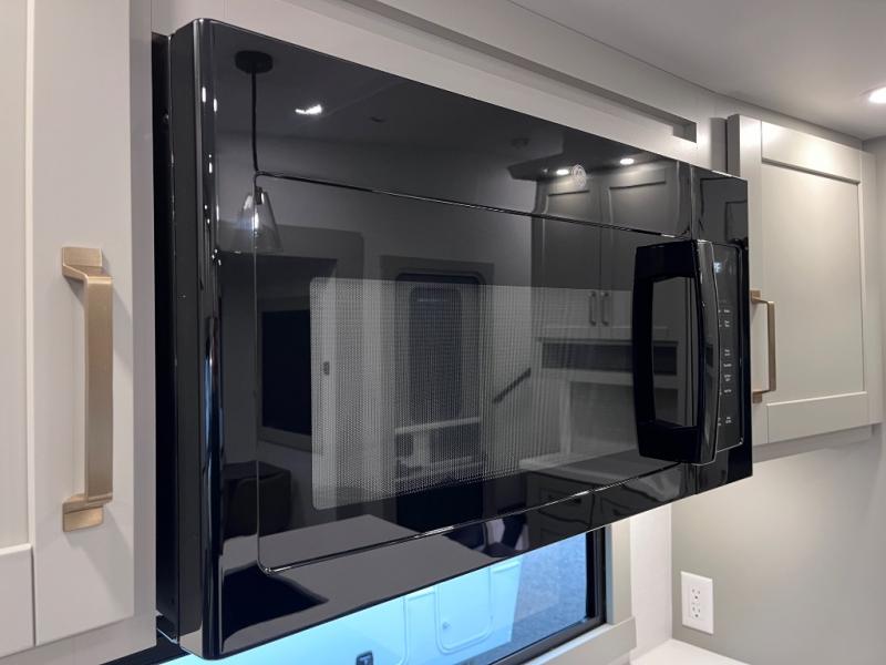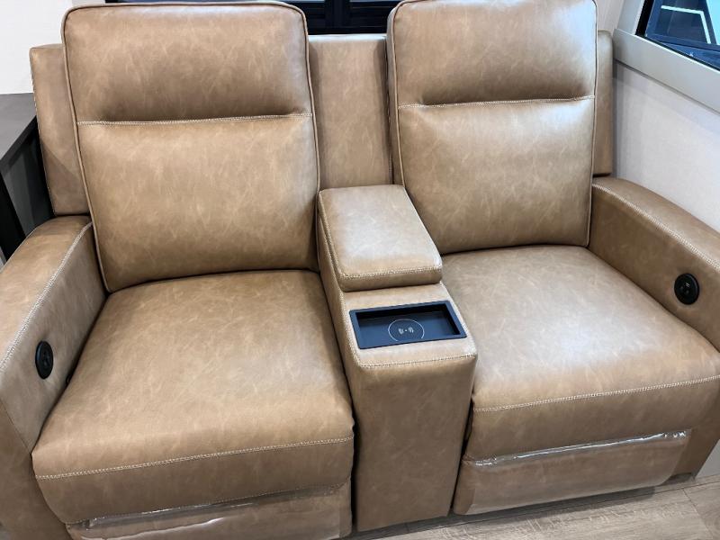 You're going to love every minute spent in this spacious fifth wheel that can sleep four. There is an inviting rear living area with a 72" tri-fold sofa and theater seating across from the televator and fireplace. The chef of your group can whip up dinner on the three burner cooktop or in the 30" residential microwave, and there is a 16 cu. ft. refrigerator that even opens when with the slide out is in. You will also enjoy the kitchen island with a farmhouse sink and roller cover, dual trash bins with a Stow N' Go paper towel holder, plus convenient dog bowls for your furry friends. You can store all your paper goods and snacks in the 84" pantry with adjustable shelving, and there is a hutch for nice dishes plus shoe storage in this model as well. Head to the front master bedroom where you'll find a queen bed with a TV, a large slide out with a wardrobe with drawers, plus a spacious bath.