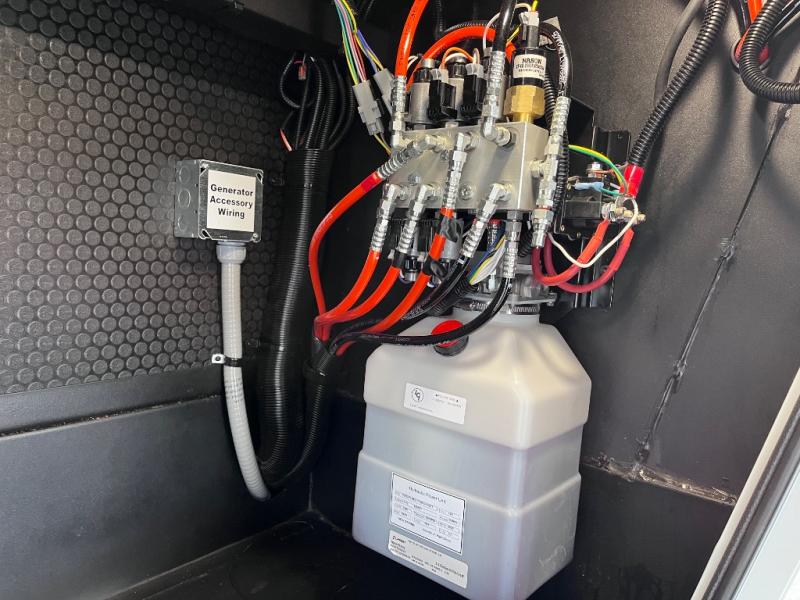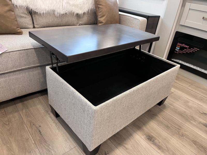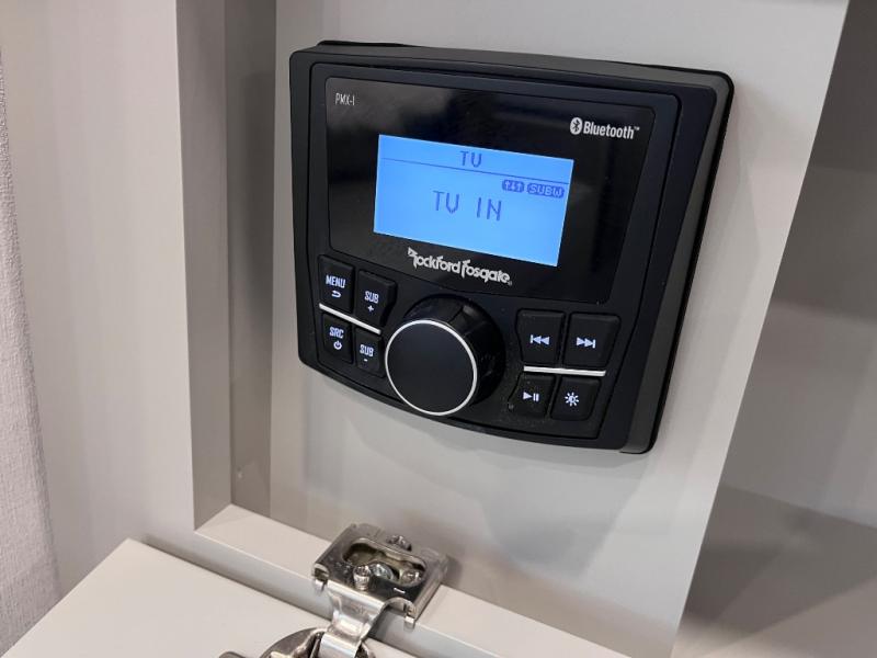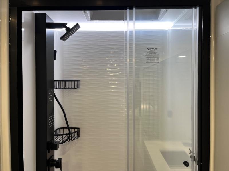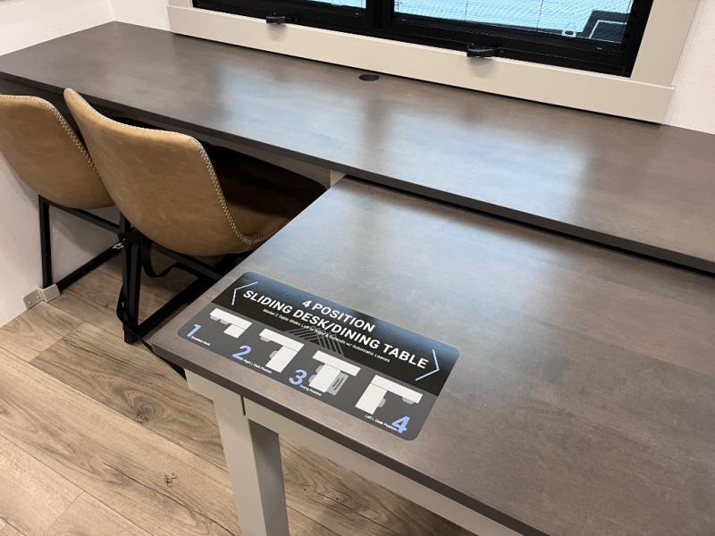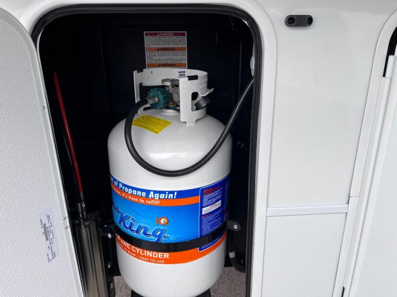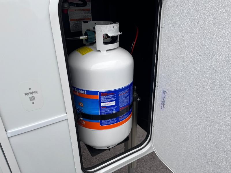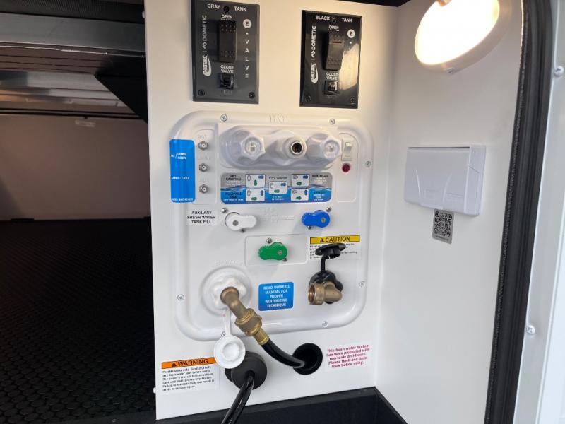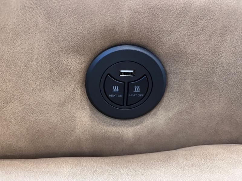You're going to love every minute spent in this spacious fifth wheel that can sleep four. There is an inviting rear living area with a 72" tri-fold sofa and theater seating across from the televator and fireplace. The chef of your group can whip up dinner on the three burner cooktop or in the 30" residential microwave, and there is a 16 cu. ft. refrigerator that even opens when with the slide out is in. You will also enjoy the kitchen island with a farmhouse sink and roller cover, dual trash bins with a Stow N' Go paper towel holder, plus convenient dog bowls for your furry friends. You can store all your paper goods and snacks in the 84" pantry with adjustable shelving, and there is a hutch for nice dishes plus shoe storage in this model as well. Head to the front master bedroom where you'll find a queen bed with a TV, a large slide out with a wardrobe with drawers, plus a spacious bath.