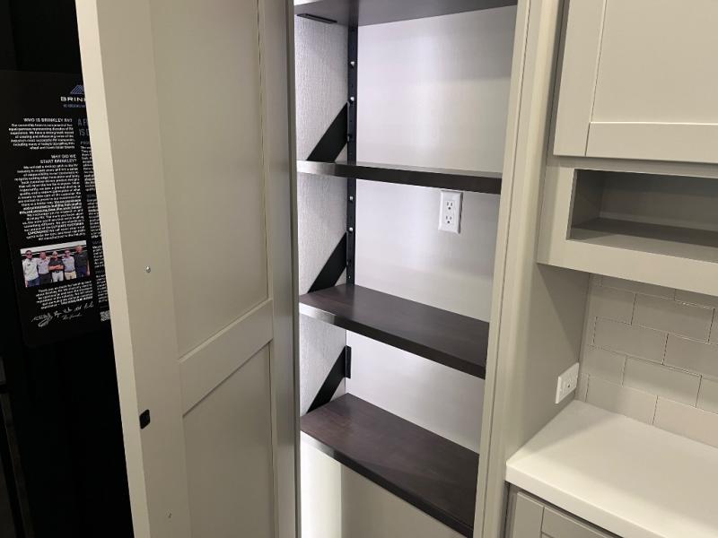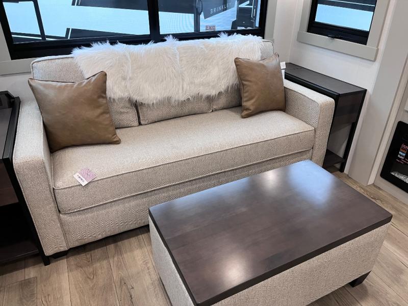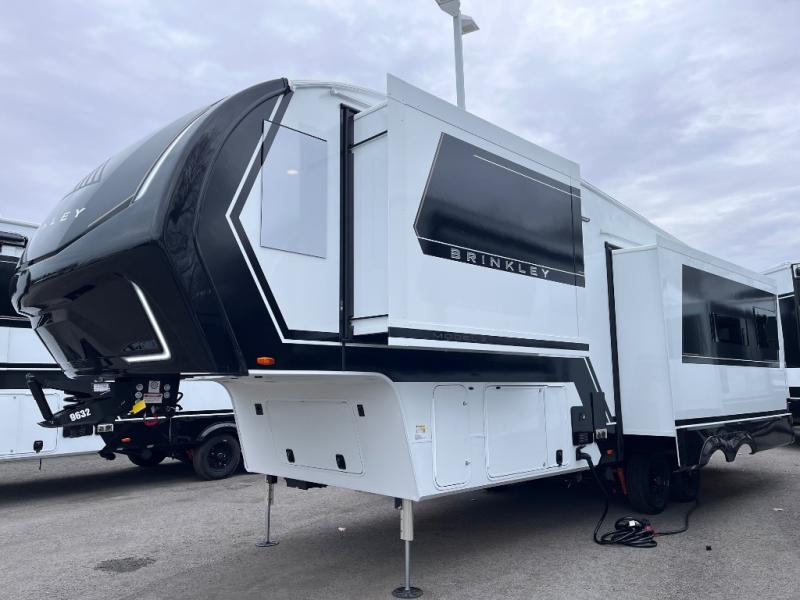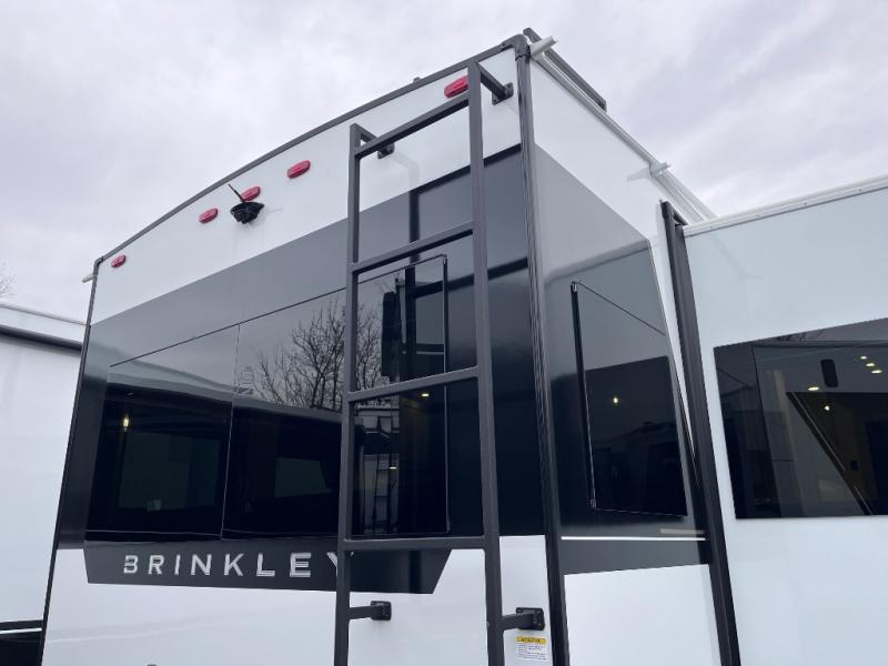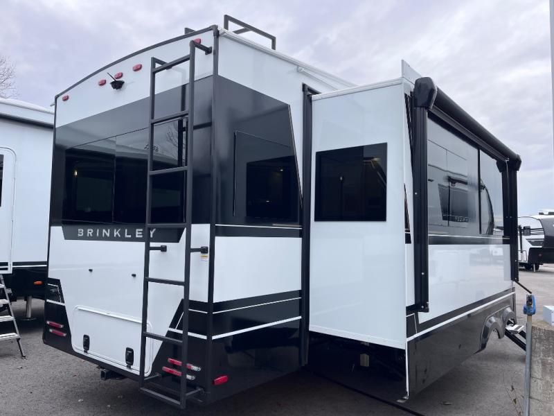 The Brinkley mid-profile Model Z fifth wheels bring you clean lines and an upscale look with plenty of style and exciting new features like the industry first brass plumbing connections. These units also feature an automotive grade front cap, plenty of exterior storage, dual exterior hot and cold showers, and wide stance leveling jacks for easy set up. Residential frameless windows provide a clean look and beautiful views, and ample electrical outlets and USB/USB-C outlets allow all of your electronics and appliances to easily be used and charged.