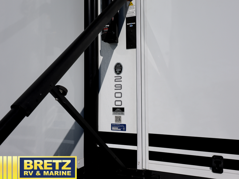 You're going to love every minute spent in this spacious fifth wheel that can sleep four. There is an inviting rear living area with a 72" tri-fold sofa and theater seating across from the televator and fireplace. The chef of your group can whip up dinner on the three burner cooktop or in the 30" residential microwave, and there is a 16 cu. ft. refrigerator that even opens when with the slide out is in. You will also enjoy the kitchen island with a farmhouse sink and roller cover, dual trash bins with a Stow N' Go paper towel holder, plus convenient dog bowls for your furry friends. You can store all your paper goods and snacks in the 84" pantry with adjustable shelving, and there is a hutch for nice dishes plus shoe storage in this model as well. Head to the front master bedroom where you'll find a queen bed with a TV, a large slide out with a wardrobe with drawers, plus a spacious bath.