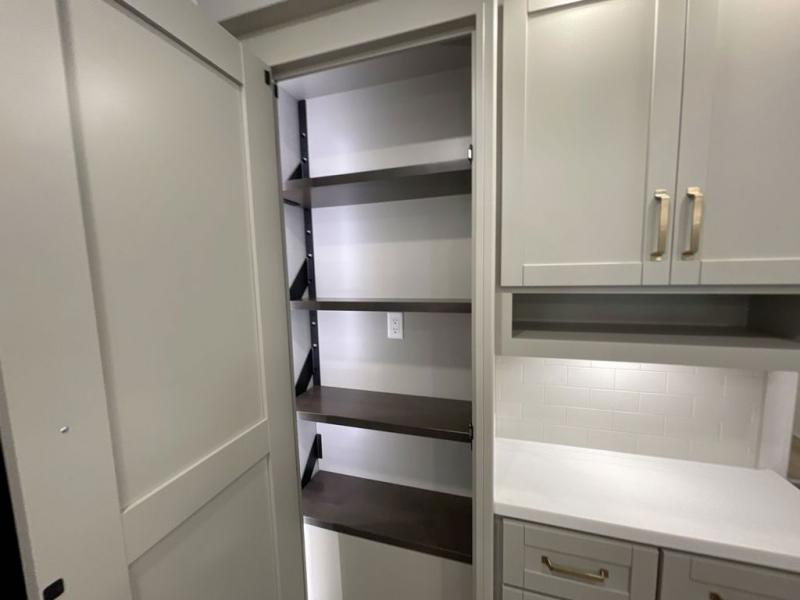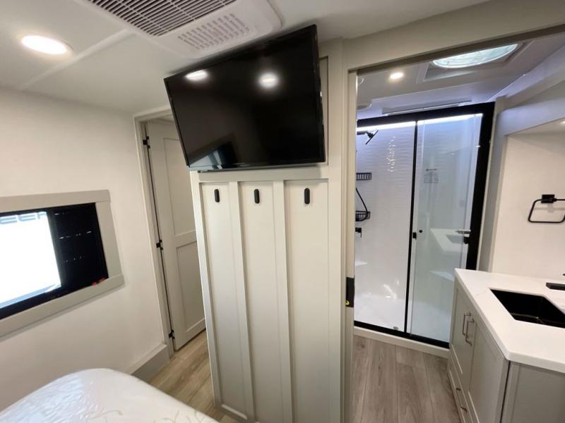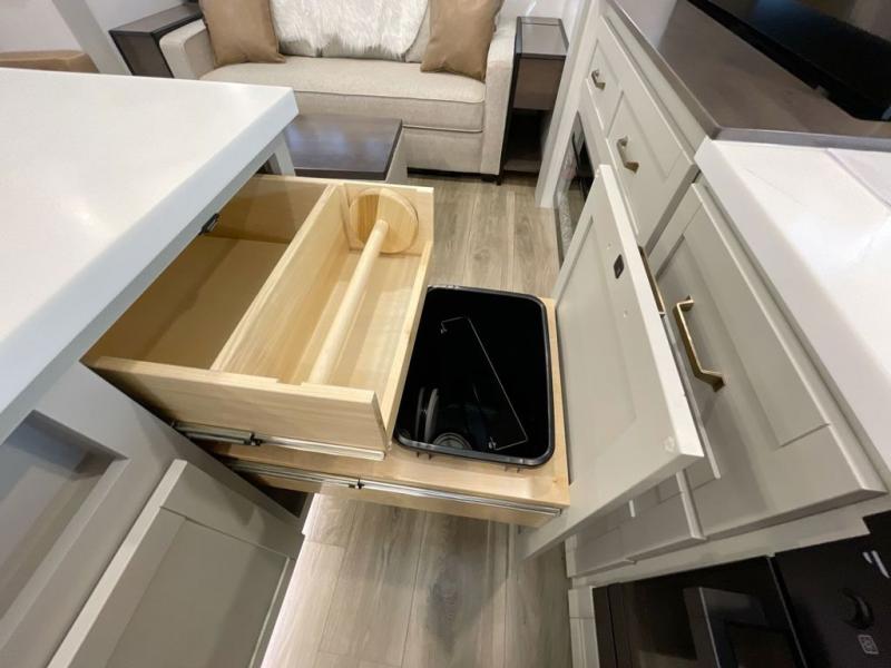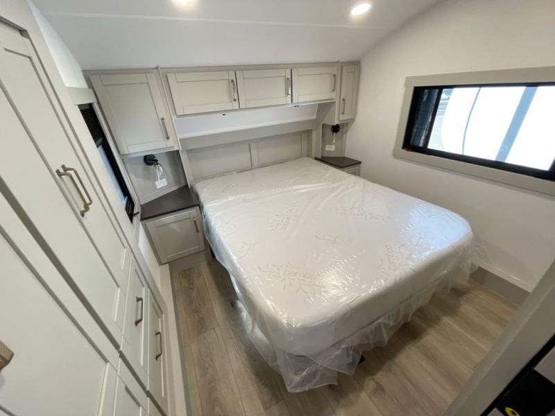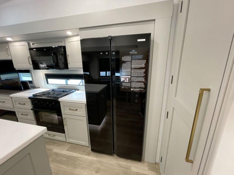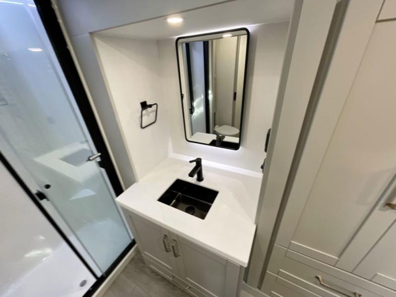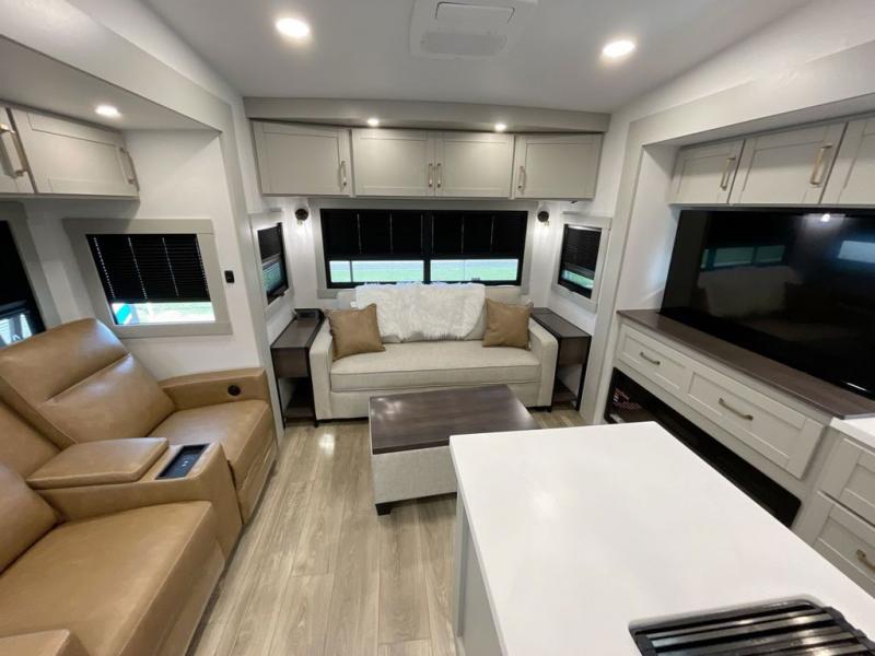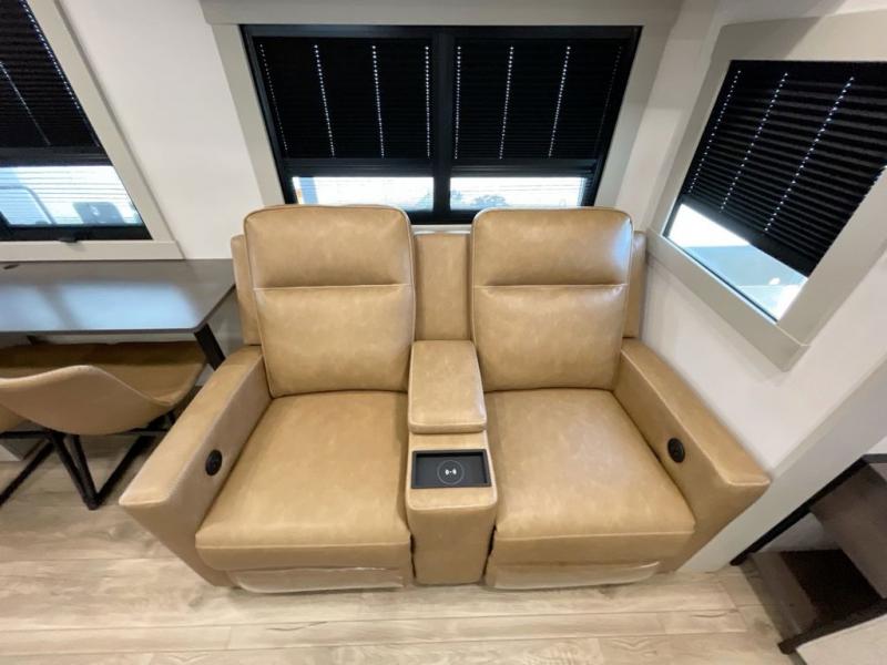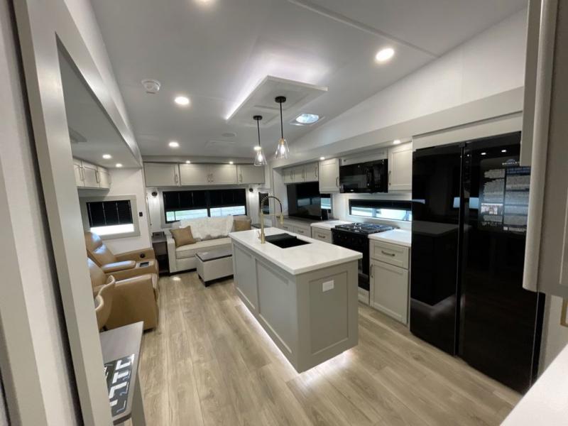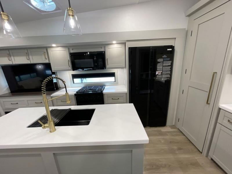 You're going to love every minute spent in this spacious fifth wheel that can sleep four. There is an inviting rear living area with a 72" tri-fold sofa and theater seating across from the televator and fireplace. The chef of your group can whip up dinner on the three burner cooktop or in the 30" residential microwave, and there is a 16 cu. ft. refrigerator that even opens when with the slide out is in. You will also enjoy the kitchen island with a farmhouse sink and roller cover, dual trash bins with a Stow N' Go paper towel holder, plus convenient dog bowls for your furry friends. You can store all your paper goods and snacks in the 84" pantry with adjustable shelving, and there is a hutch for nice dishes plus shoe storage in this model as well. Head to the front master bedroom where you'll find a queen bed with a TV, a large slide out with a wardrobe with drawers, plus a spacious bath.
