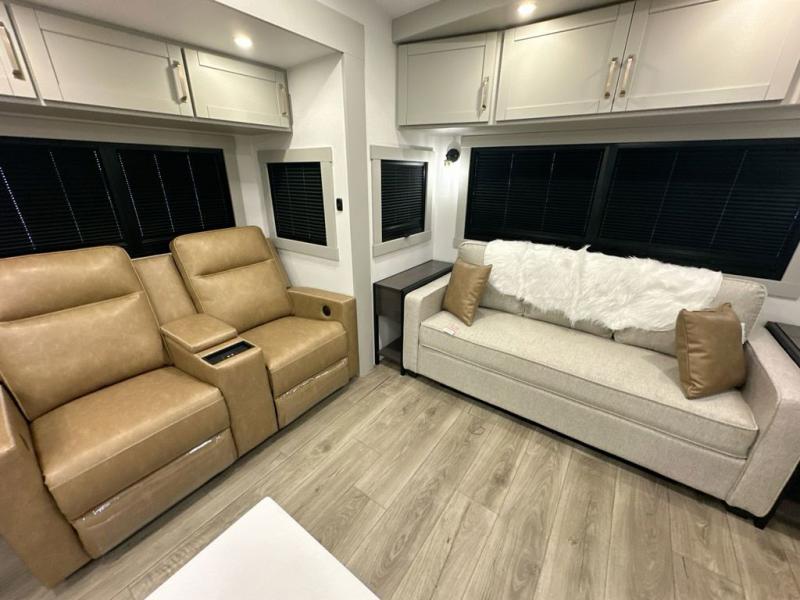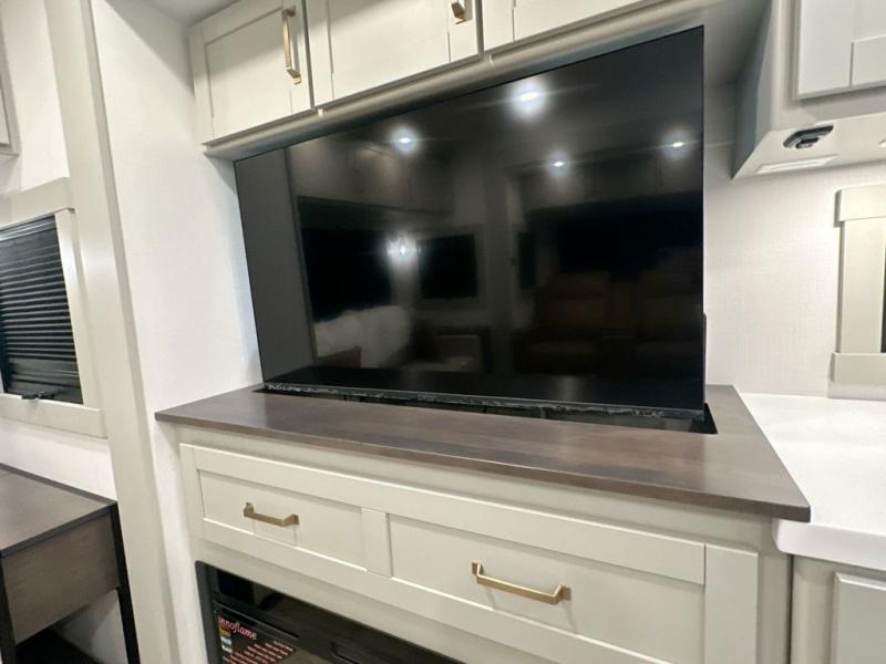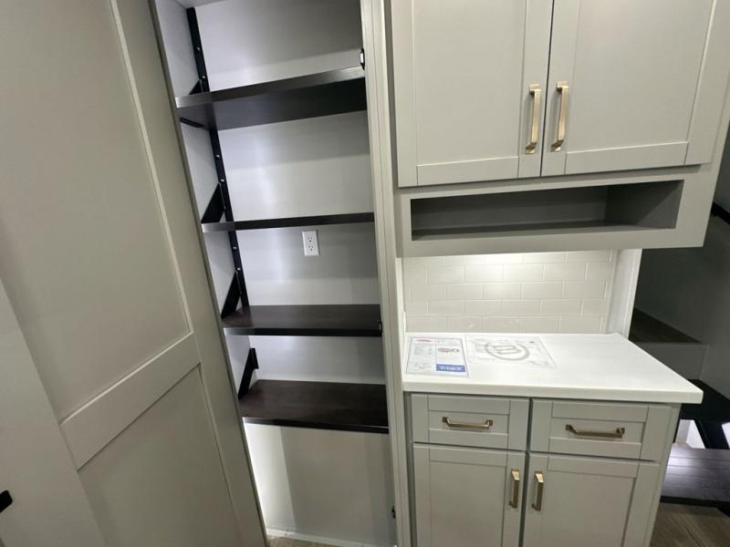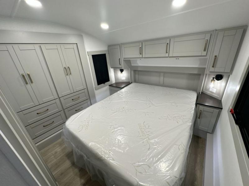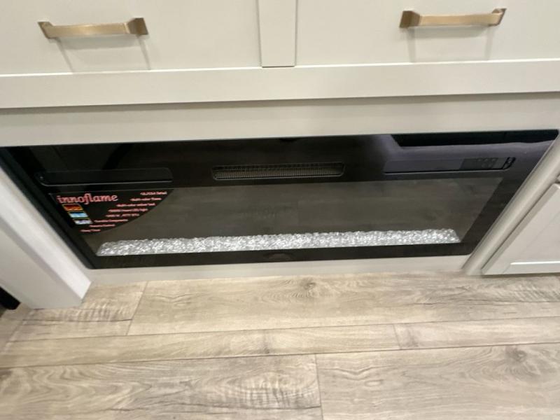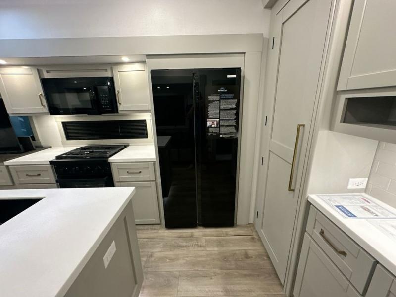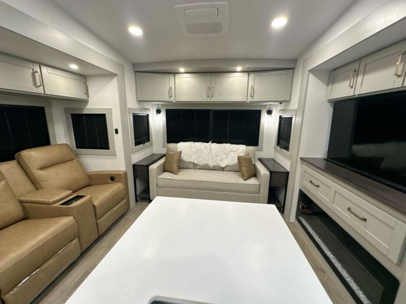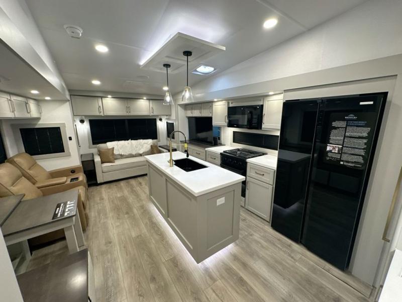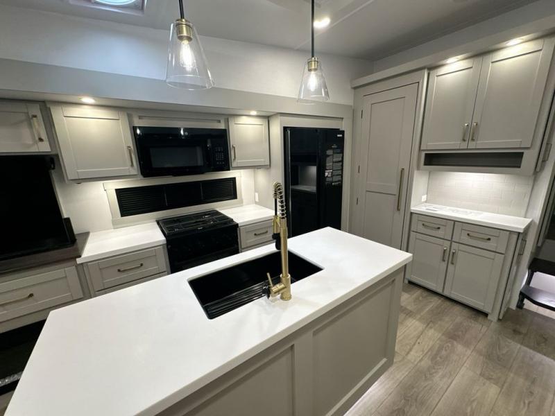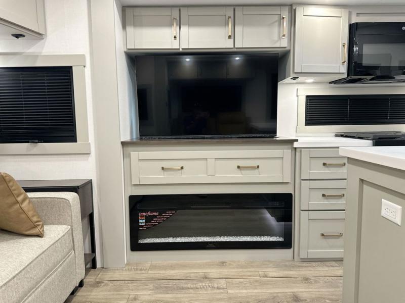 You're going to love every minute spent in this spacious fifth wheel that can sleep four. There is an inviting rear living area with a 72" tri-fold sofa and theater seating across from the televator and fireplace. The chef of your group can whip up dinner on the three burner cooktop or in the 30" residential microwave, and there is a 16 cu. ft. refrigerator that even opens when with the slide out is in. You will also enjoy the kitchen island with a farmhouse sink and roller cover, dual trash bins with a Stow N' Go paper towel holder, plus convenient dog bowls for your furry friends. You can store all your paper goods and snacks in the 84" pantry with adjustable shelving, and there is a hutch for nice dishes plus shoe storage in this model as well. Head to the front master bedroom where you'll find a queen bed with a TV, a large slide out with a wardrobe with drawers, plus a spacious bath.