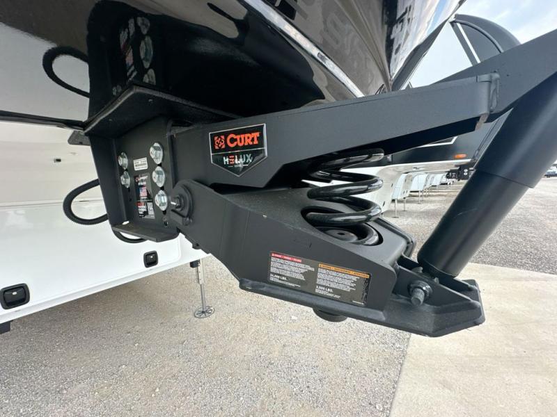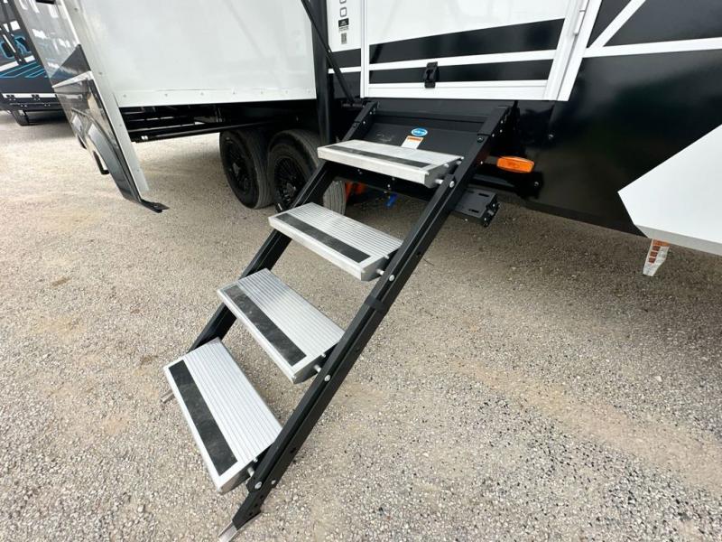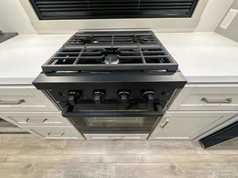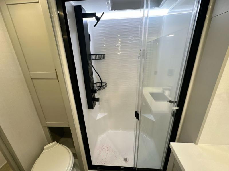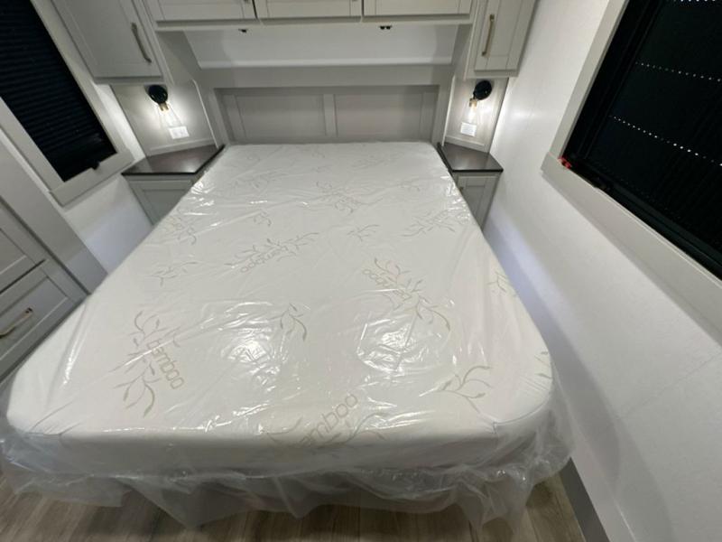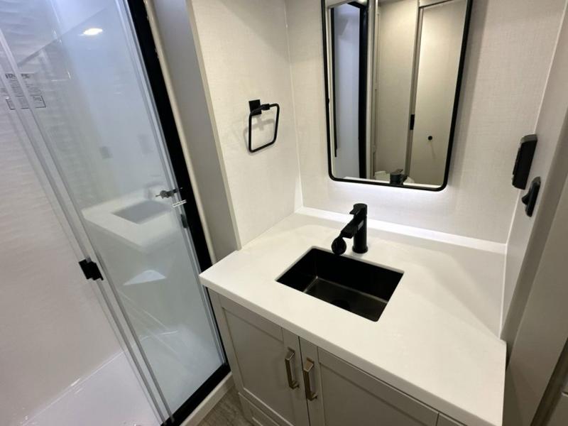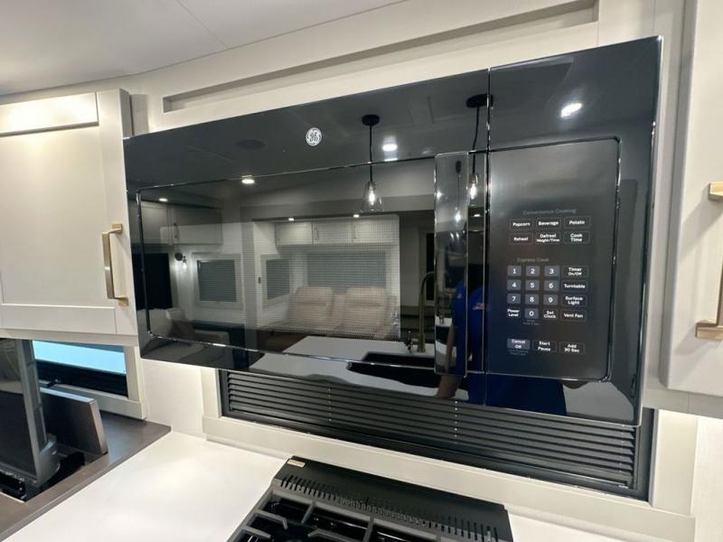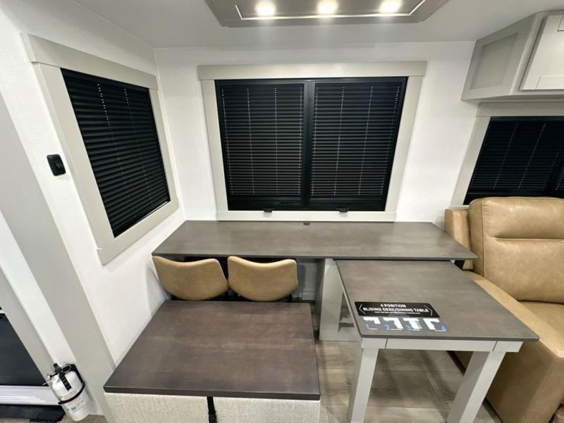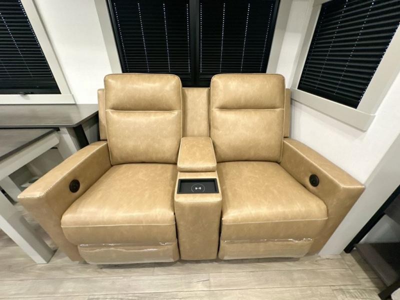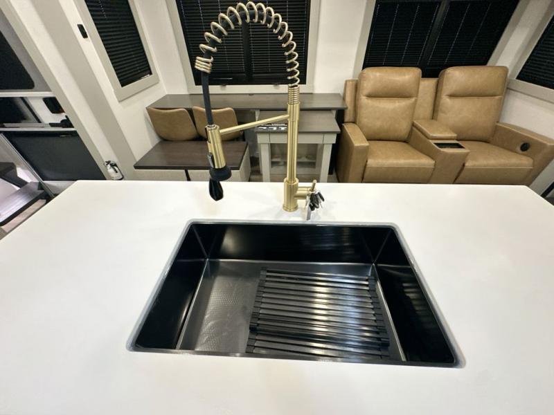 You're going to love every minute spent in this spacious fifth wheel that can sleep four. There is an inviting rear living area with a 72" tri-fold sofa and theater seating across from the televator and fireplace. The chef of your group can whip up dinner on the three burner cooktop or in the 30" residential microwave, and there is a 16 cu. ft. refrigerator that even opens when with the slide out is in. You will also enjoy the kitchen island with a farmhouse sink and roller cover, dual trash bins with a Stow N' Go paper towel holder, plus convenient dog bowls for your furry friends. You can store all your paper goods and snacks in the 84" pantry with adjustable shelving, and there is a hutch for nice dishes plus shoe storage in this model as well. Head to the front master bedroom where you'll find a queen bed with a TV, a large slide out with a wardrobe with drawers, plus a spacious bath.