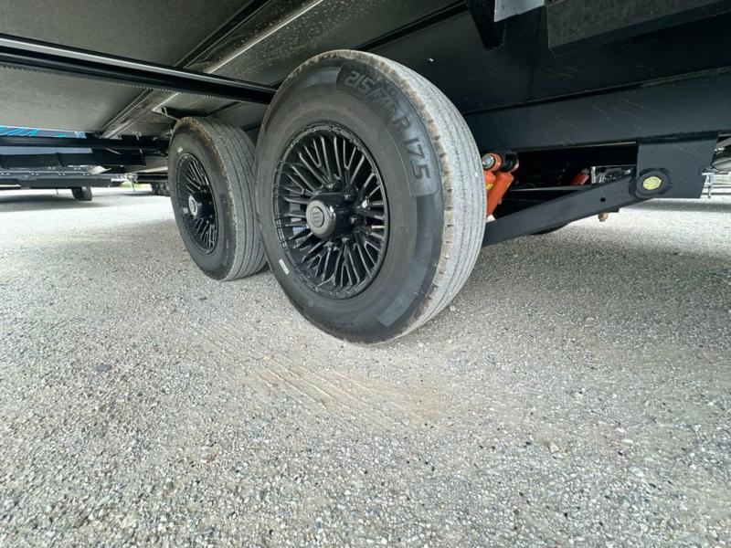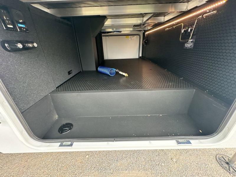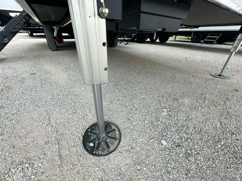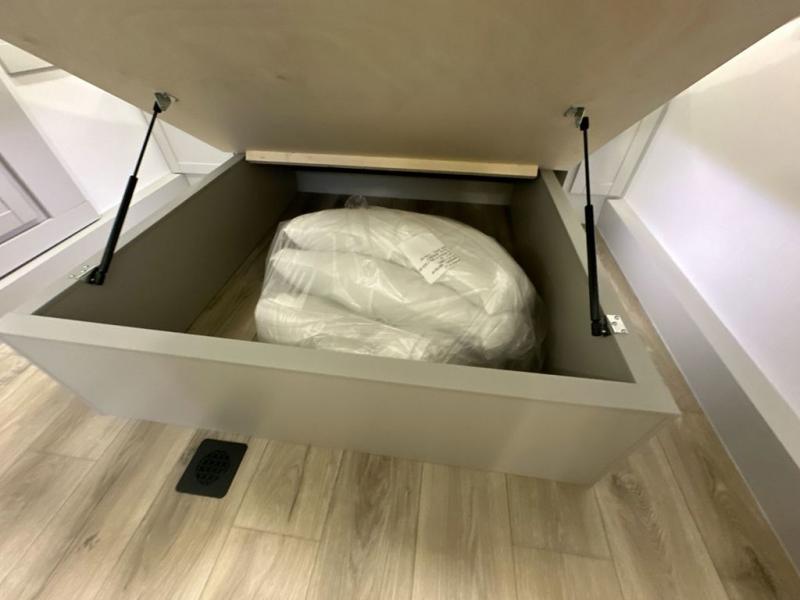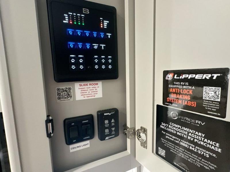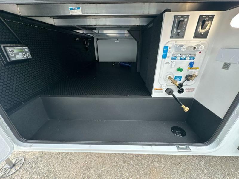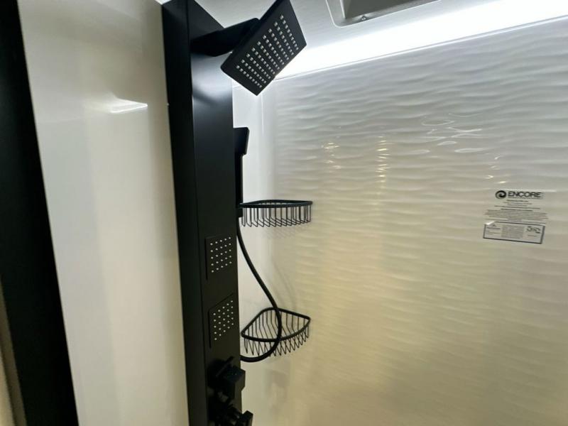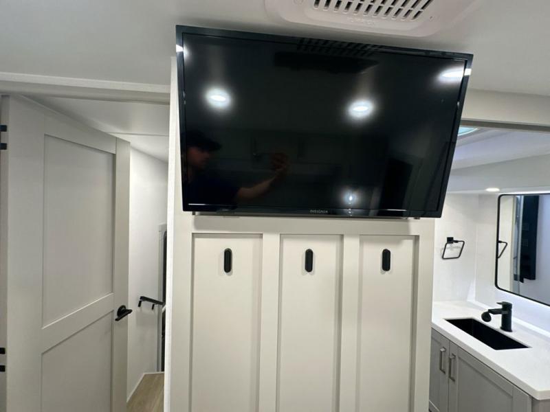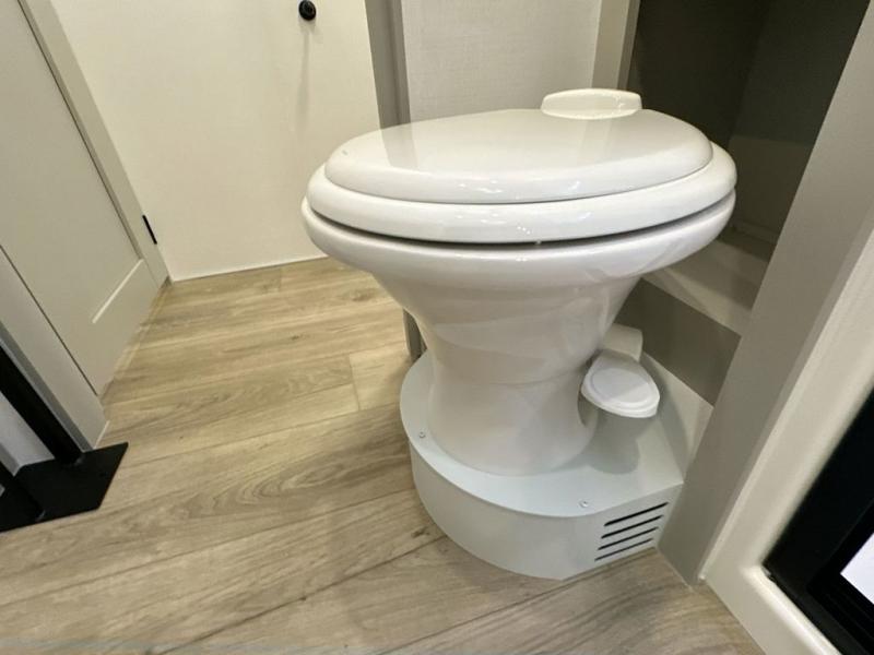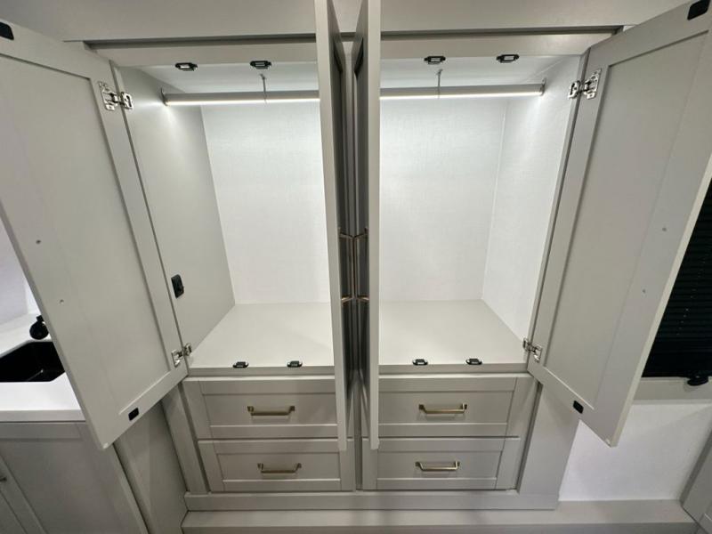 You're going to love every minute spent in this spacious fifth wheel that can sleep four. There is an inviting rear living area with a 72" tri-fold sofa and theater seating across from the televator and fireplace. The chef of your group can whip up dinner on the three burner cooktop or in the 30" residential microwave, and there is a 16 cu. ft. refrigerator that even opens when with the slide out is in. You will also enjoy the kitchen island with a farmhouse sink and roller cover, dual trash bins with a Stow N' Go paper towel holder, plus convenient dog bowls for your furry friends. You can store all your paper goods and snacks in the 84" pantry with adjustable shelving, and there is a hutch for nice dishes plus shoe storage in this model as well. Head to the front master bedroom where you'll find a queen bed with a TV, a large slide out with a wardrobe with drawers, plus a spacious bath.