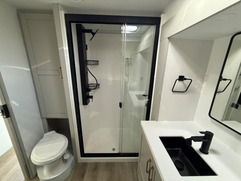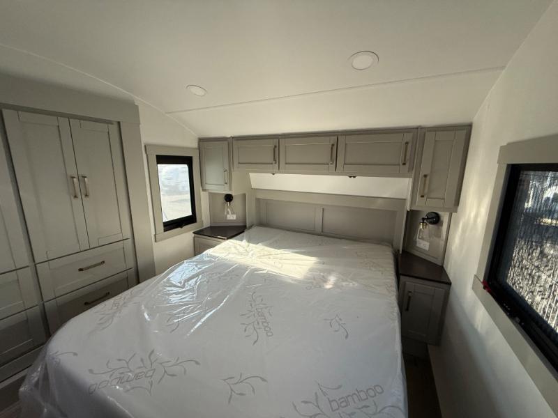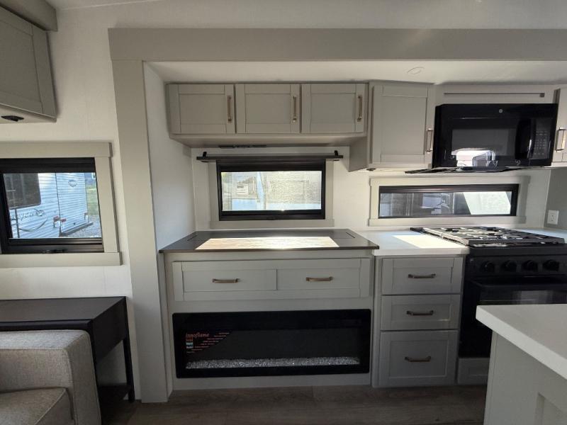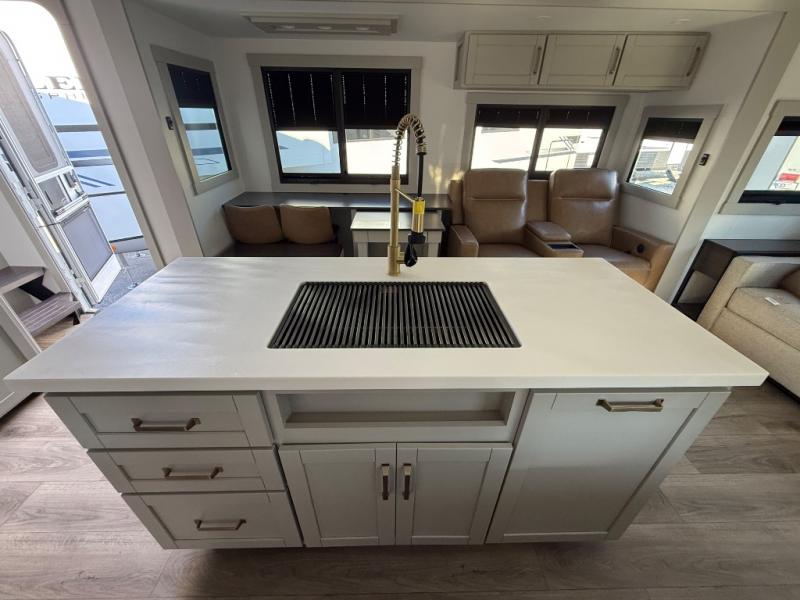 You're going to love every minute spent in this spacious fifth wheel that can sleep four. There is an inviting rear living area with a 72" tri-fold sofa and theater seating across from the televator and fireplace. The chef of your group can whip up dinner on the three burner cooktop or in the 30" residential microwave, and there is a 16 cu. ft. refrigerator that even opens when with the slide out is in. You will also enjoy the kitchen island with a farmhouse sink and roller cover, dual trash bins with a Stow N' Go paper towel holder, plus convenient dog bowls for your furry friends. You can store all your paper goods and snacks in the 84" pantry with adjustable shelving, and there is a hutch for nice dishes plus shoe storage in this model as well. Head to the front master bedroom where you'll find a queen bed with a TV, a large slide out with a wardrobe with drawers, plus a spacious bath.