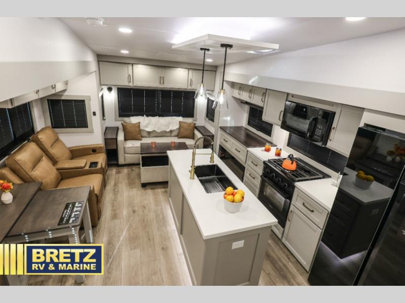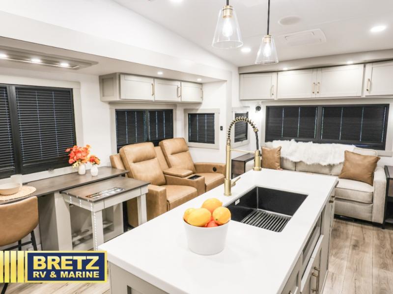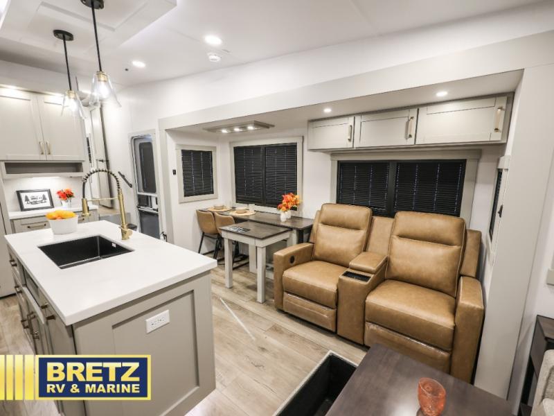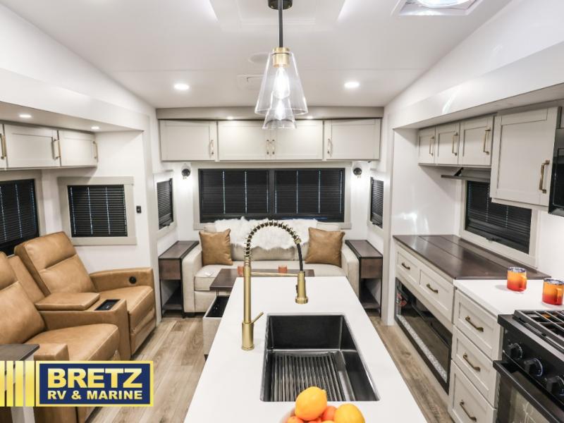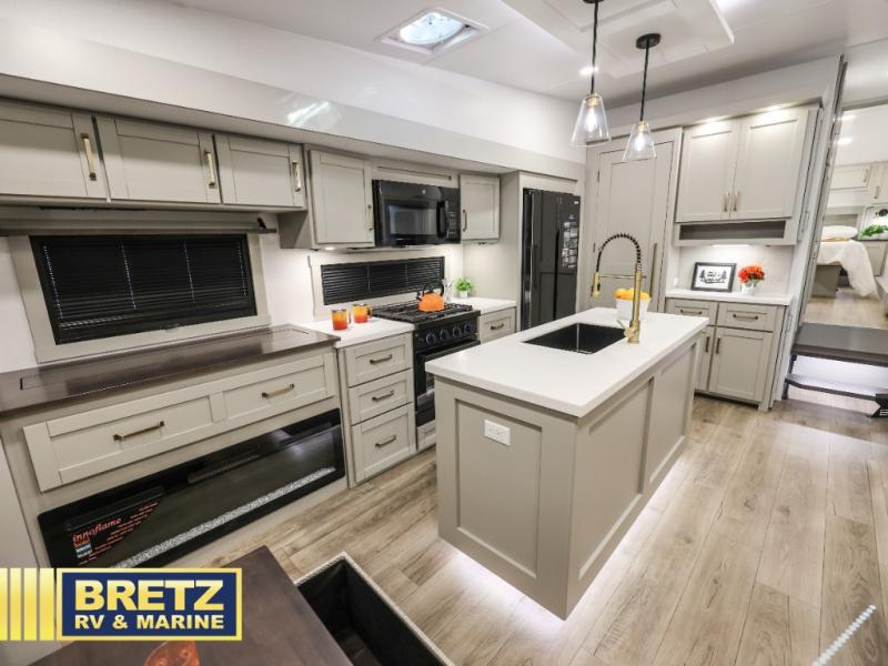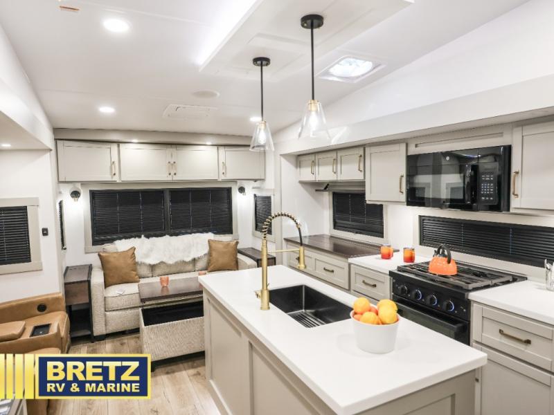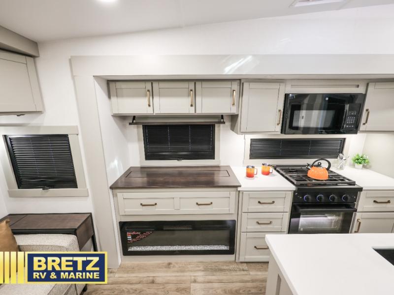 You're going to love every minute spent in this spacious fifth wheel that can sleep four. There is an inviting rear living area with a 72" tri-fold sofa and theater seating across from the televator and fireplace. The chef of your group can whip up dinner on the three burner cooktop or in the 30" residential microwave, and there is a 16 cu. ft. refrigerator that even opens when with the slide out is in. You will also enjoy the kitchen island with a farmhouse sink and roller cover, dual trash bins with a Stow N' Go paper towel holder, plus convenient dog bowls for your furry friends. You can store all your paper goods and snacks in the 84" pantry with adjustable shelving, and there is a hutch for nice dishes plus shoe storage in this model as well. Head to the front master bedroom where you'll find a queen bed with a TV, a large slide out with a wardrobe with drawers, plus a spacious bath.