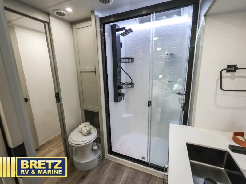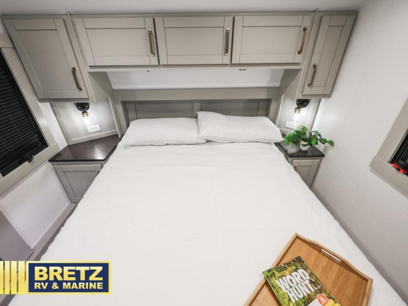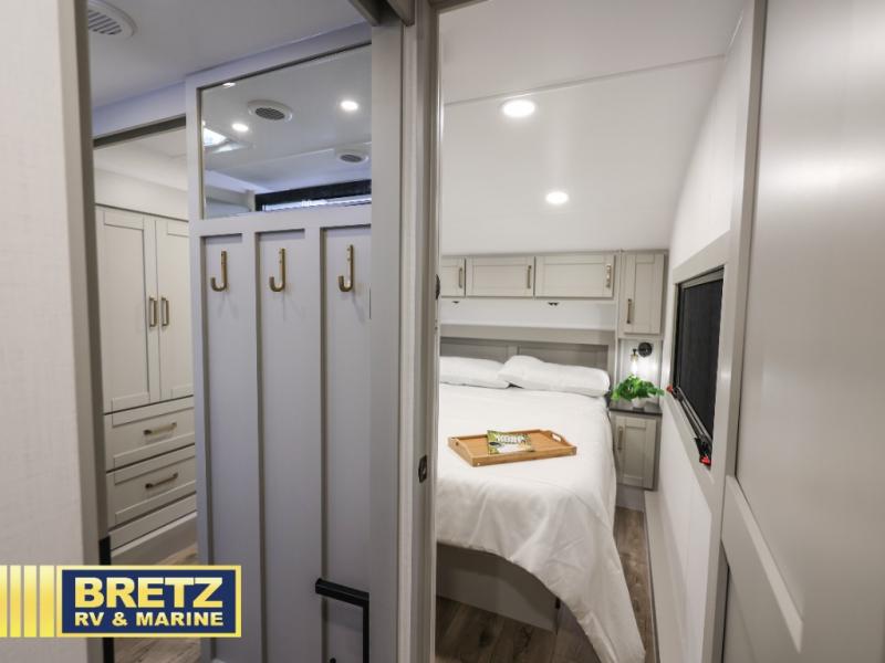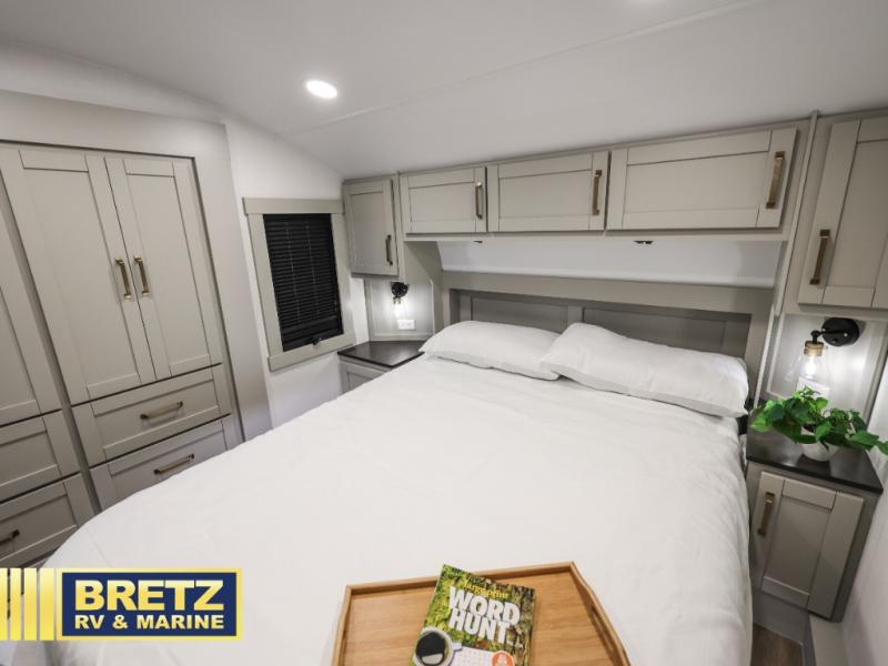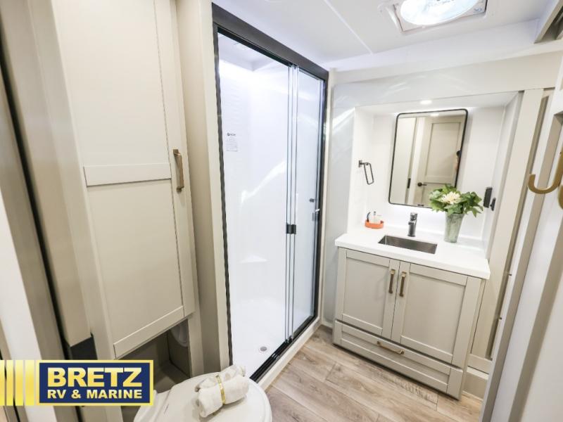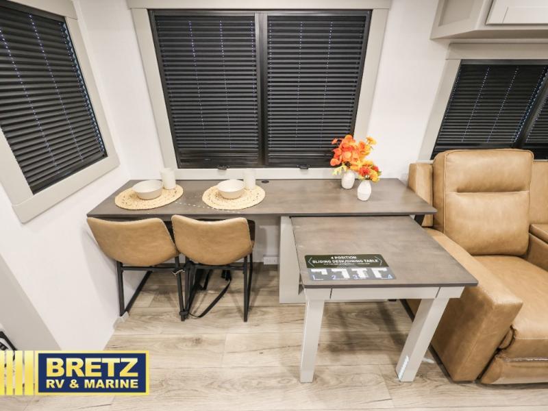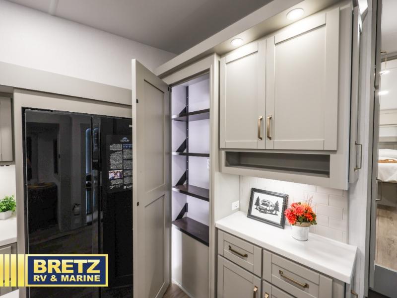 You're going to love every minute spent in this spacious fifth wheel that can sleep four. There is an inviting rear living area with a 72" tri-fold sofa and theater seating across from the televator and fireplace. The chef of your group can whip up dinner on the three burner cooktop or in the 30" residential microwave, and there is a 16 cu. ft. refrigerator that even opens when with the slide out is in. You will also enjoy the kitchen island with a farmhouse sink and roller cover, dual trash bins with a Stow N' Go paper towel holder, plus convenient dog bowls for your furry friends. You can store all your paper goods and snacks in the 84" pantry with adjustable shelving, and there is a hutch for nice dishes plus shoe storage in this model as well. Head to the front master bedroom where you'll find a queen bed with a TV, a large slide out with a wardrobe with drawers, plus a spacious bath.