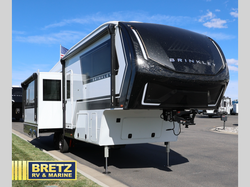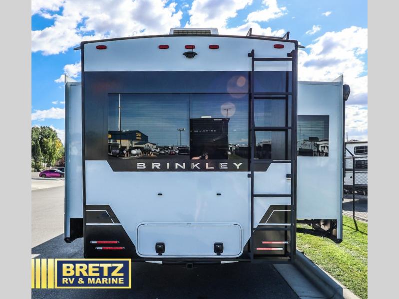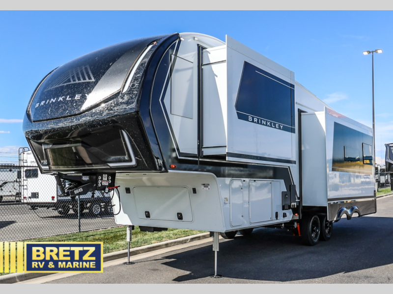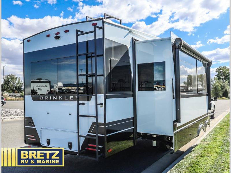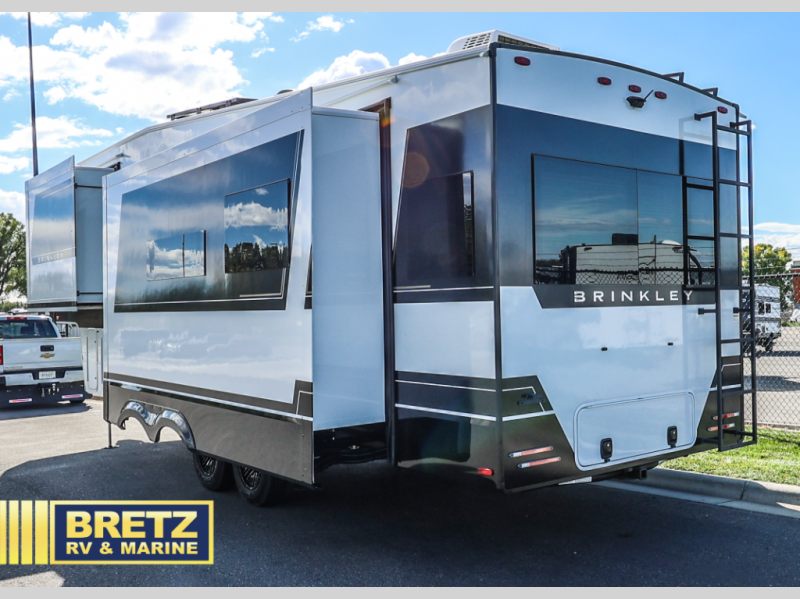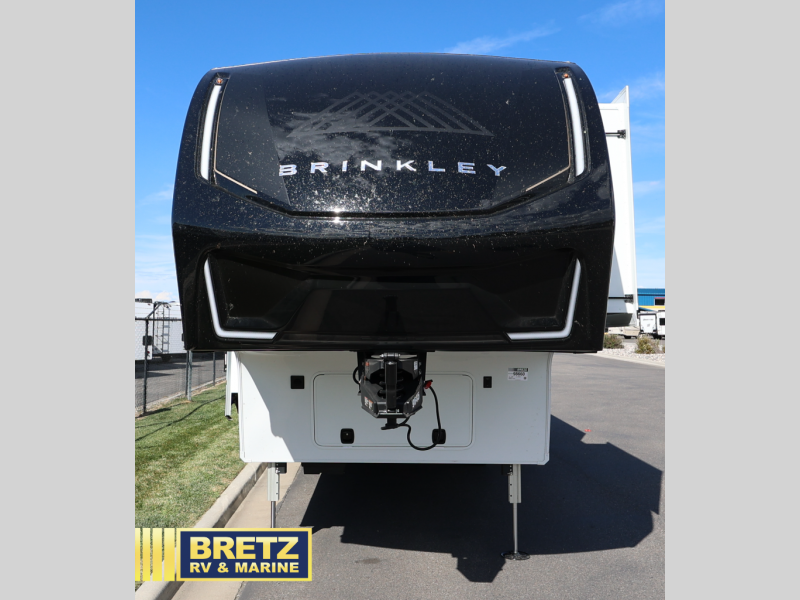 The Brinkley mid-profile Model Z fifth wheels bring you clean lines and an upscale look with plenty of style and exciting new features like the industry first brass plumbing connections. These units also feature an automotive grade front cap, plenty of exterior storage, dual exterior hot and cold showers, and wide stance leveling jacks for easy set up. Residential frameless windows provide a clean look and beautiful views, and ample electrical outlets and USB/USB-C outlets allow all of your electronics and appliances to easily be used and charged.