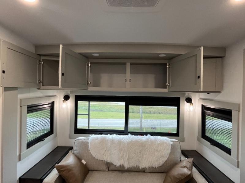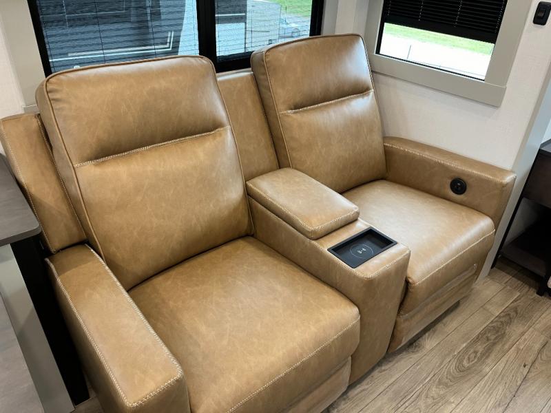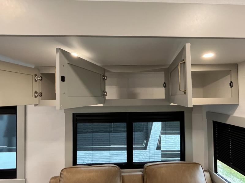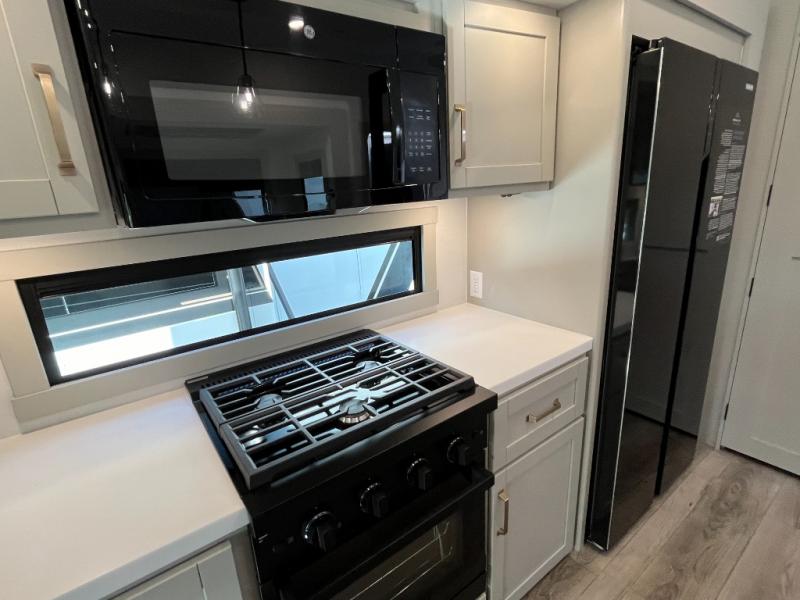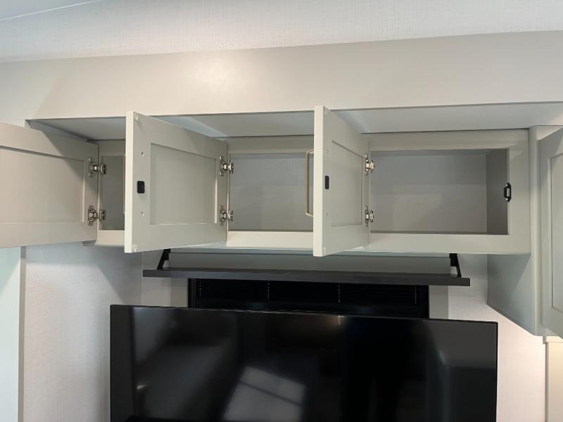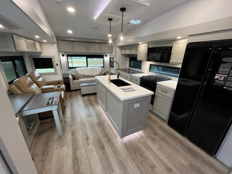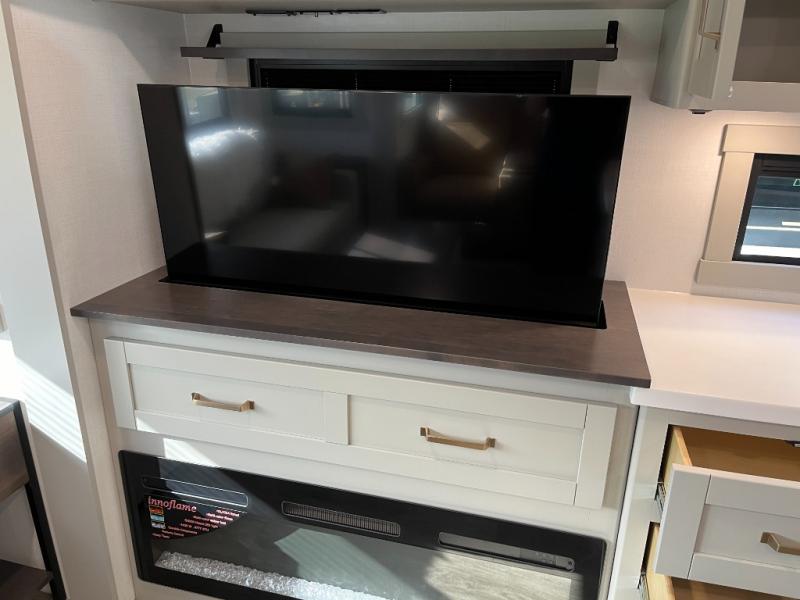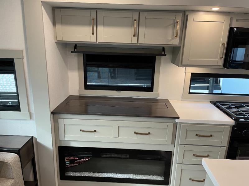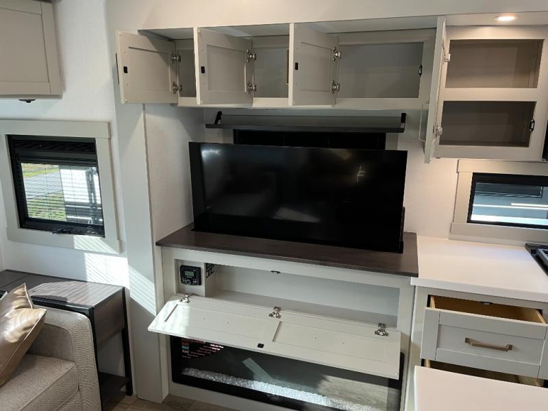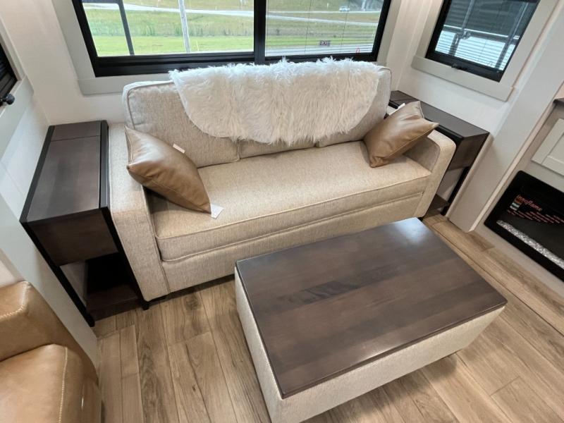 You're going to love every minute spent in this spacious fifth wheel that can sleep four. There is an inviting rear living area with a 72" tri-fold sofa and theater seating across from the televator and fireplace. The chef of your group can whip up dinner on the three burner cooktop or in the 30" residential microwave, and there is a 16 cu. ft. refrigerator that even opens when with the slide out is in. You will also enjoy the kitchen island with a farmhouse sink and roller cover, dual trash bins with a Stow N' Go paper towel holder, plus convenient dog bowls for your furry friends. You can store all your paper goods and snacks in the 84" pantry with adjustable shelving, and there is a hutch for nice dishes plus shoe storage in this model as well. Head to the front master bedroom where you'll find a queen bed with a TV, a large slide out with a wardrobe with drawers, plus a spacious bath.