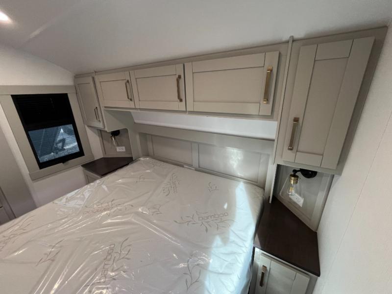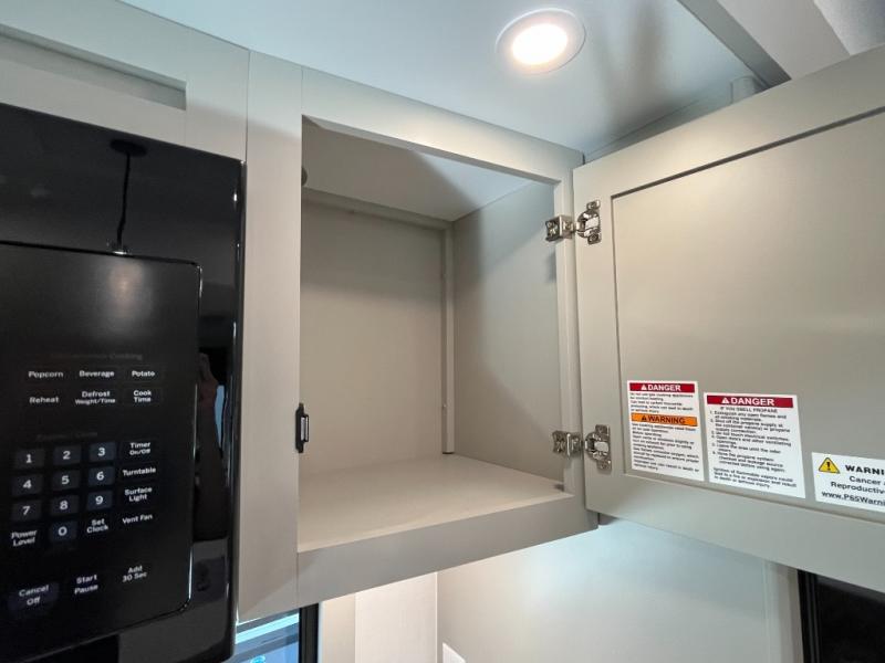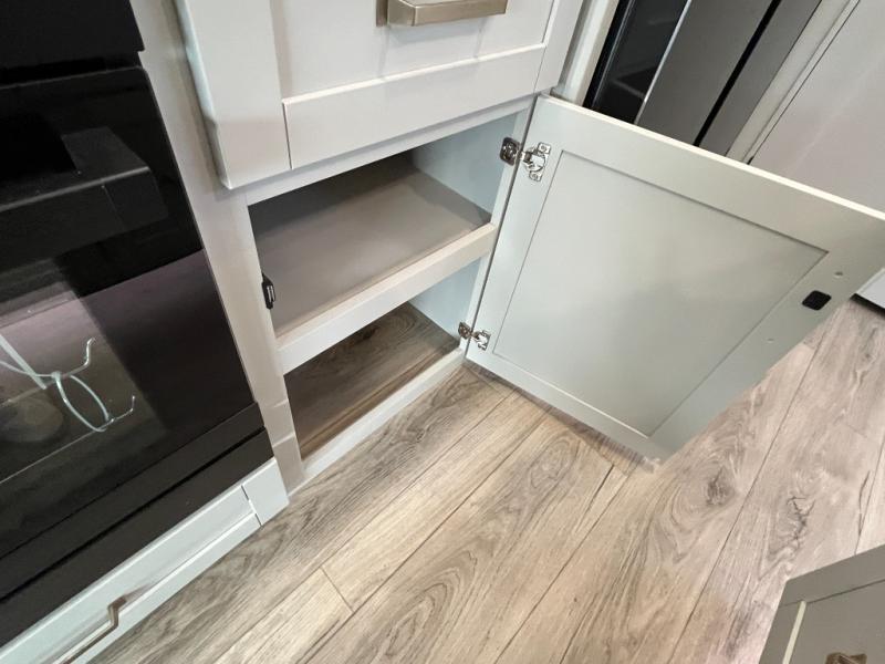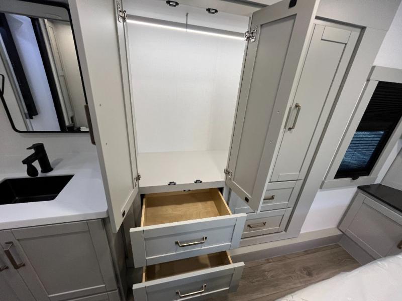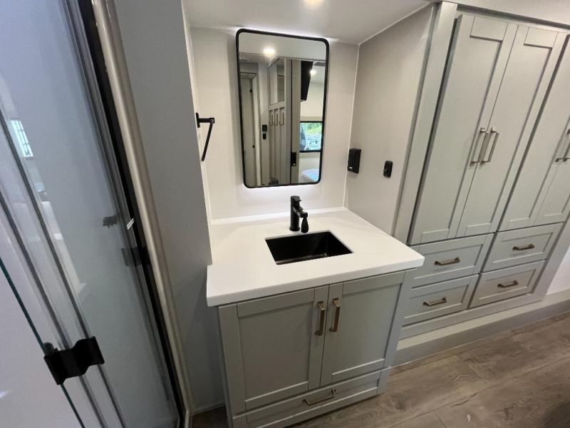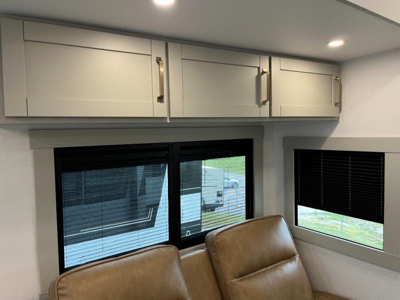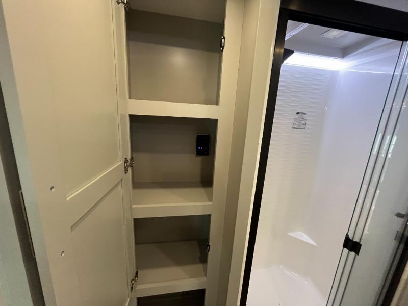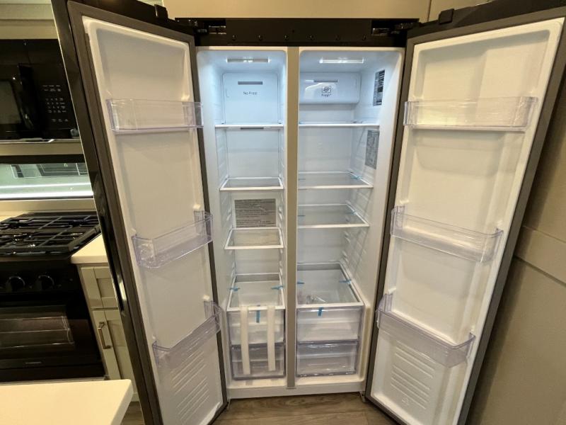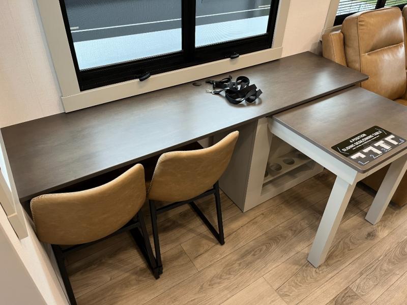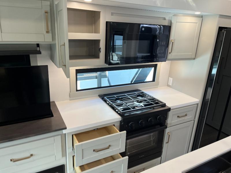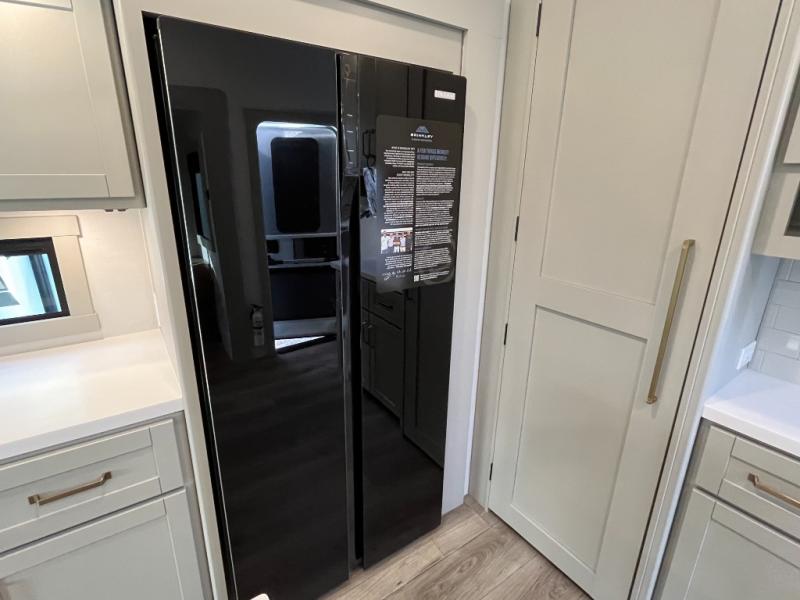 You're going to love every minute spent in this spacious fifth wheel that can sleep four. There is an inviting rear living area with a 72" tri-fold sofa and theater seating across from the televator and fireplace. The chef of your group can whip up dinner on the three burner cooktop or in the 30" residential microwave, and there is a 16 cu. ft. refrigerator that even opens when with the slide out is in. You will also enjoy the kitchen island with a farmhouse sink and roller cover, dual trash bins with a Stow N' Go paper towel holder, plus convenient dog bowls for your furry friends. You can store all your paper goods and snacks in the 84" pantry with adjustable shelving, and there is a hutch for nice dishes plus shoe storage in this model as well. Head to the front master bedroom where you'll find a queen bed with a TV, a large slide out with a wardrobe with drawers, plus a spacious bath.