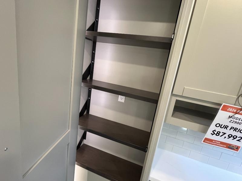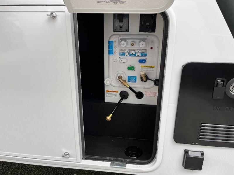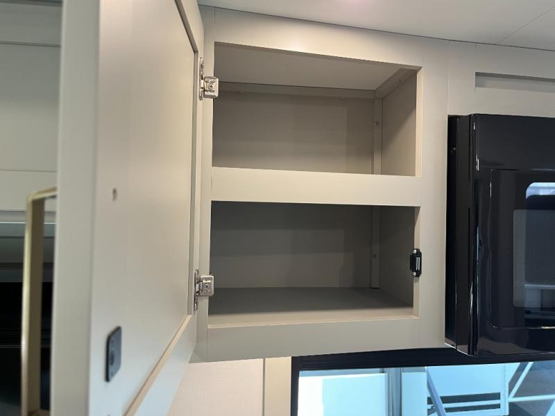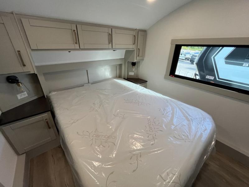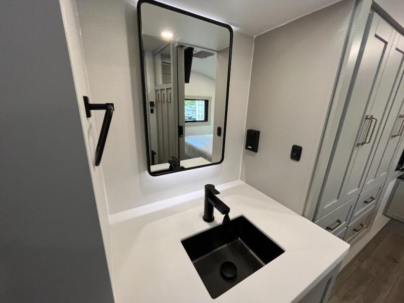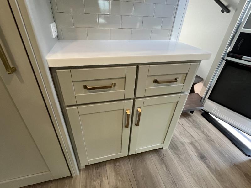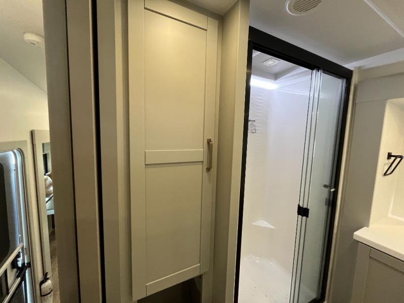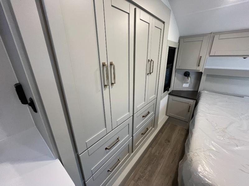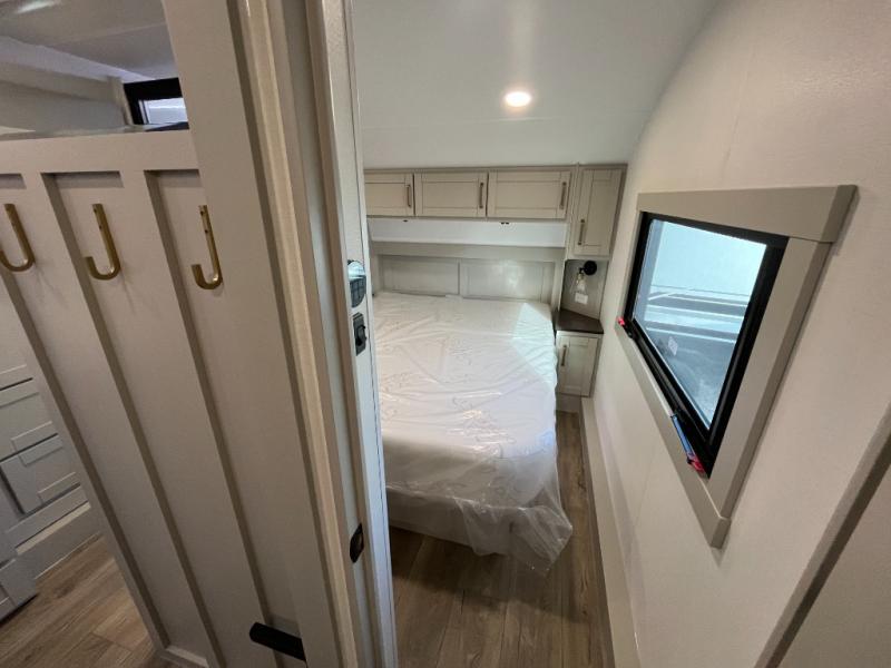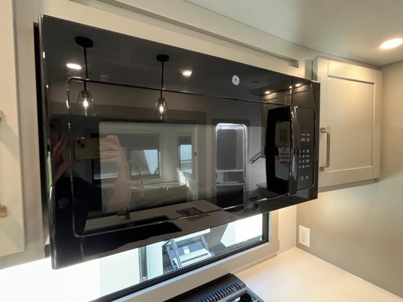 You're going to love every minute spent in this spacious fifth wheel that can sleep four. There is an inviting rear living area with a 72" tri-fold sofa and theater seating across from the televator and fireplace. The chef of your group can whip up dinner on the three burner cooktop or in the 30" residential microwave, and there is a 16 cu. ft. refrigerator that even opens when with the slide out is in. You will also enjoy the kitchen island with a farmhouse sink and roller cover, dual trash bins with a Stow N' Go paper towel holder, plus convenient dog bowls for your furry friends. You can store all your paper goods and snacks in the 84" pantry with adjustable shelving, and there is a hutch for nice dishes plus shoe storage in this model as well. Head to the front master bedroom where you'll find a queen bed with a TV, a large slide out with a wardrobe with drawers, plus a spacious bath.